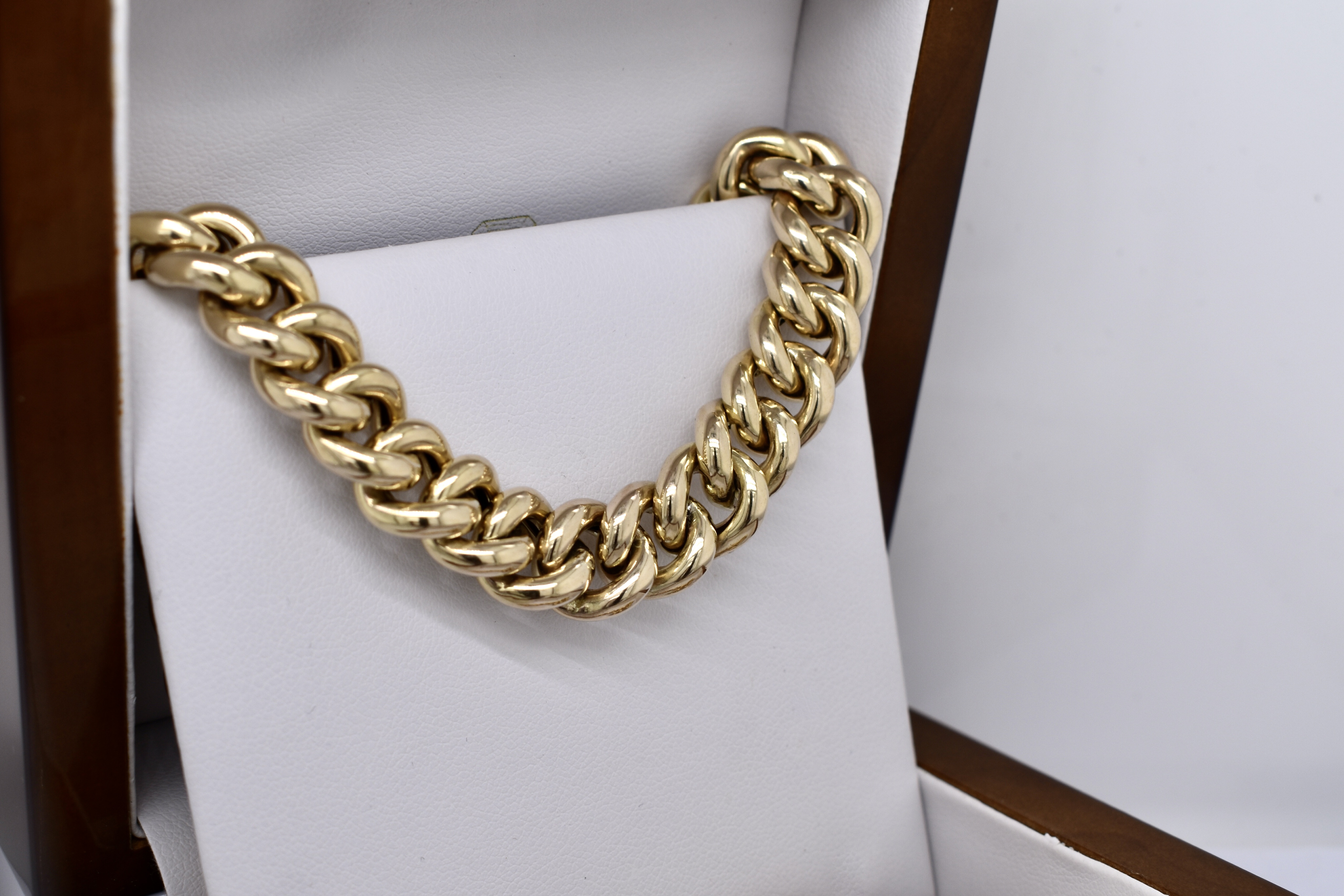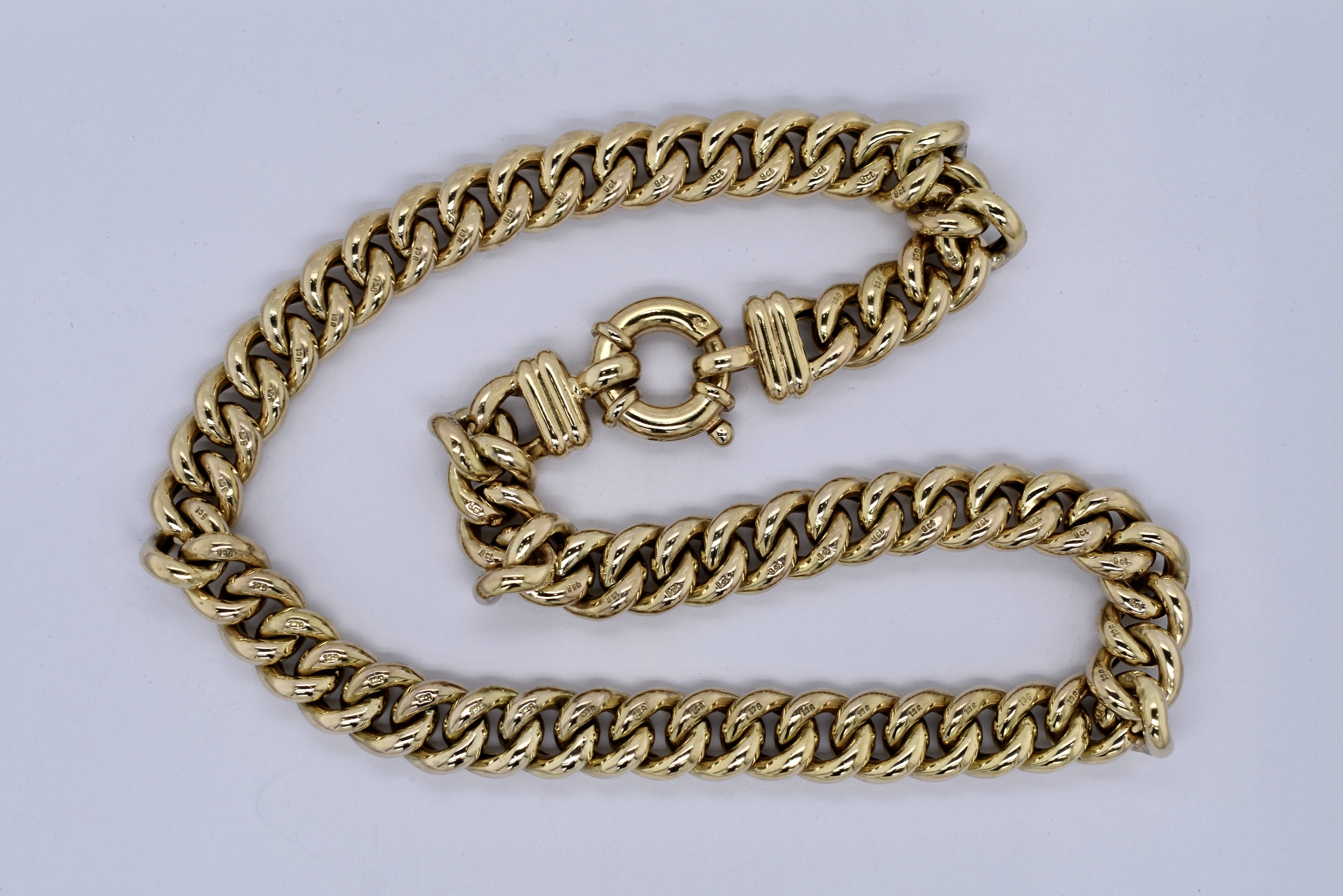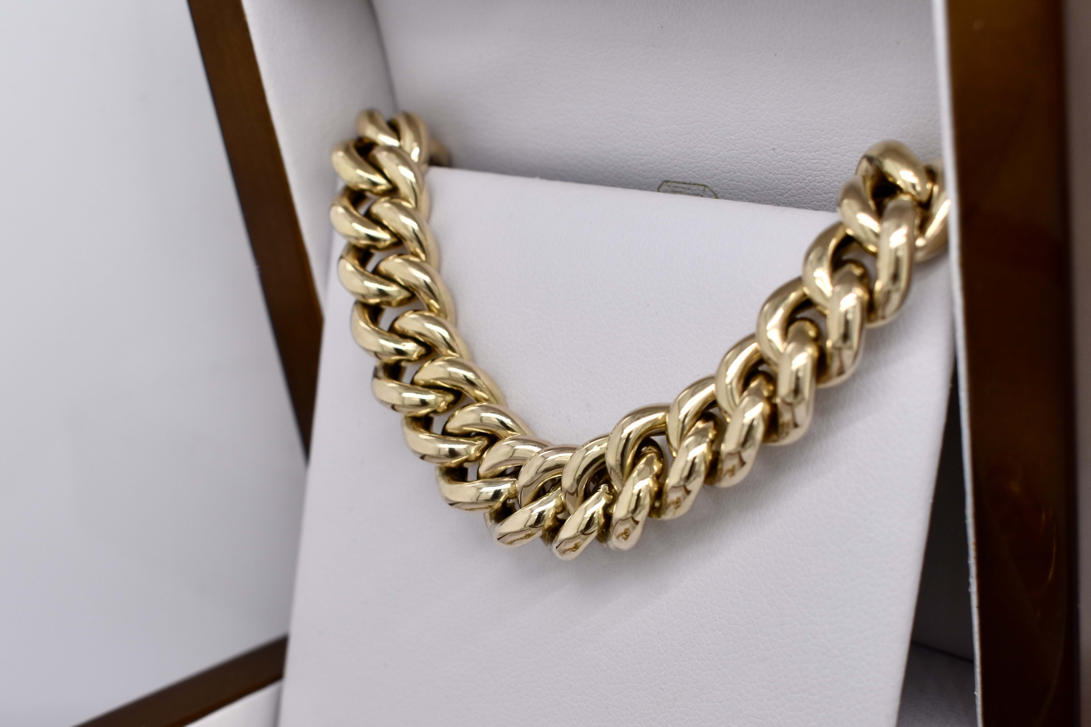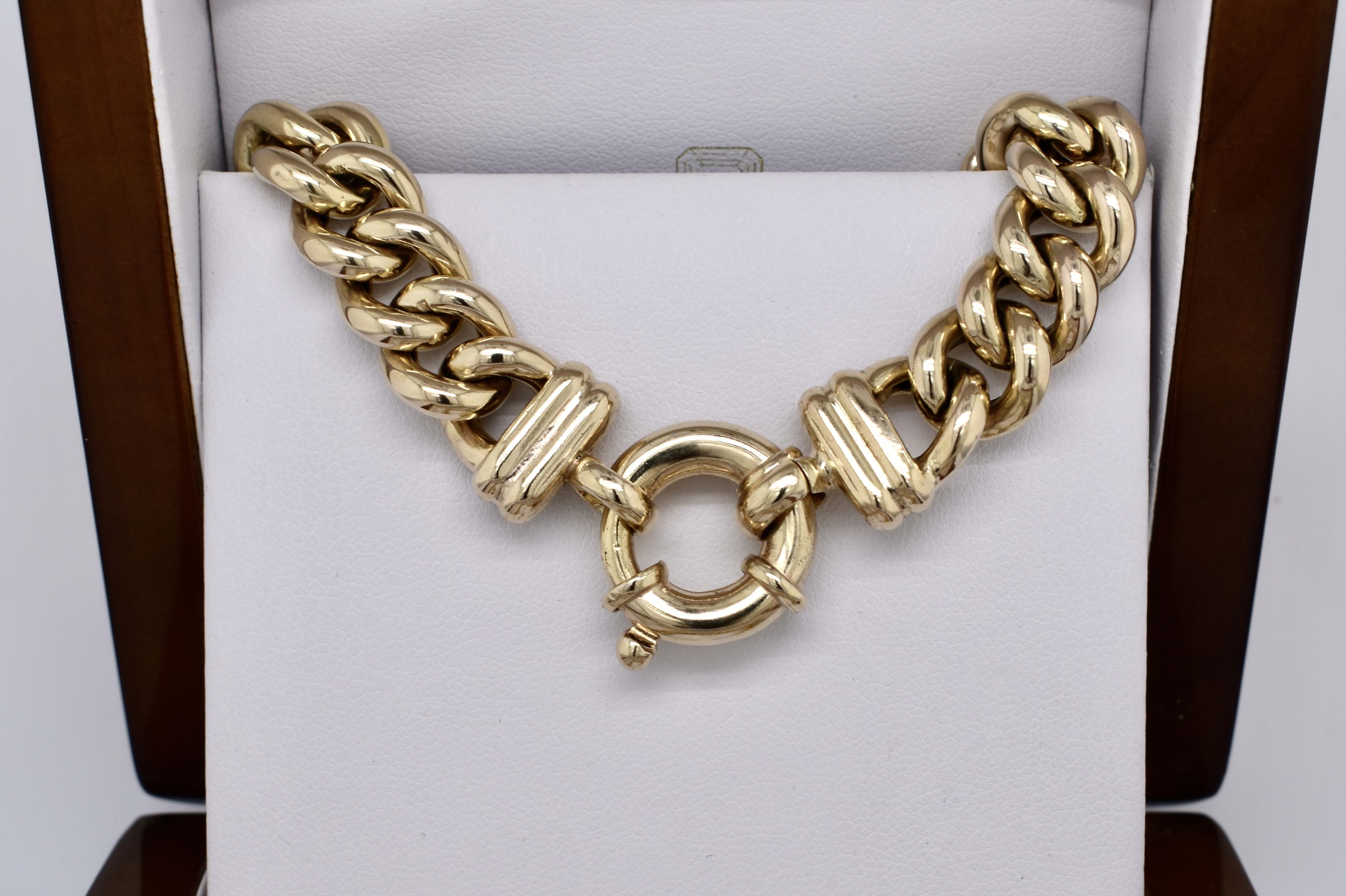 A classic 9ct yellow gold hollow curb link chain, measuring 10mm wide and 45cm long. Completed with a gold bolt ring clasp and end finials. Weighing 72.65 grams. Independent Valuation available upon purchase.