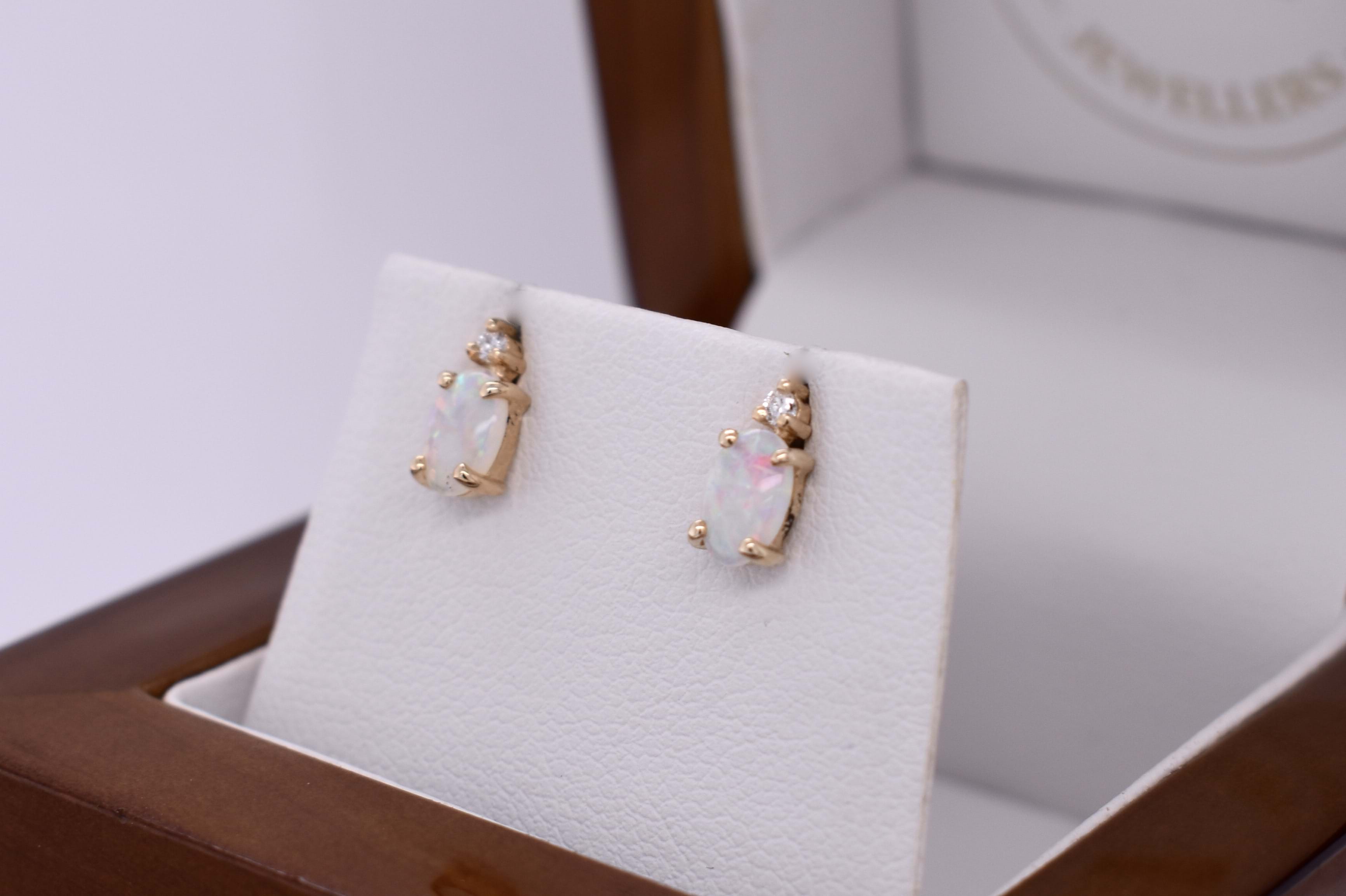 Simple yet sparkly, these eye-catching studs feature amazing, oval shaped white coober pedy opals, four claw set into a simple 9ct yellow gold setting. The opals show vibrant flashes of red, orange and purple throughout, and are complimented by a sparkly 3 claw set 1.5mm diamond above each stud. Finished with a post and butterfly fittings.