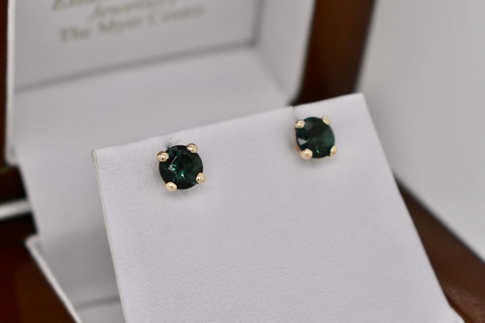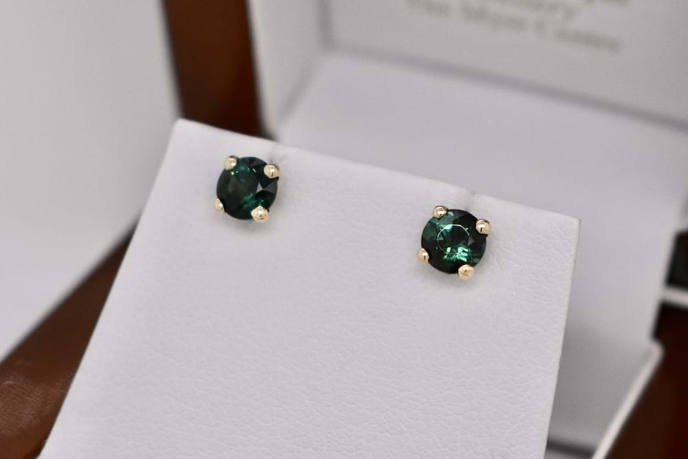 Handmade four claw 9ct yellow gold studs with posts and butterfly fittings featuring 5.8mm faceted green tourmalines