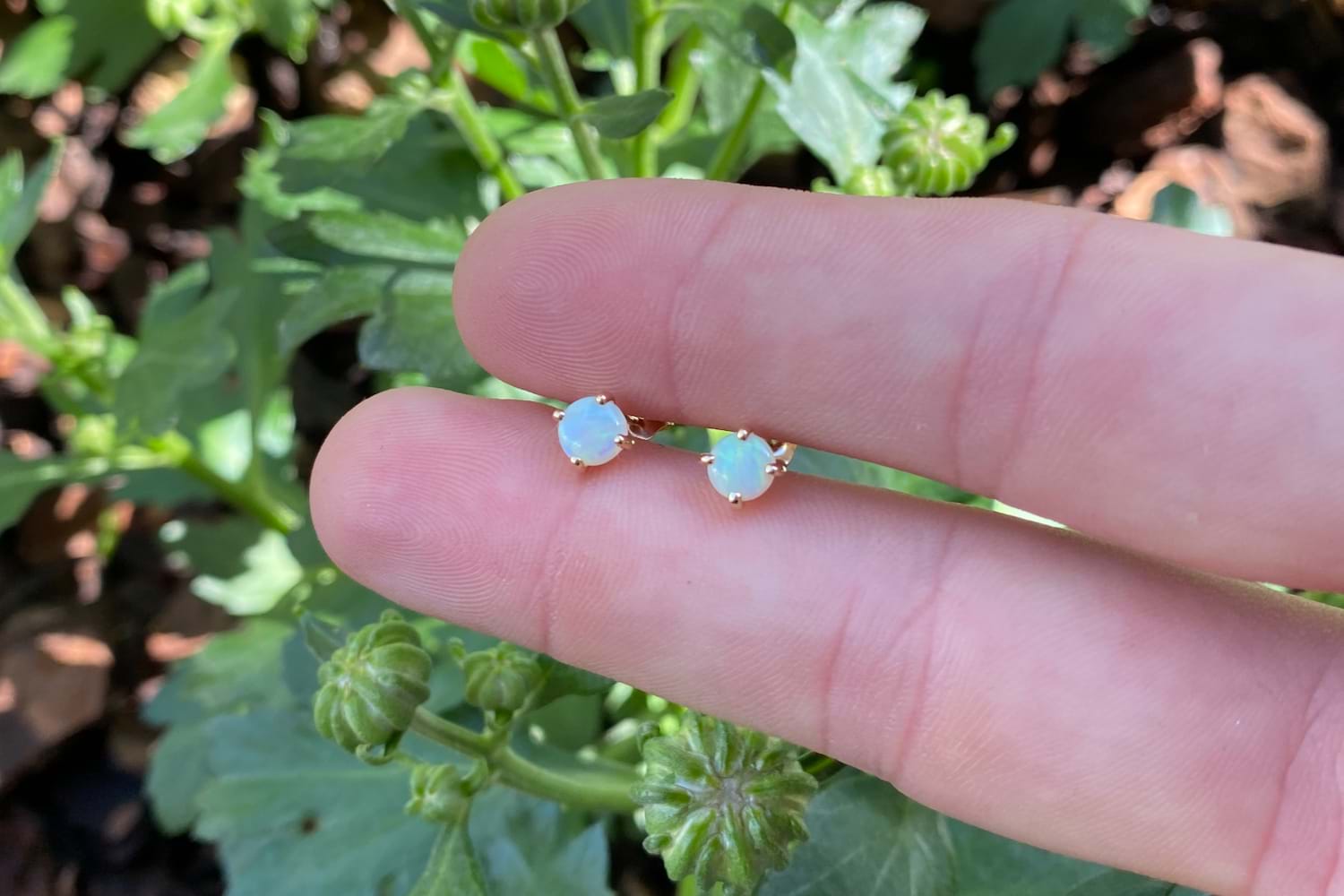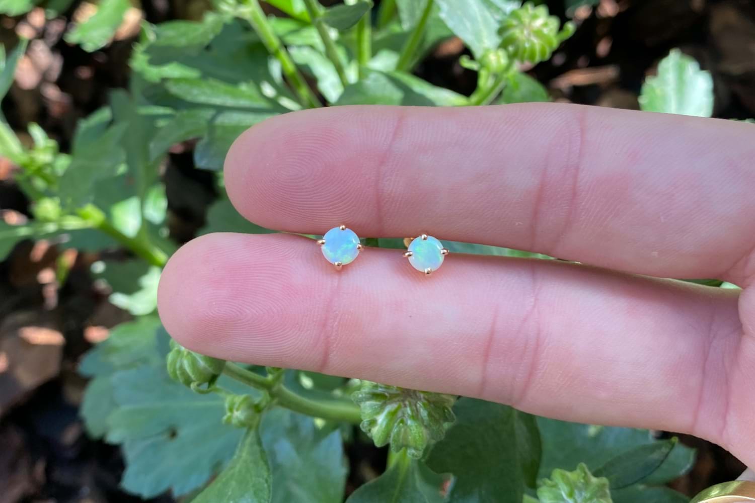 These pearlescent studs feature two gorgeous 5mm white body opals, four claw set into 9ct yellow gold. The opal shows flashes of green and orange throughout. Finished with an elevated clipped post and butterfly fitting.