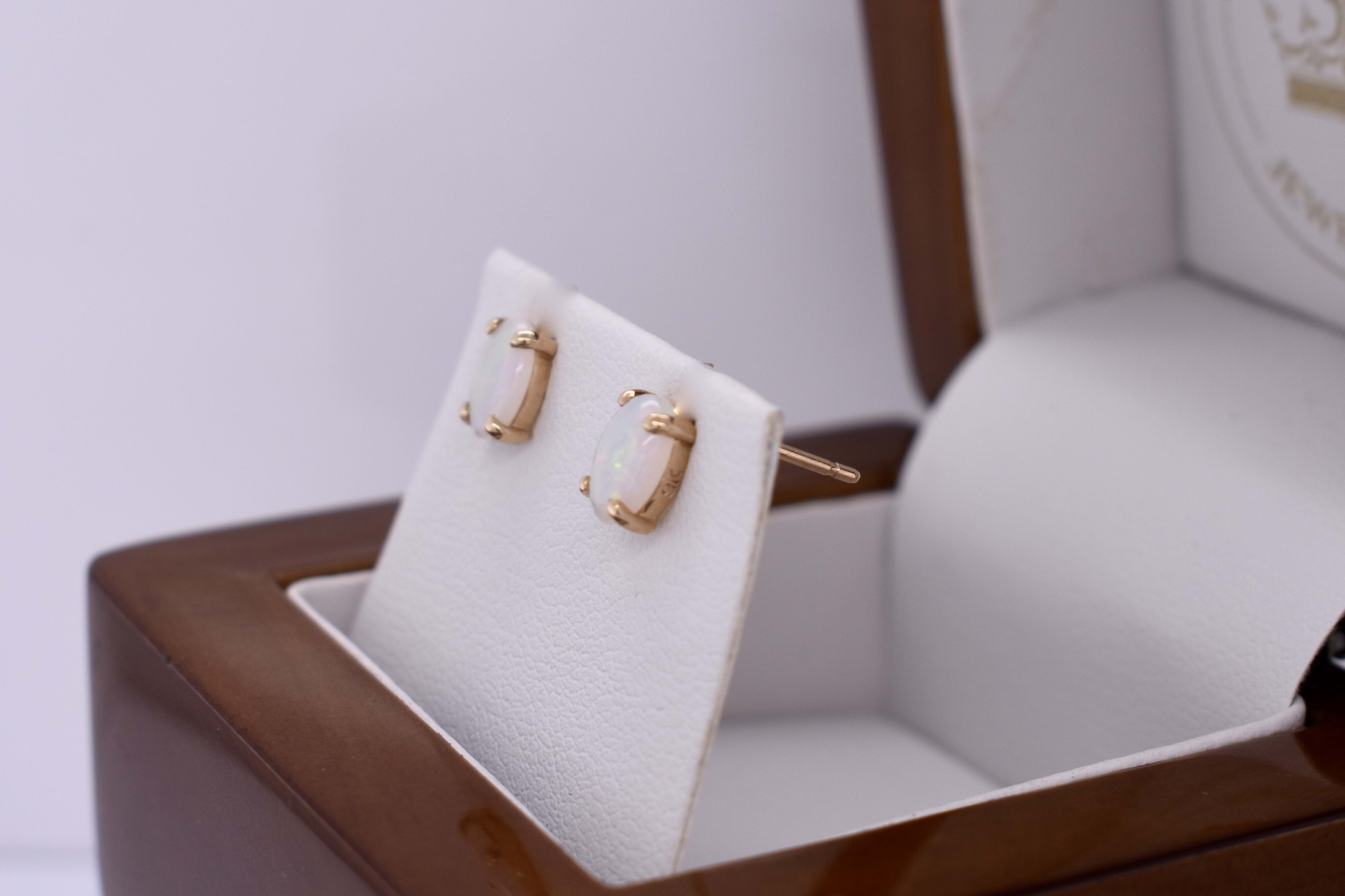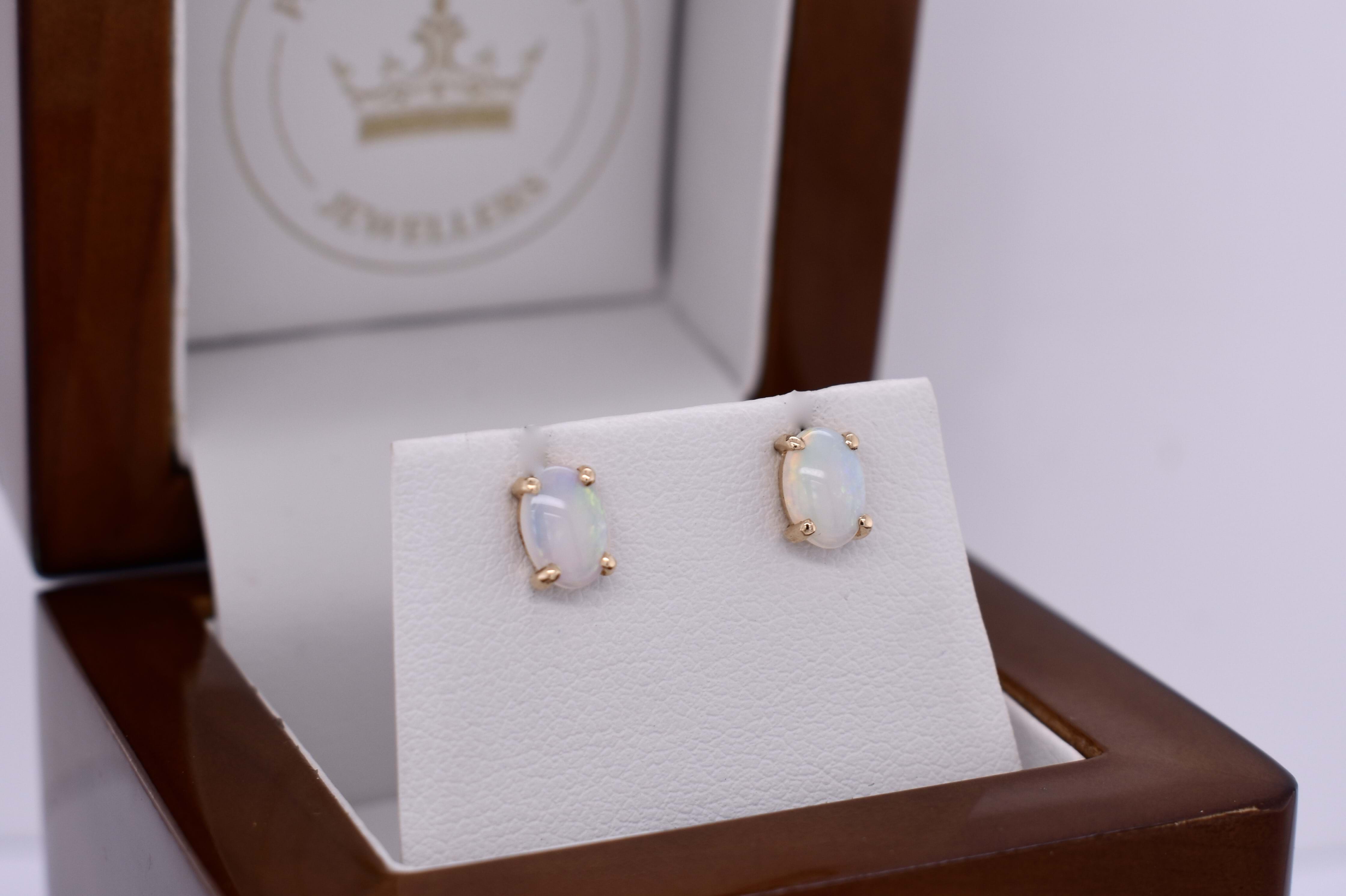 Gorgeous and simple, these studs feature two oval shaped, crystal coober pedy opals measuring approx. 6.8x4.9mm, four claw set into 9ct yellow gold. With every movement they flash vibrant colours of green throughout. Finished with a post and butterfly fittings.