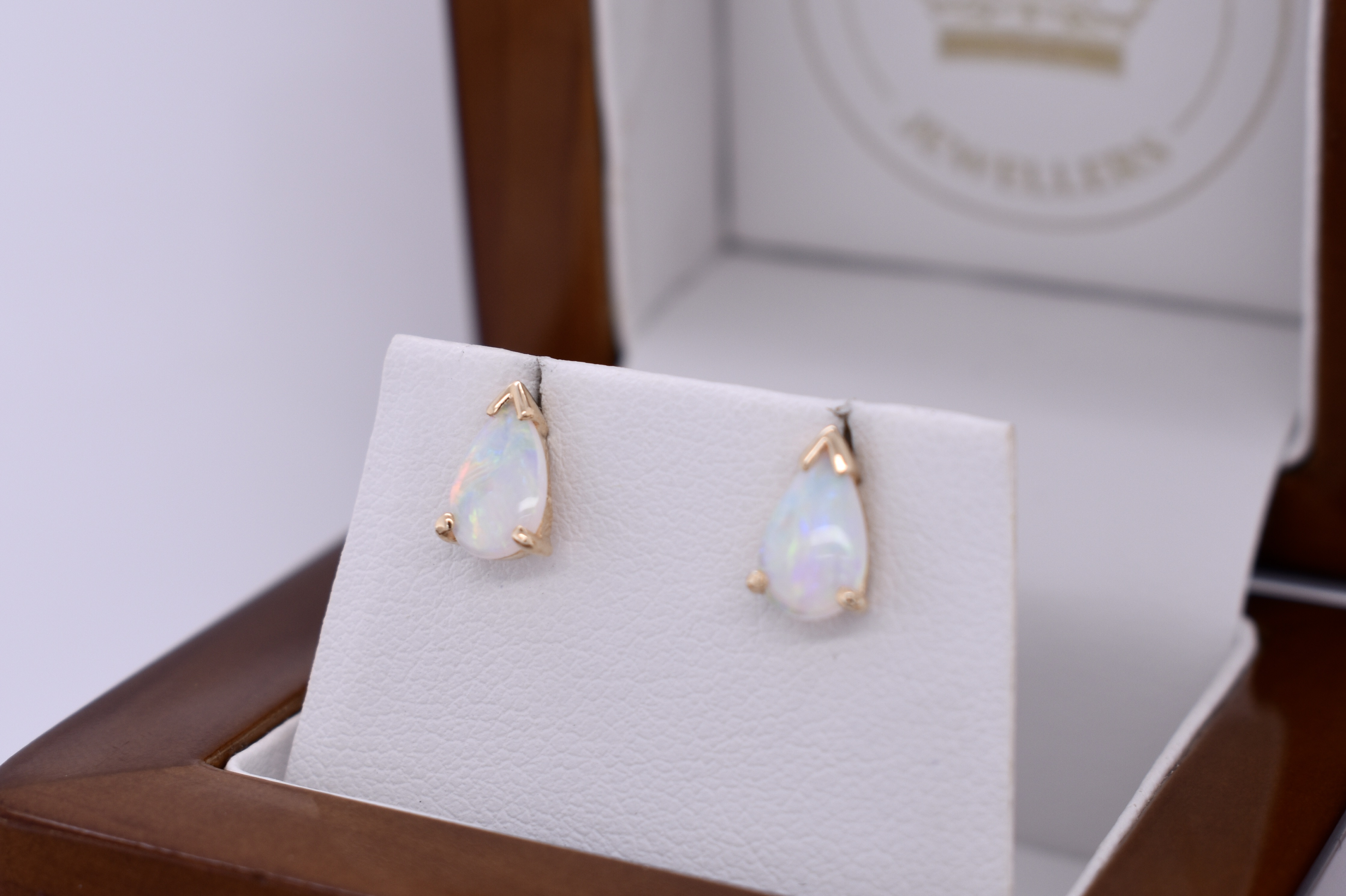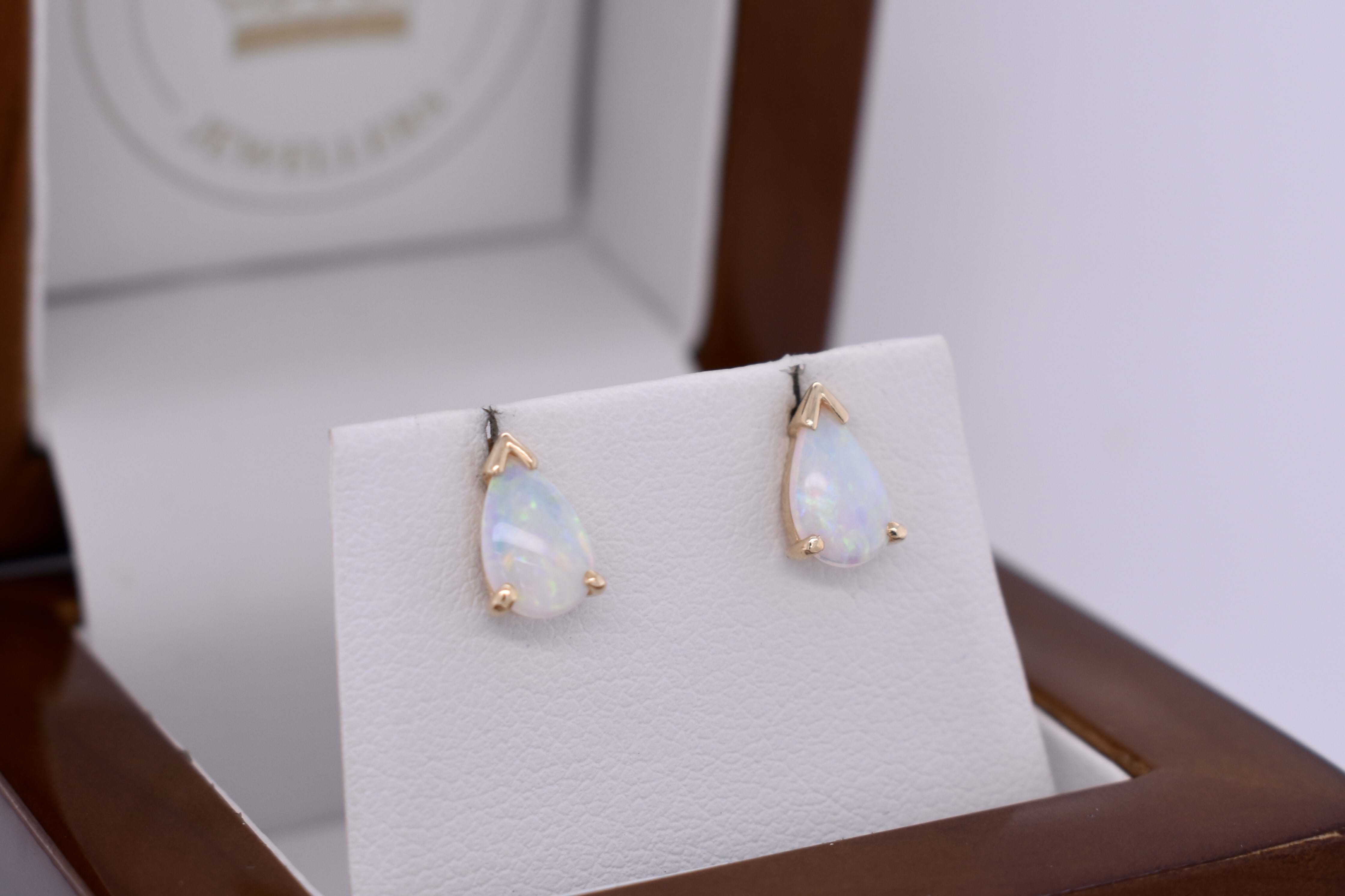 Two claw & cap set in 9ct yellow gold, these lustrous pearshaped crystal coober pedy opals measure approx. 7.6x5.2mm, showing stunning flashes of green and blue with every movement. Finished with a post and butterfly fittings.
