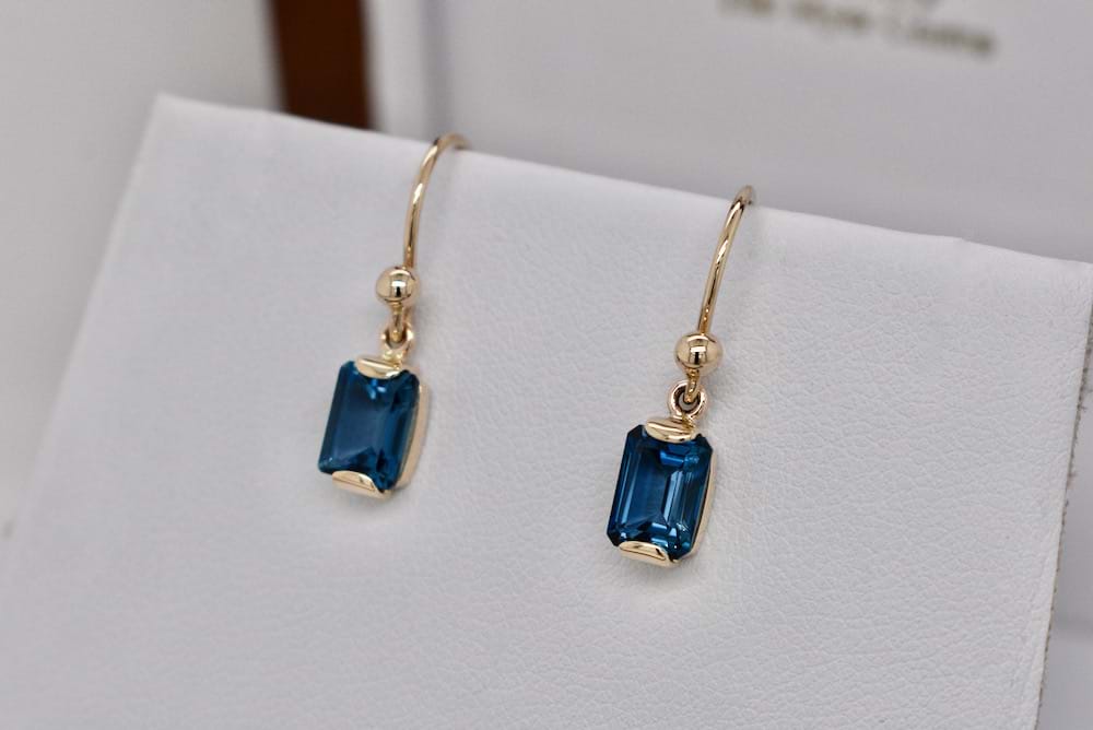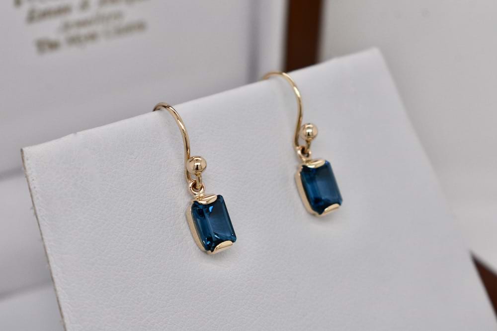 Elegant and stunning these emerald cut London blue topaz measure 7x5mm and have been set into handmade semi-bezel settings and suspended from shepherd hook fittings