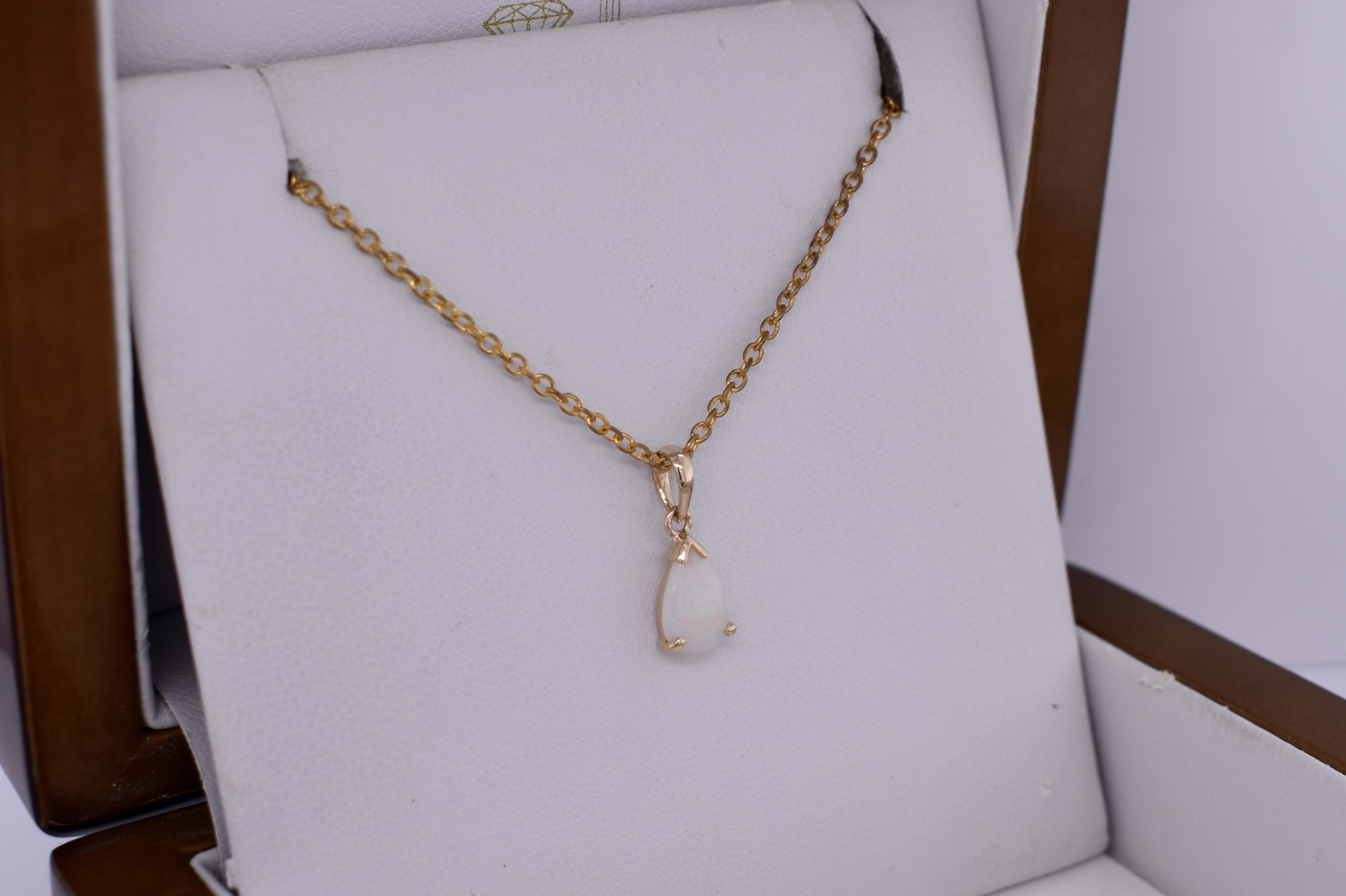 This cute pendant features a lustrous, white coober pedy opal measuring approx. 8.5x6.4mm, 2 claw and cap set into 9ct yellow gold. The opal flashes green, red and orange with every movement. Finished with a plain bale. Chains are available for separate purchase.