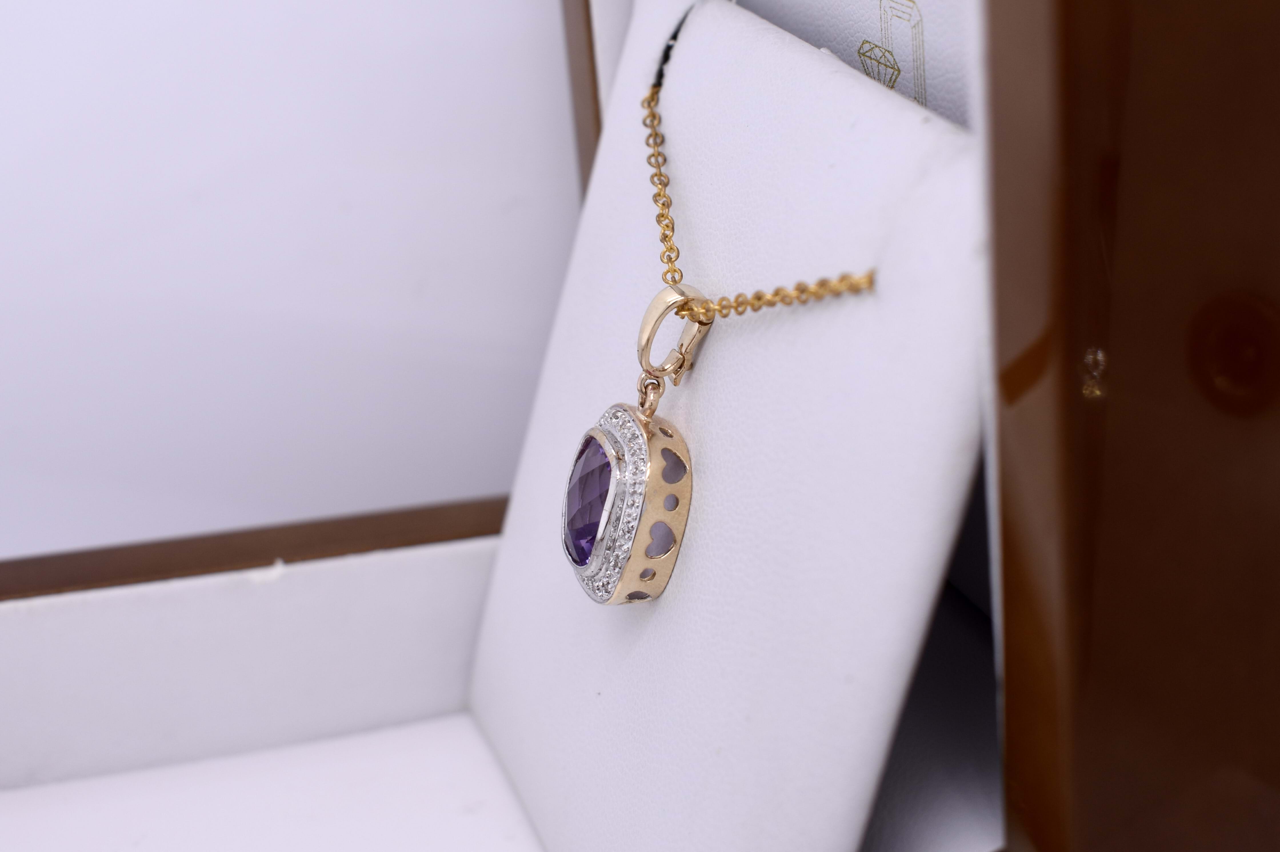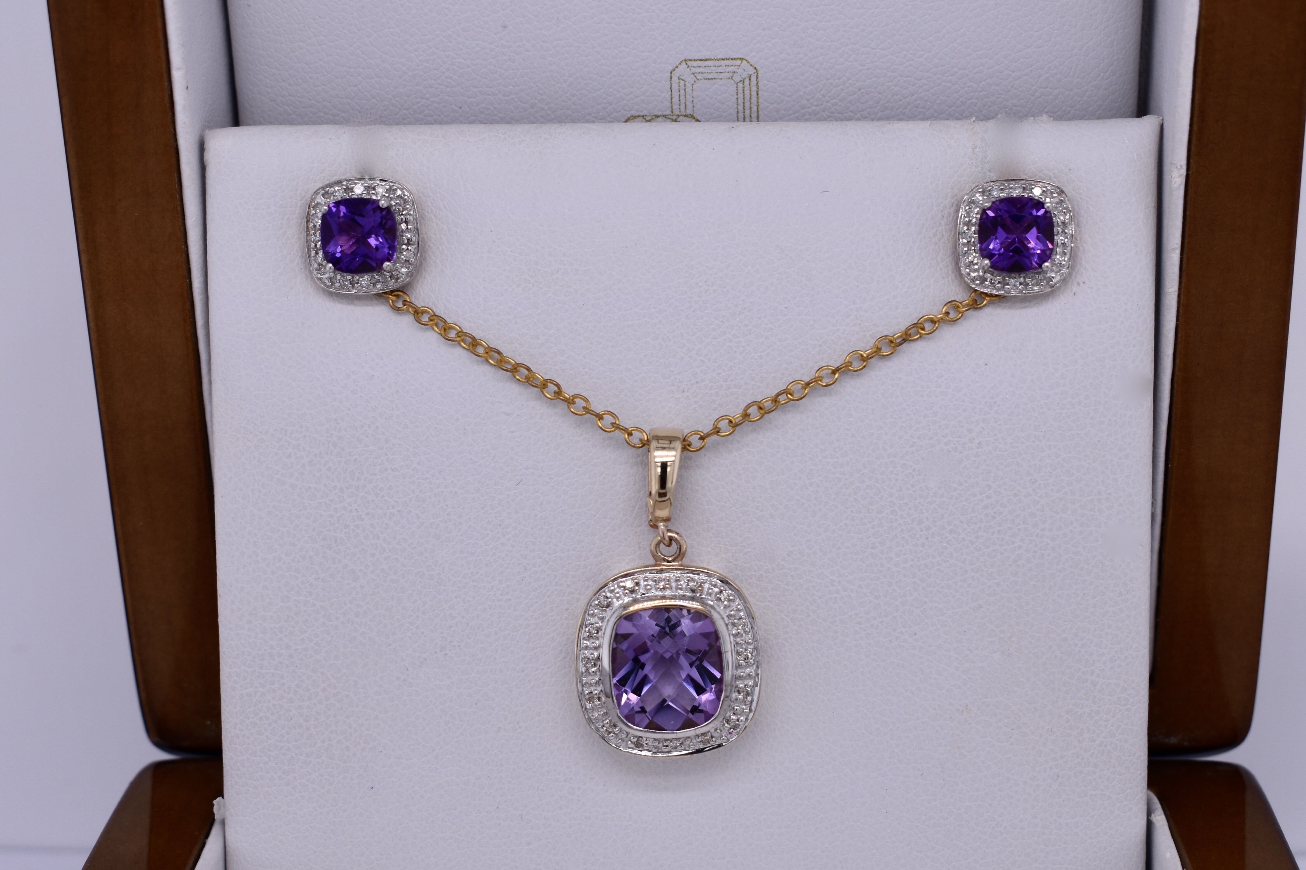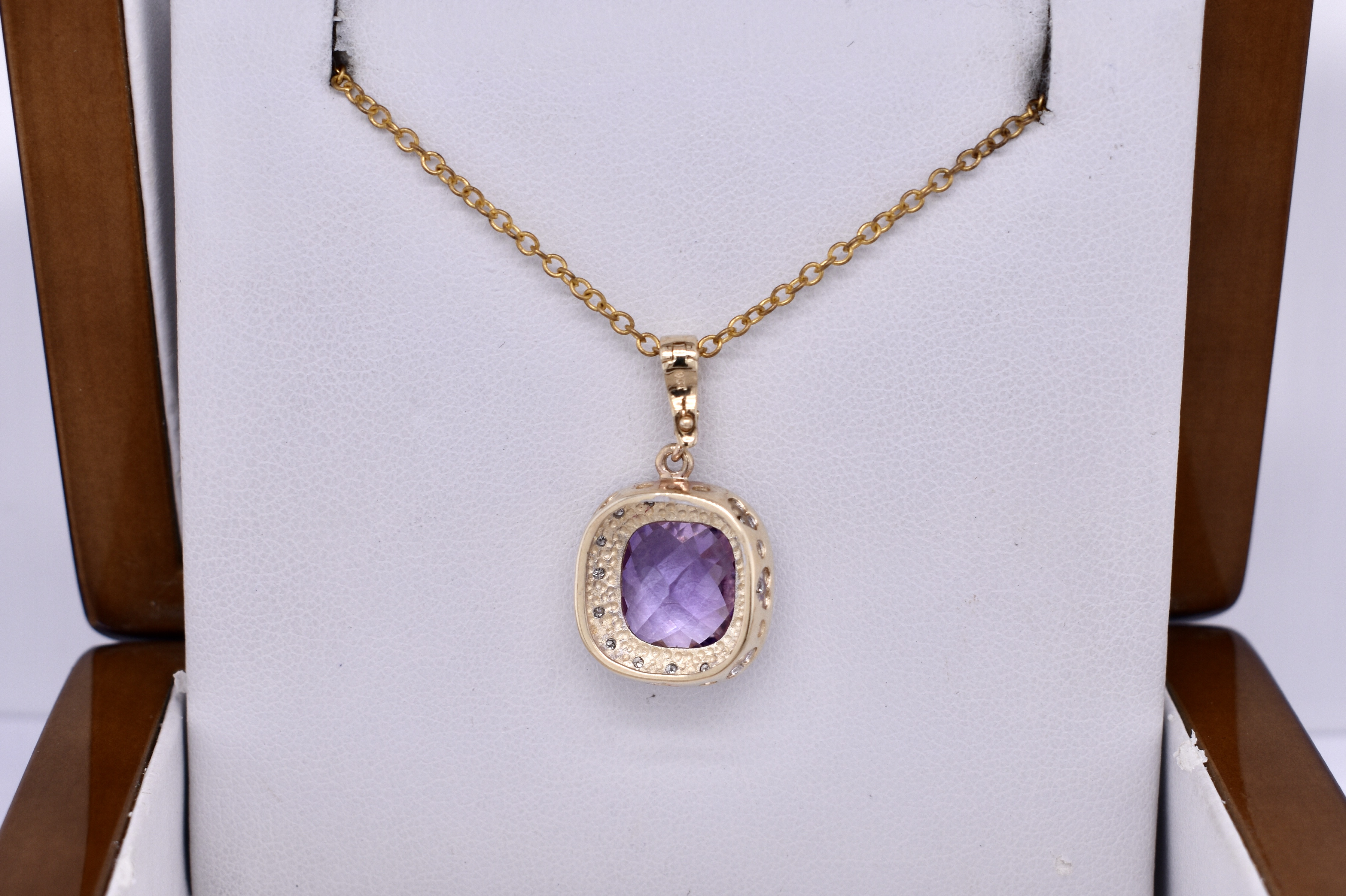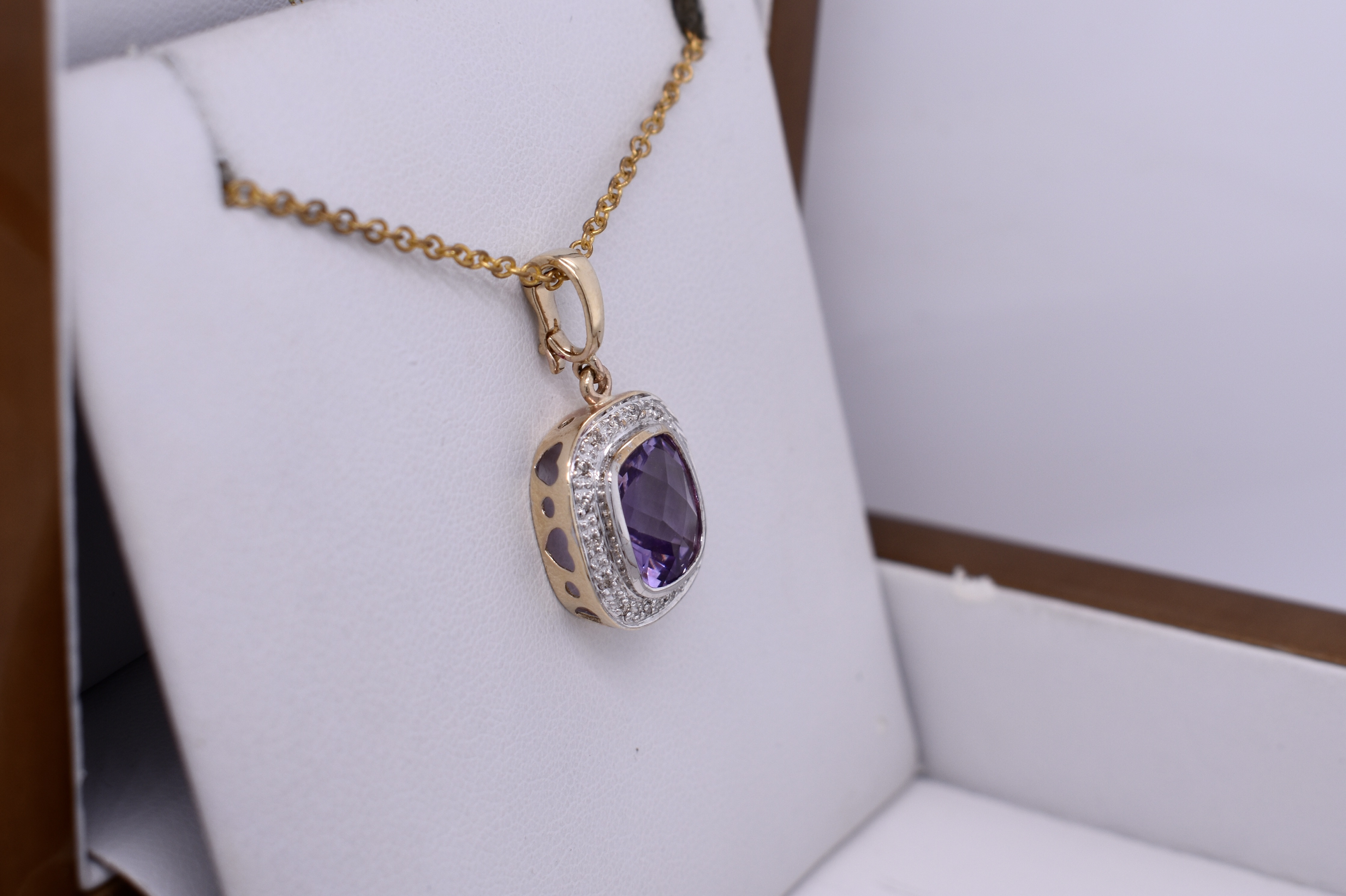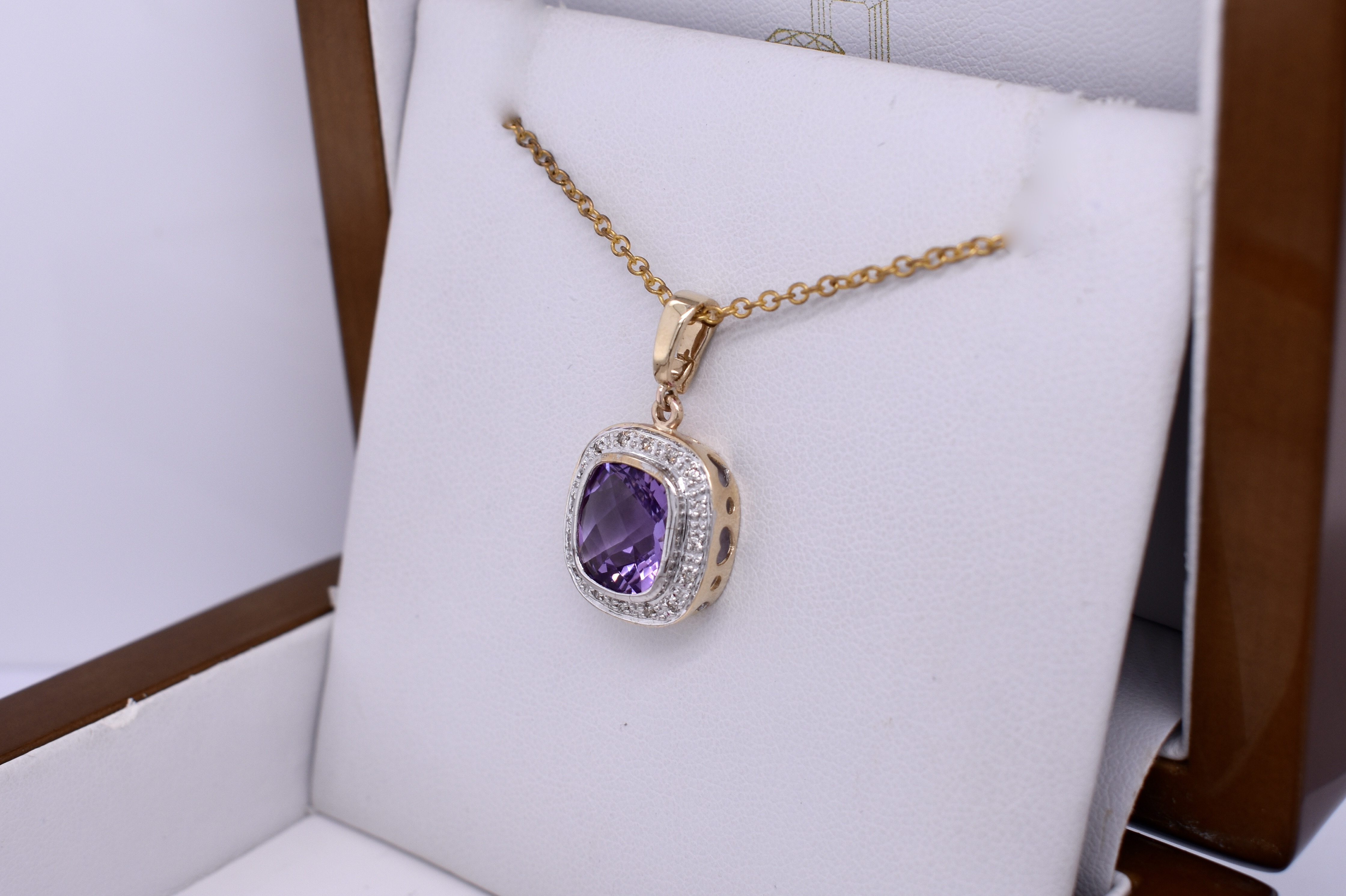 This gorgeous enhancer pendant features a pretty cushion cut amethyst measuring approx. 9mm, bezel set into 9ct yellow gold. The amethyst is surrounded by an illusion halo of grain set diamonds. Finished with a plain enhancer bale. Chains are available for separate purchase. Matching earrings 20397272.