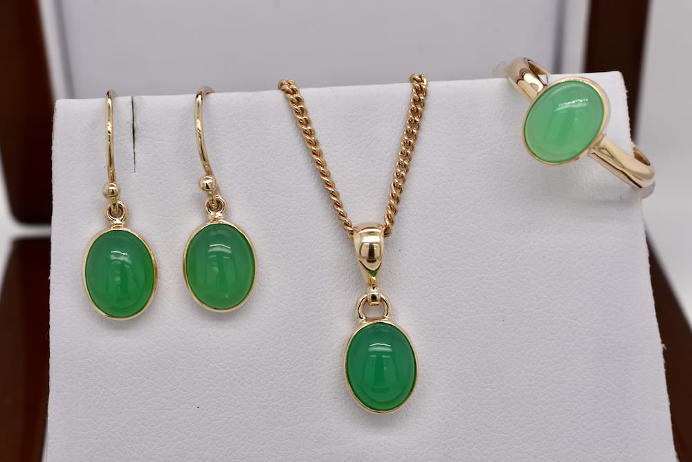 9ct yellow gold handmade dress ring bezel set with a 9.5x7.5mm oval cabochon apple green chrysoprase. Matching pendant 20299385 & earrrings 20299361 are available purchase