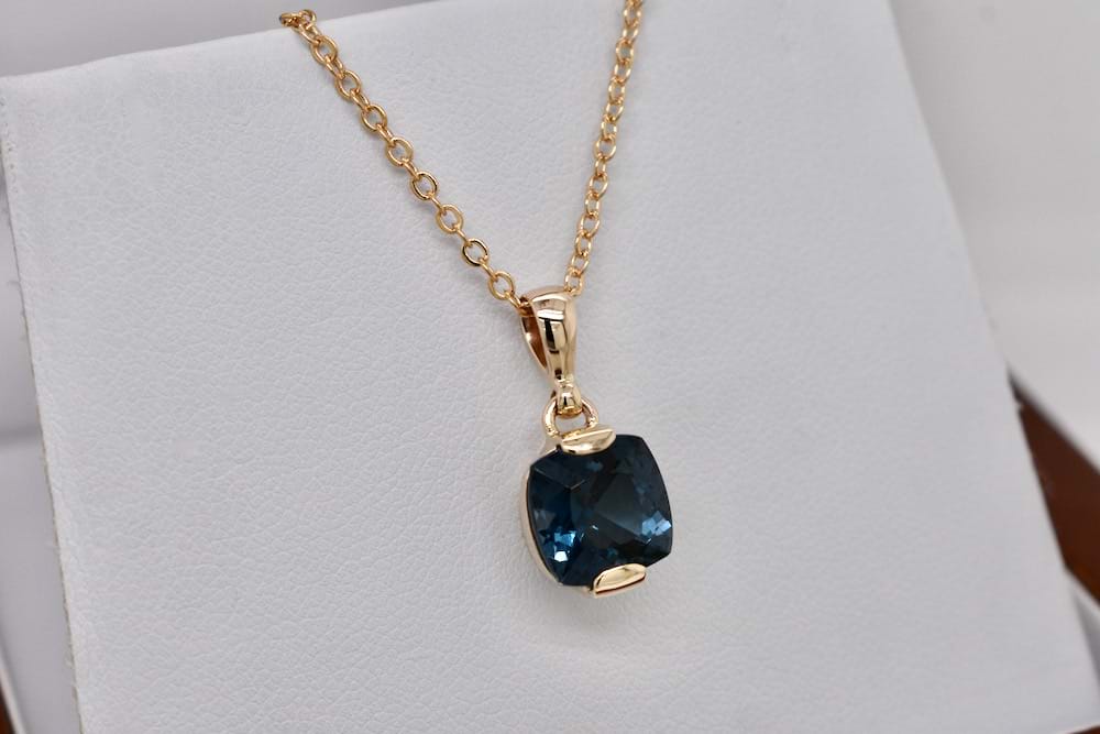 Beautiful cushion cut London blue topaz measuring 9mm set into handmade 9ct rose gold semi-bezel setting and suspended from a plain bale loop. Chains are available for separate purchase