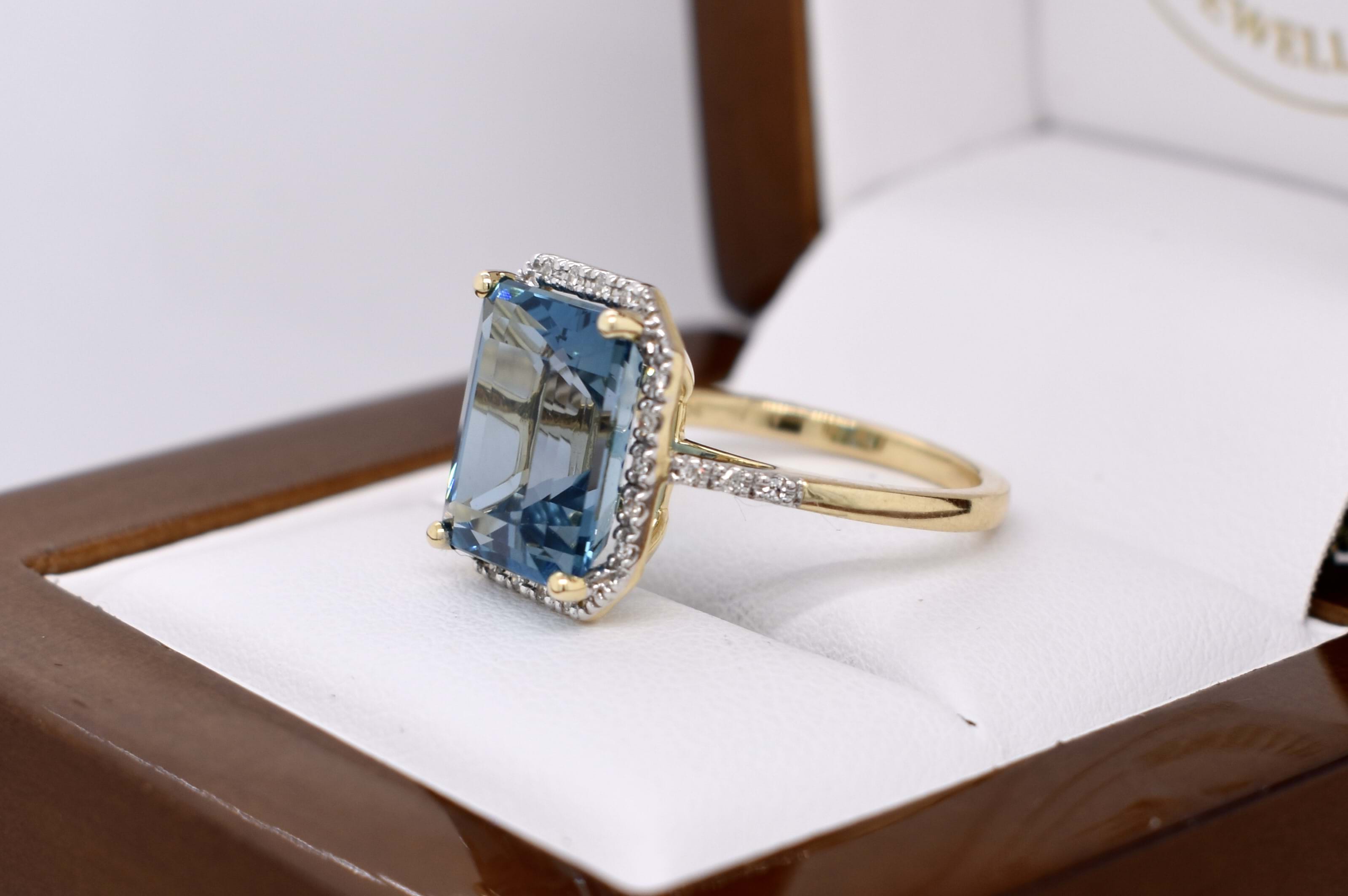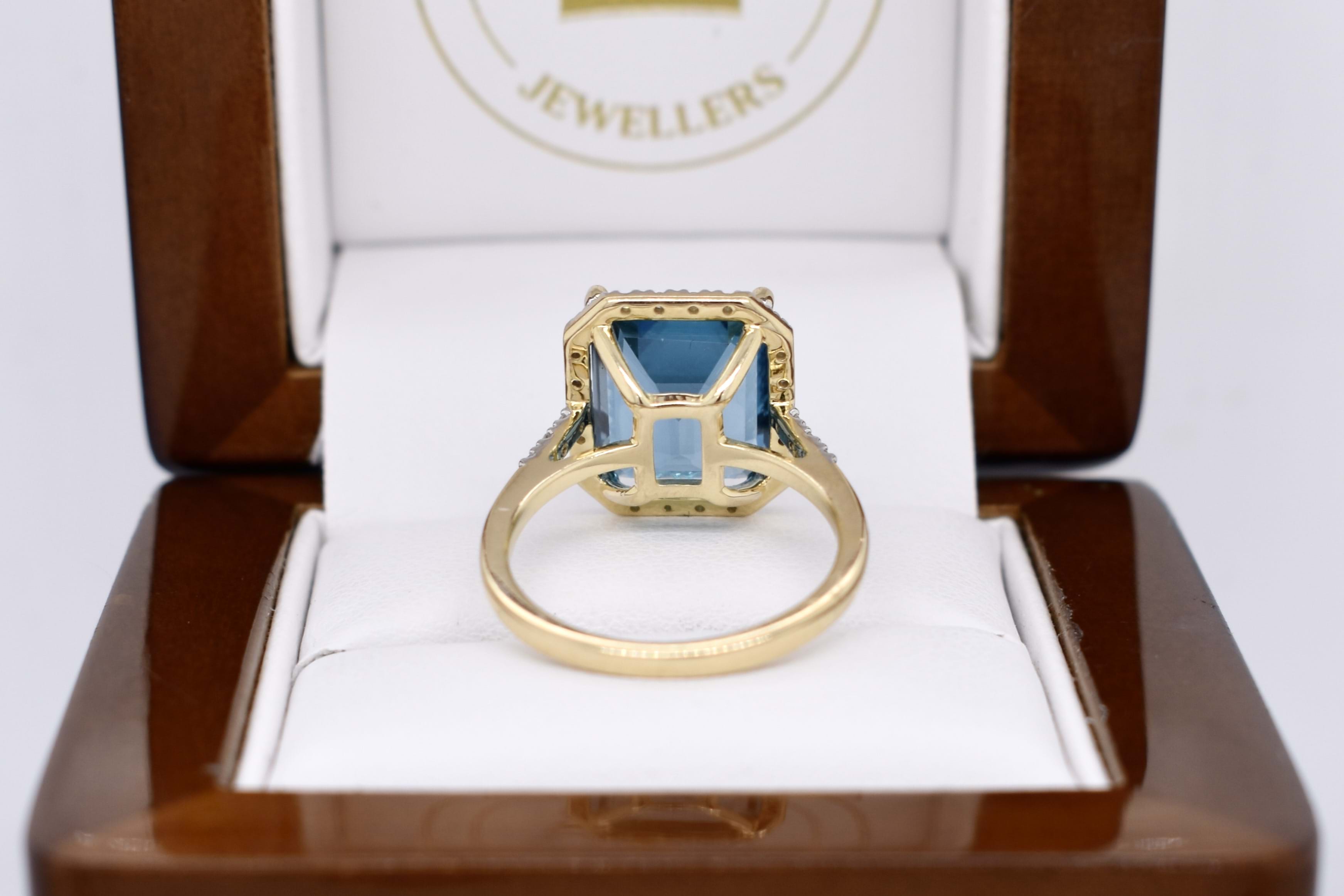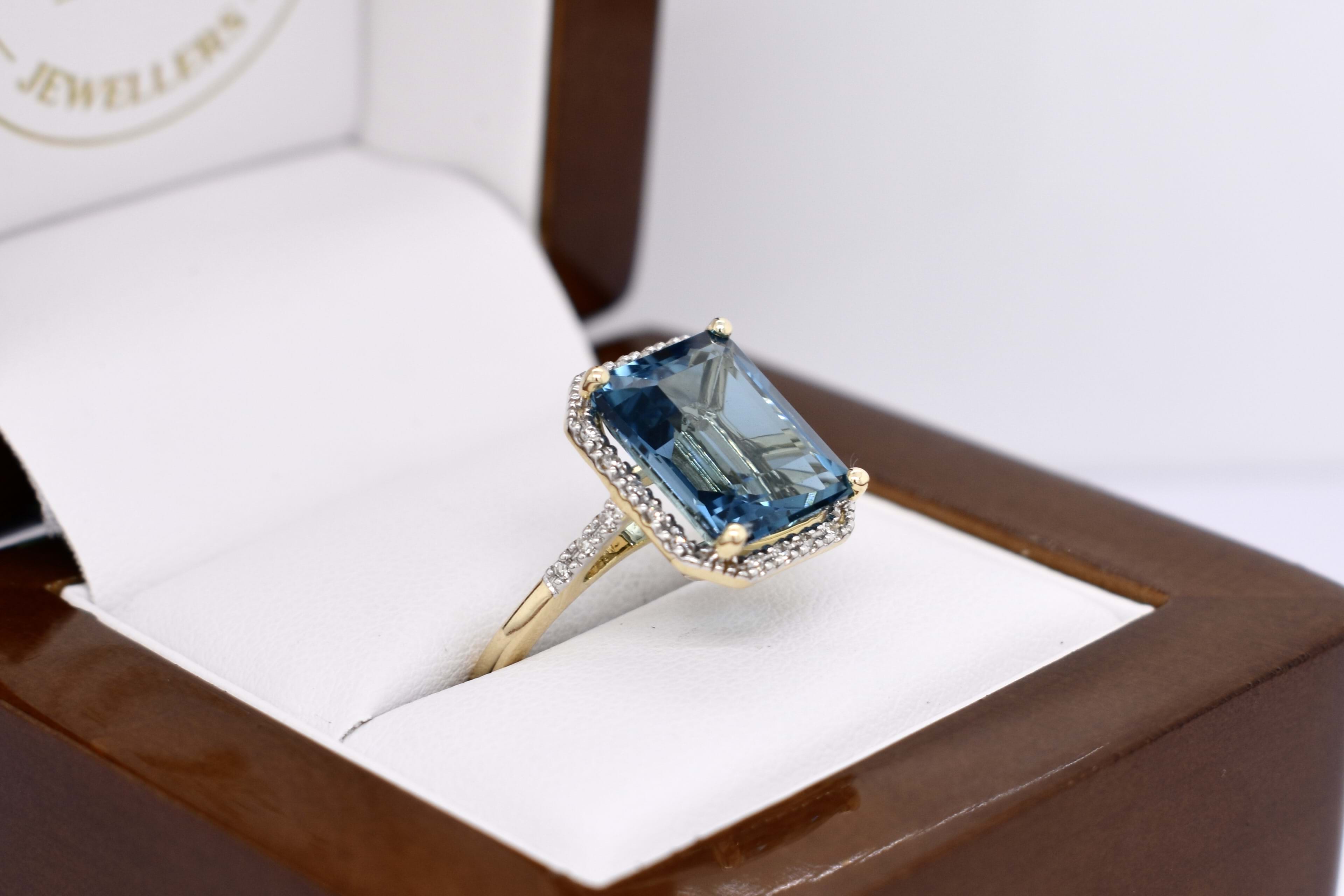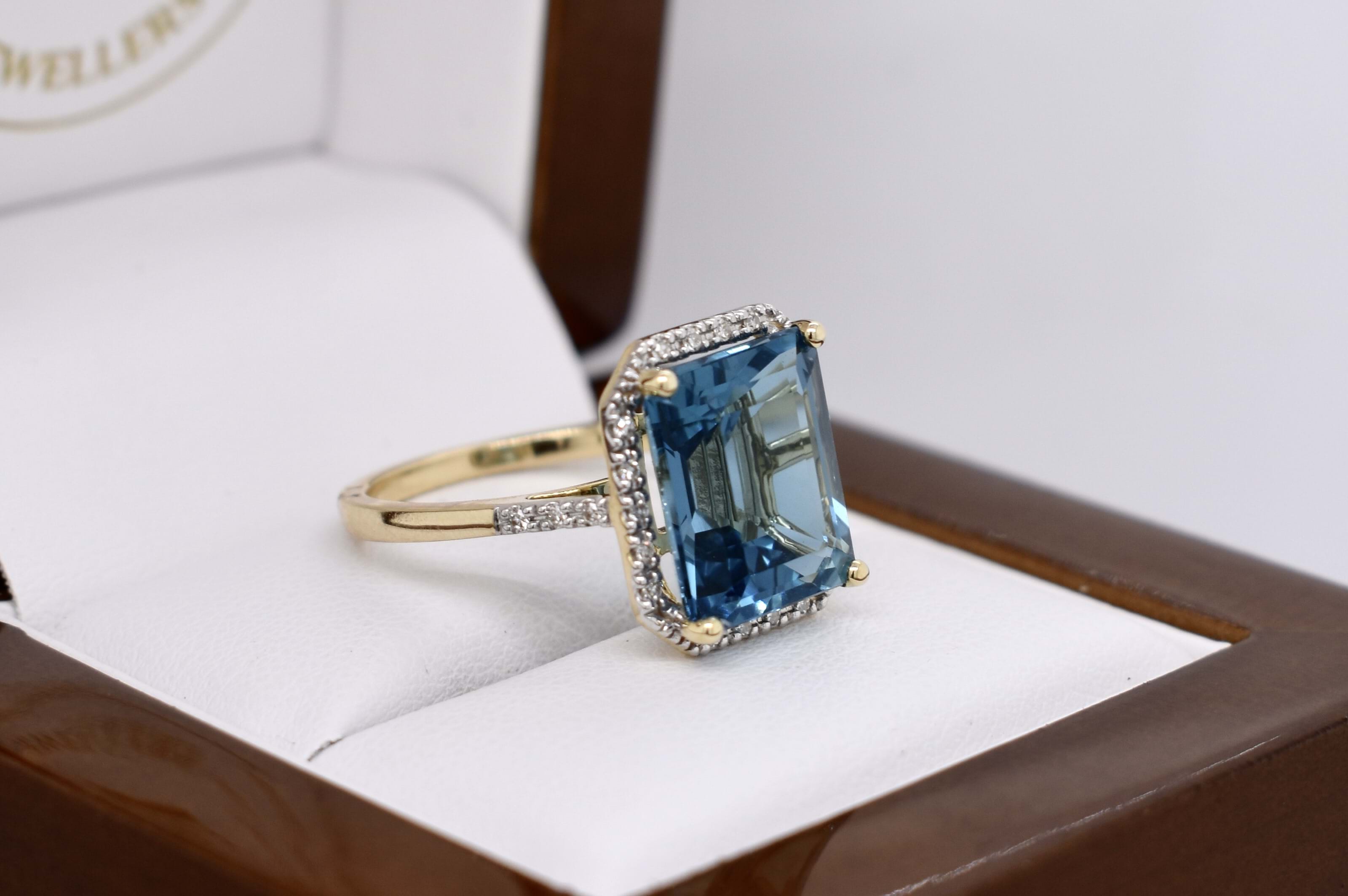 This pretty 9ct yellow gold ring, features an emerald cut London Blue Topaz, measuring 12.1x10.1mm, four claw set with a halo of round brilliant cut diamonds which continue down the shoulders. Total diamond weight of 0.12ct. Finger size N.