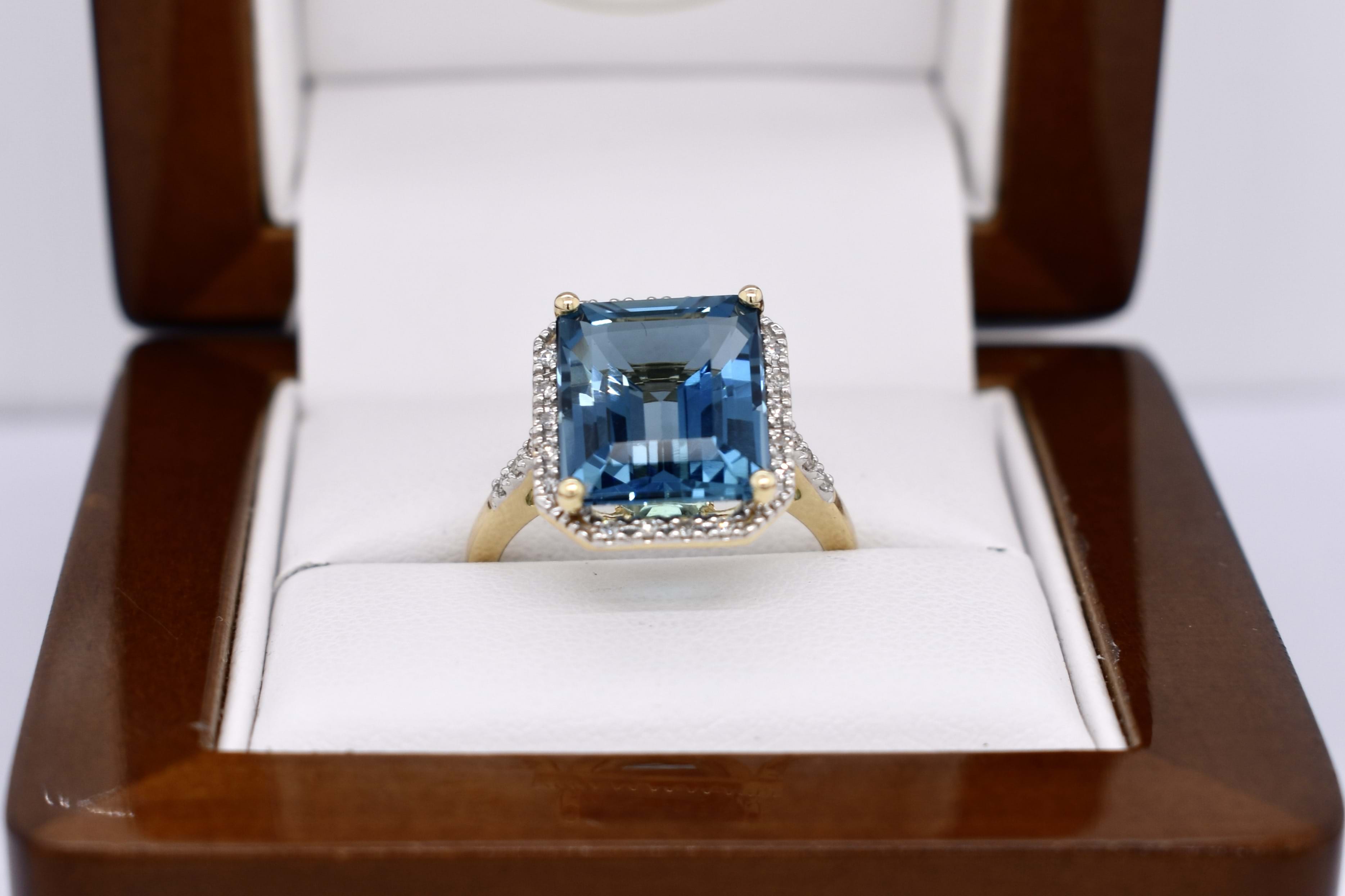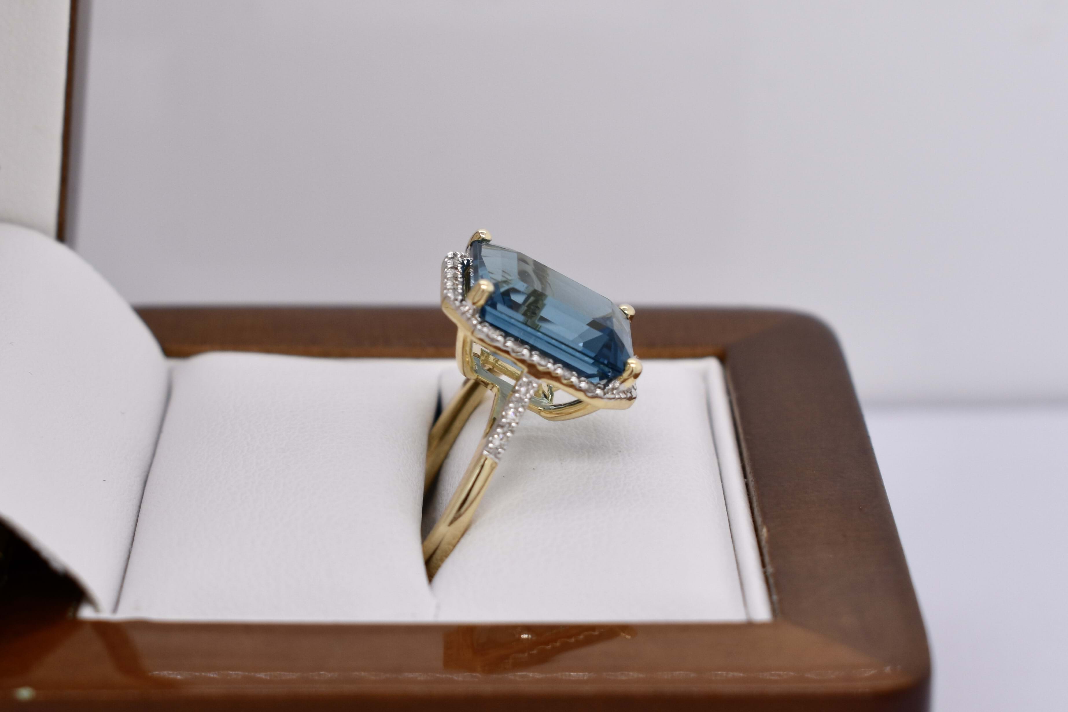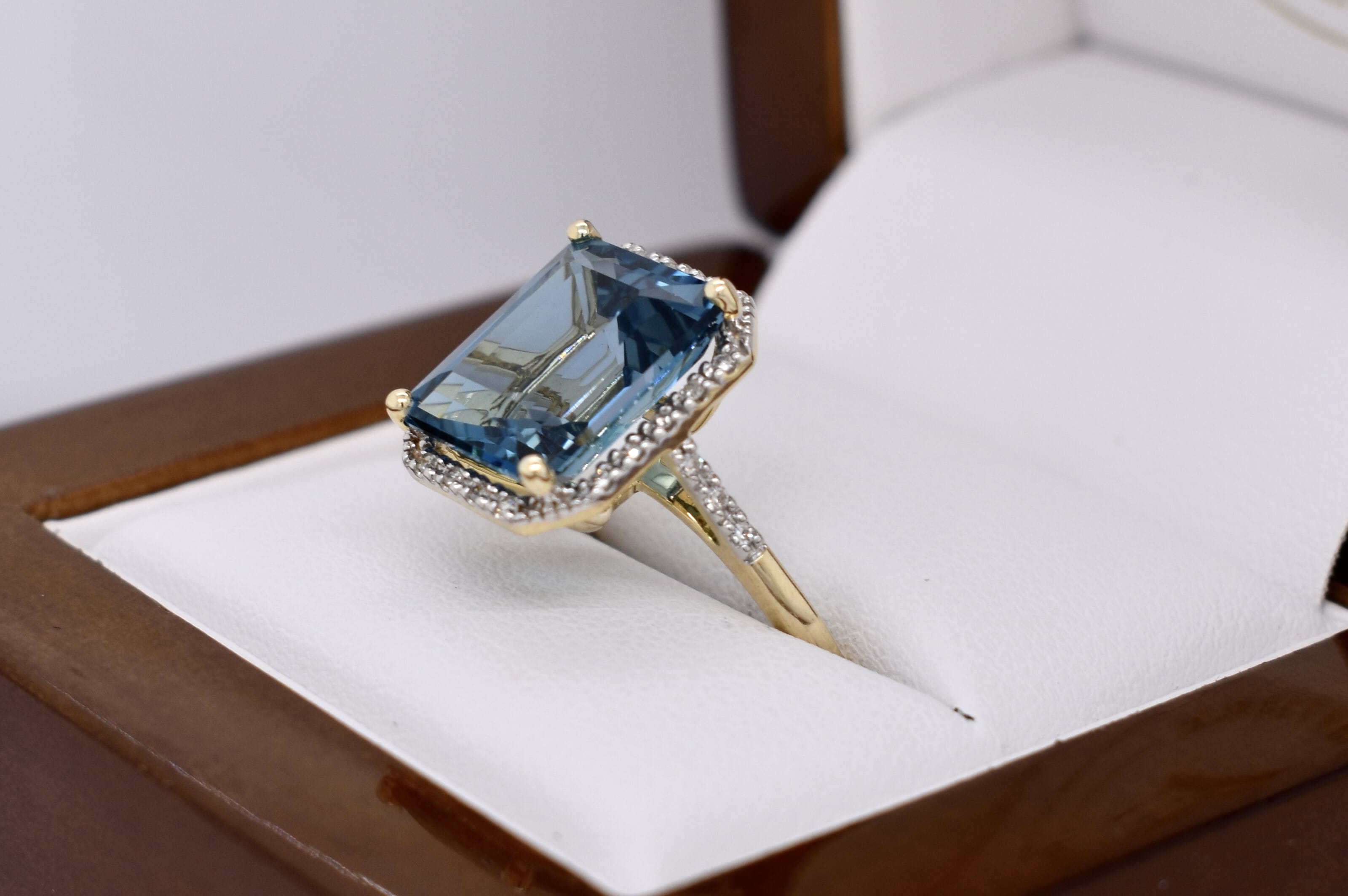 This pretty 9ct yellow gold ring, features an emerald cut London Blue Topaz, measuring 12.1x10.1mm, four claw set with a halo of round brilliant cut diamonds which continue down the shoulders. Total diamond weight of 0.12ct. Finger size N.