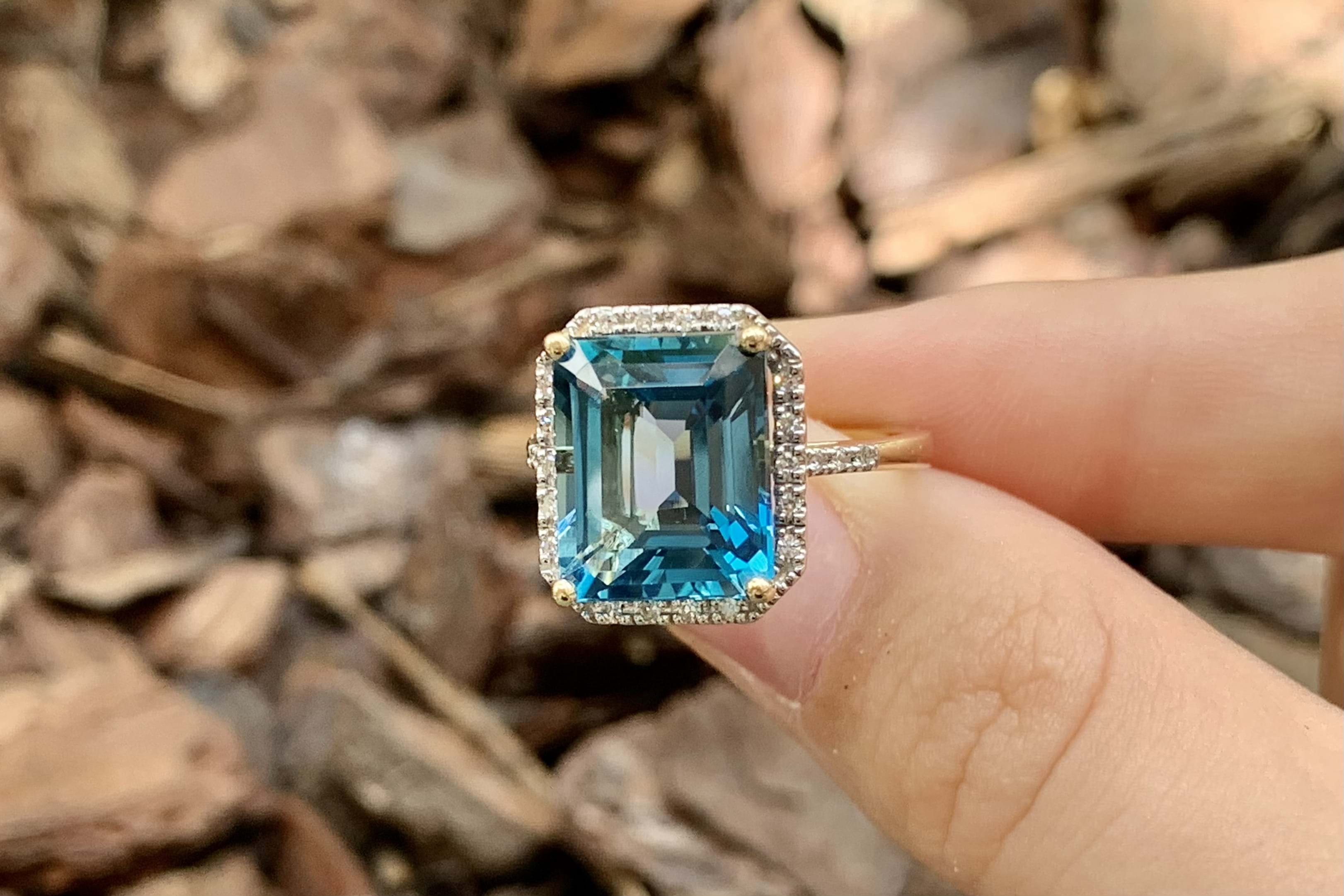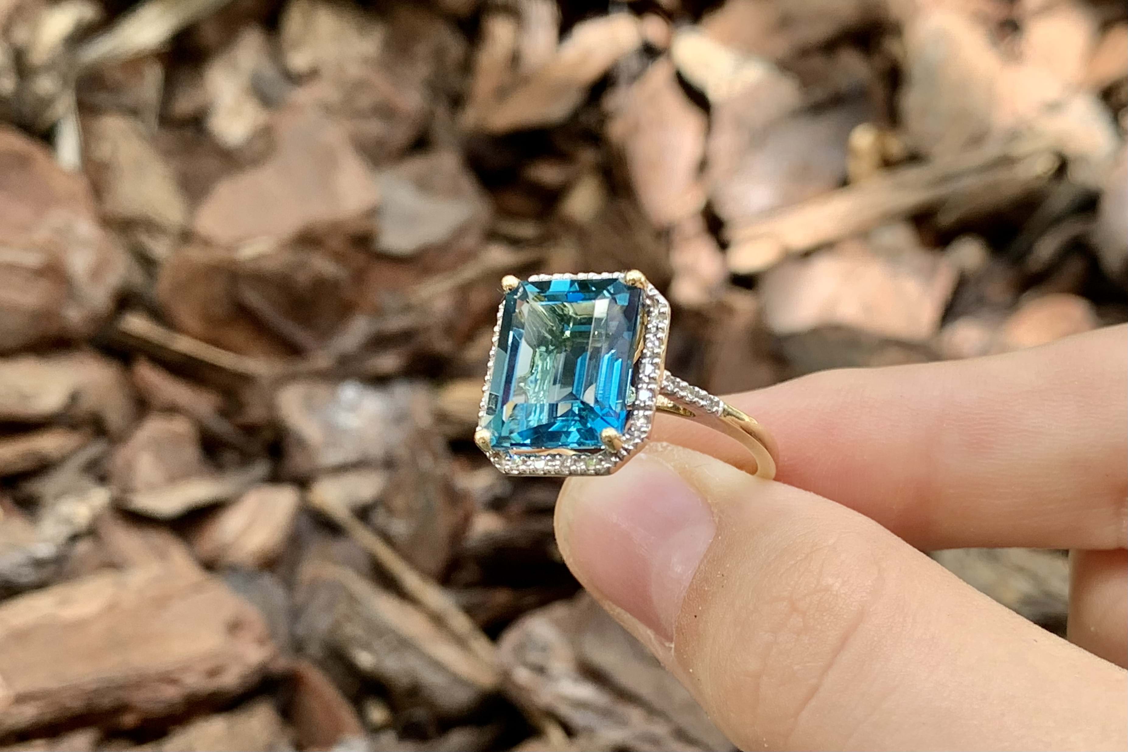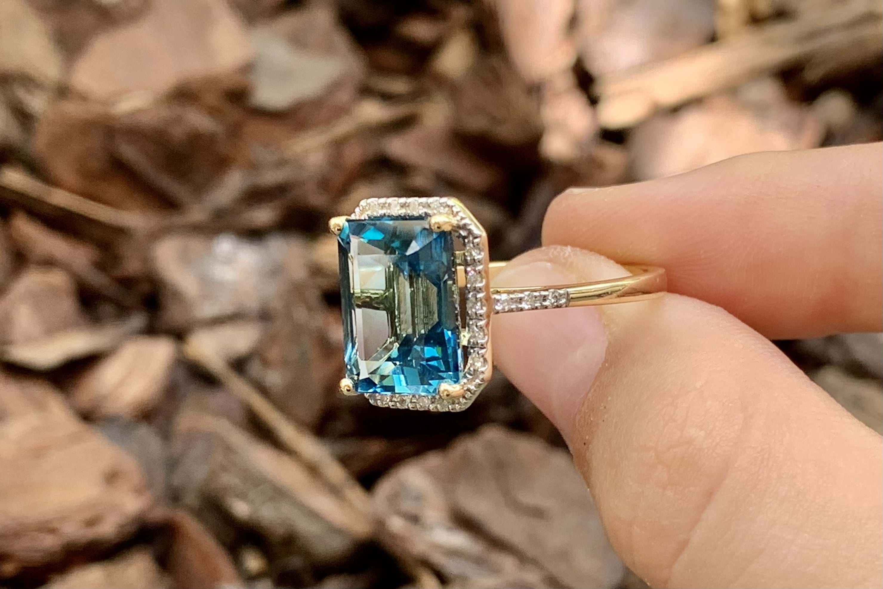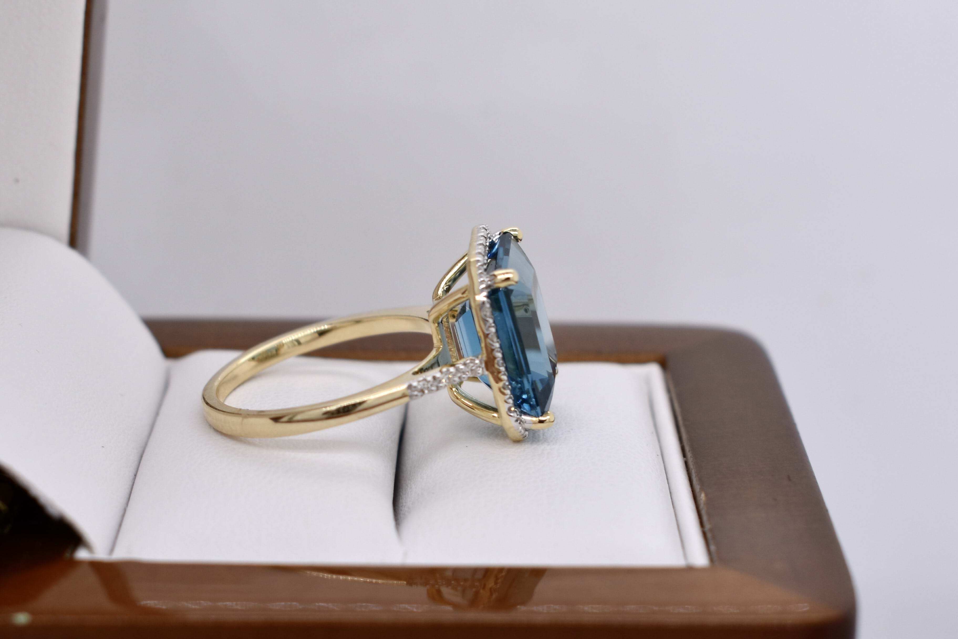 This pretty 9ct yellow gold ring, features an emerald cut London Blue Topaz, measuring 12.1x10.1mm, four claw set with a halo of round brilliant cut diamonds which continue down the shoulders. Total diamond weight of 0.12ct. Finger size N.