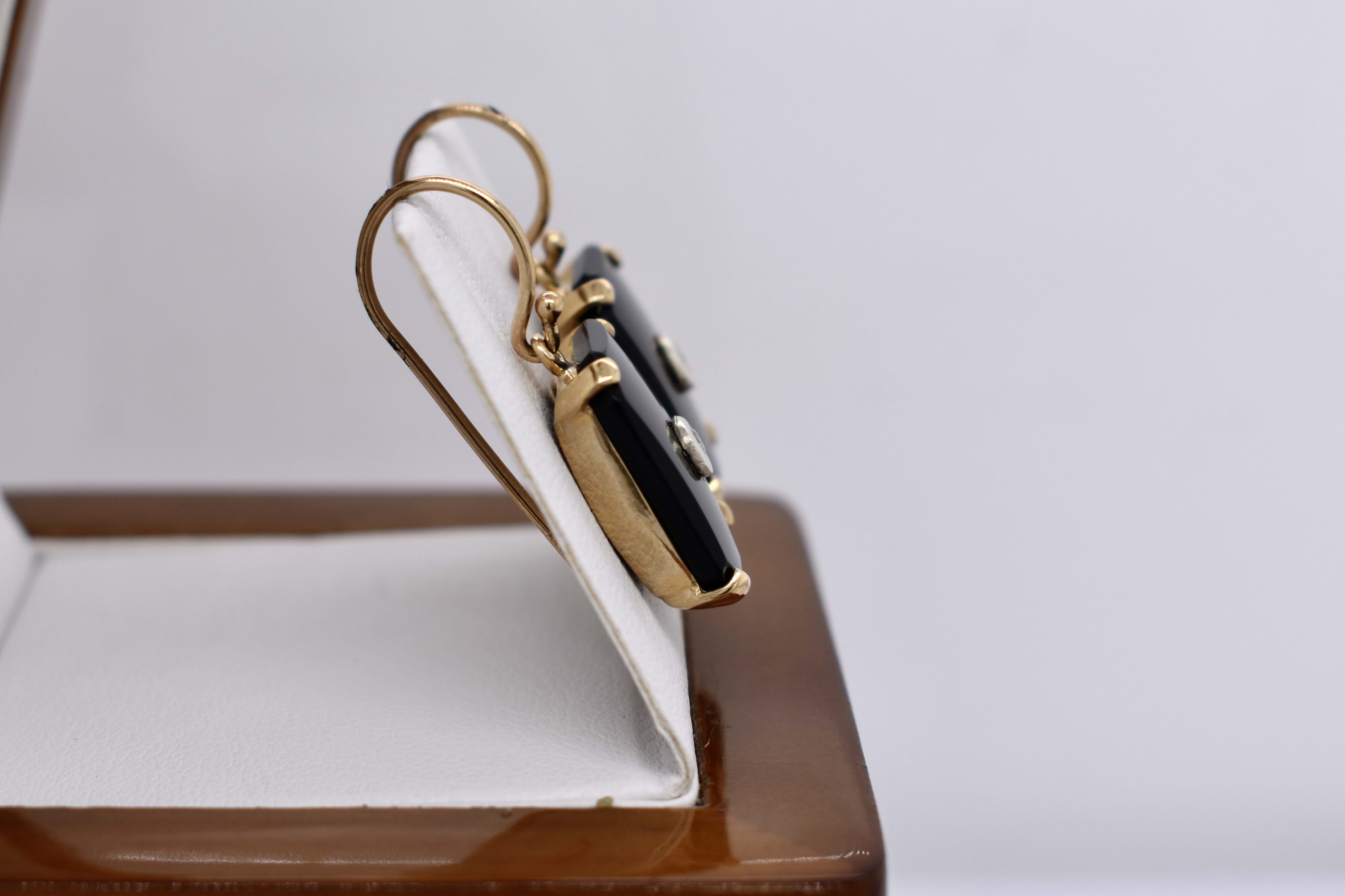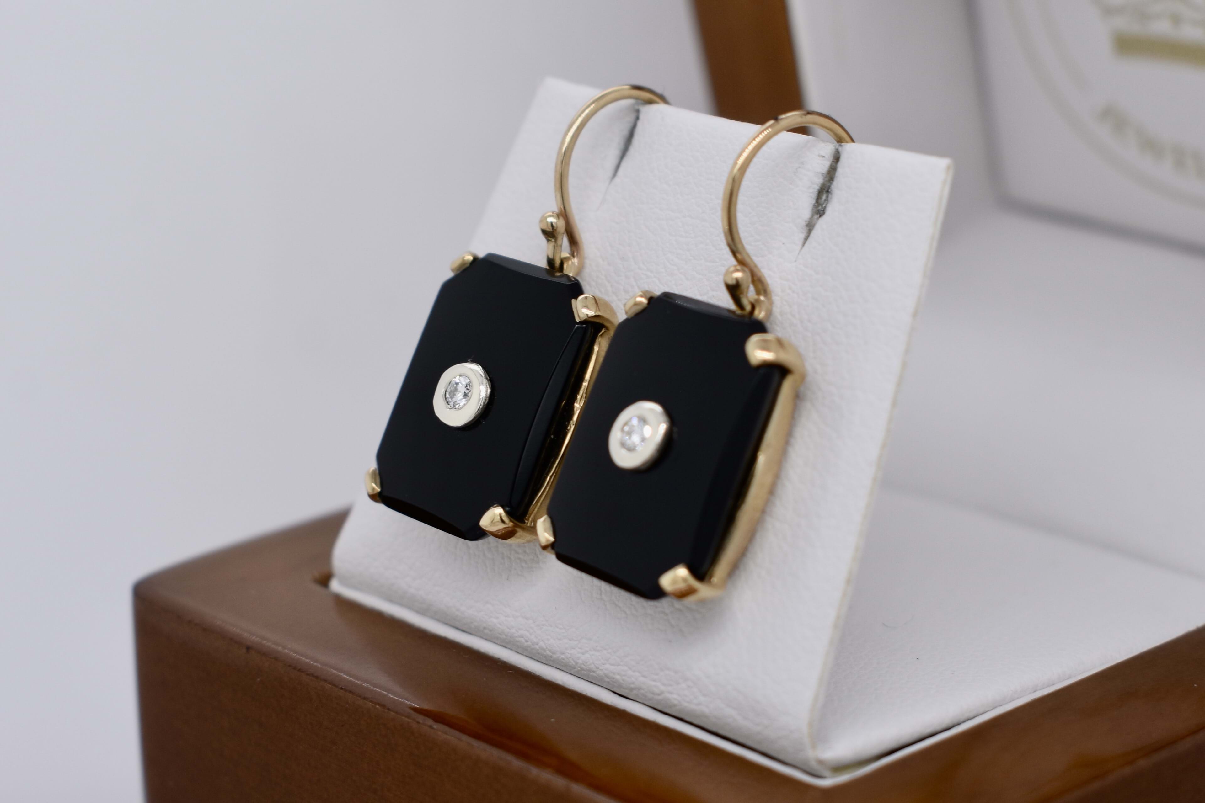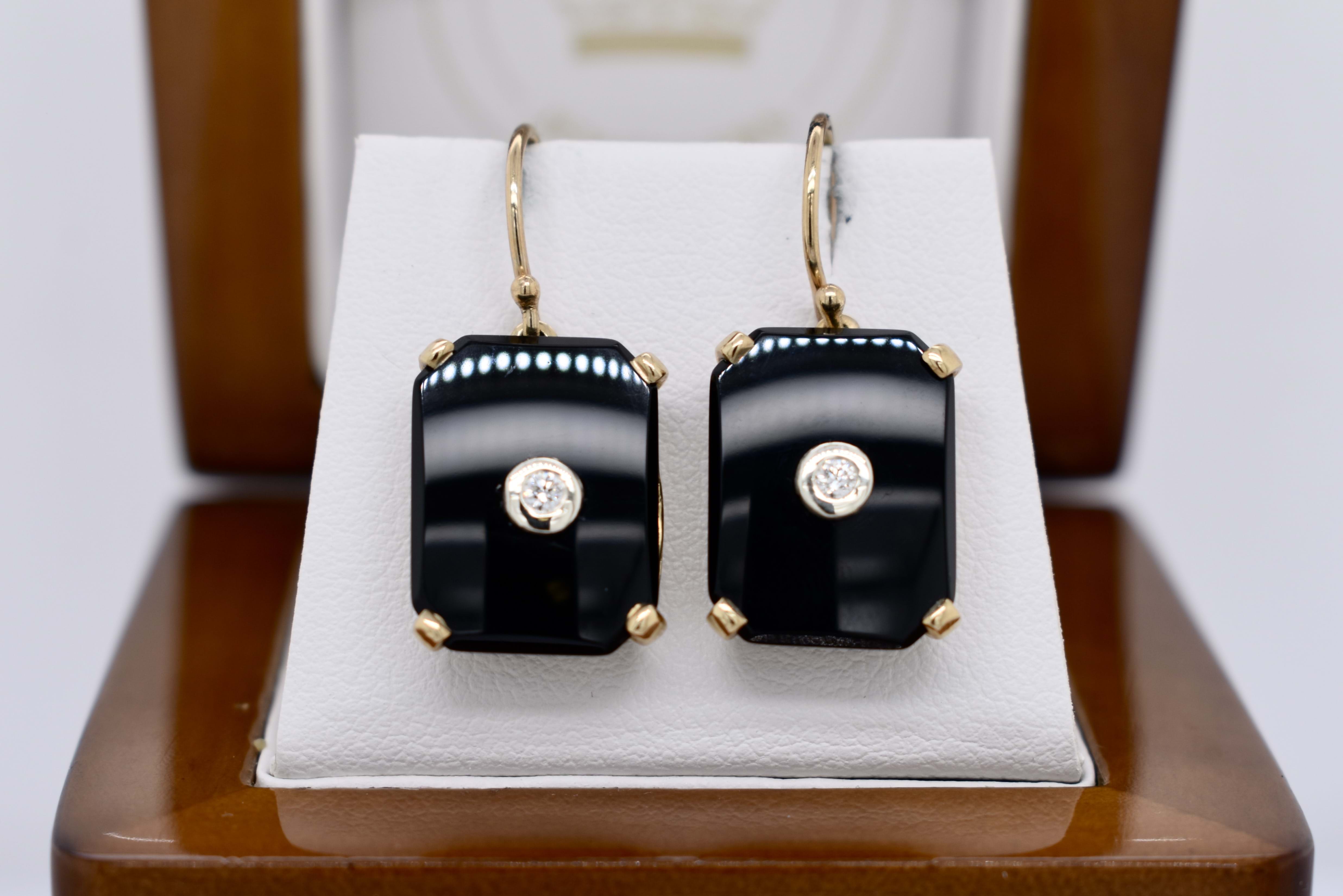 The sweetest pair of emerald cut onyx drops, four claw set in 9ct yellow gold. With a round brilliant cut diamond, bezel set in white gold, in the centre. Onyx measures 16.0x12.1mm. Finished with shepherd hook fittings. Complete the matching set with the enhancer: 20376505 and ring: 20376468. (Photographed in natural light together)