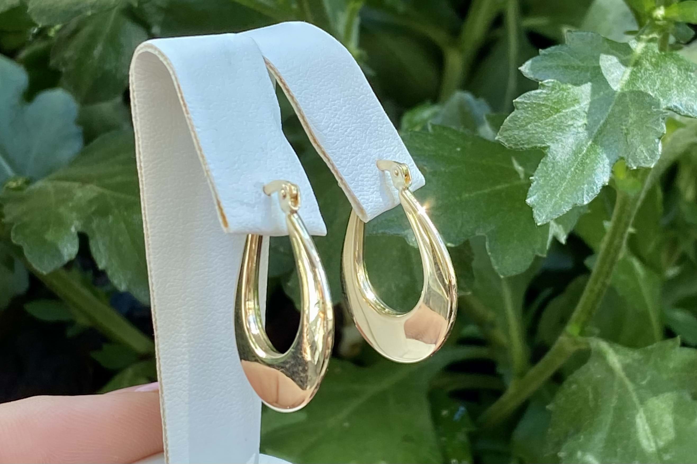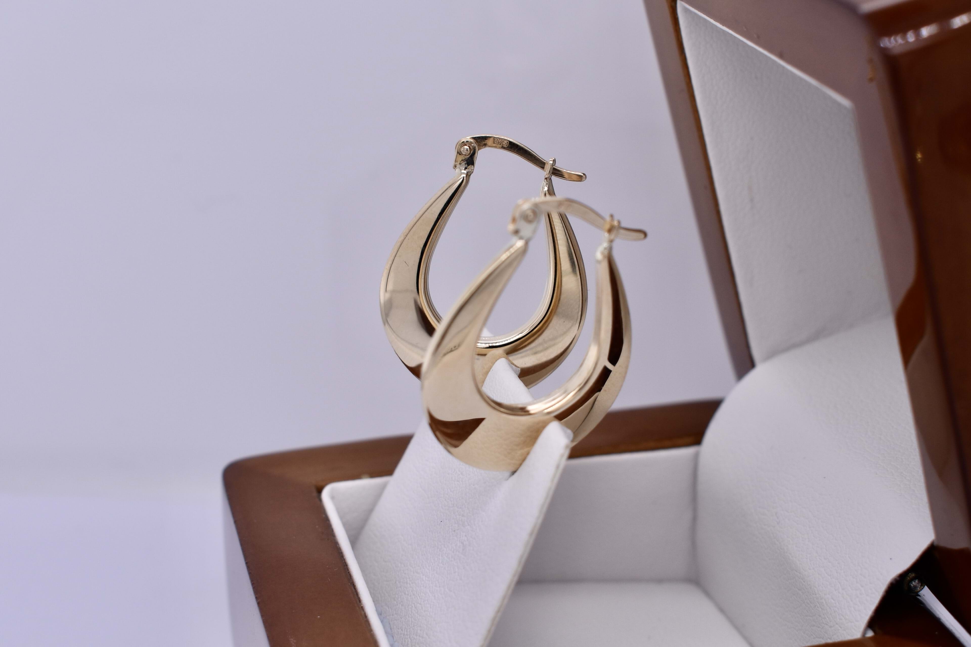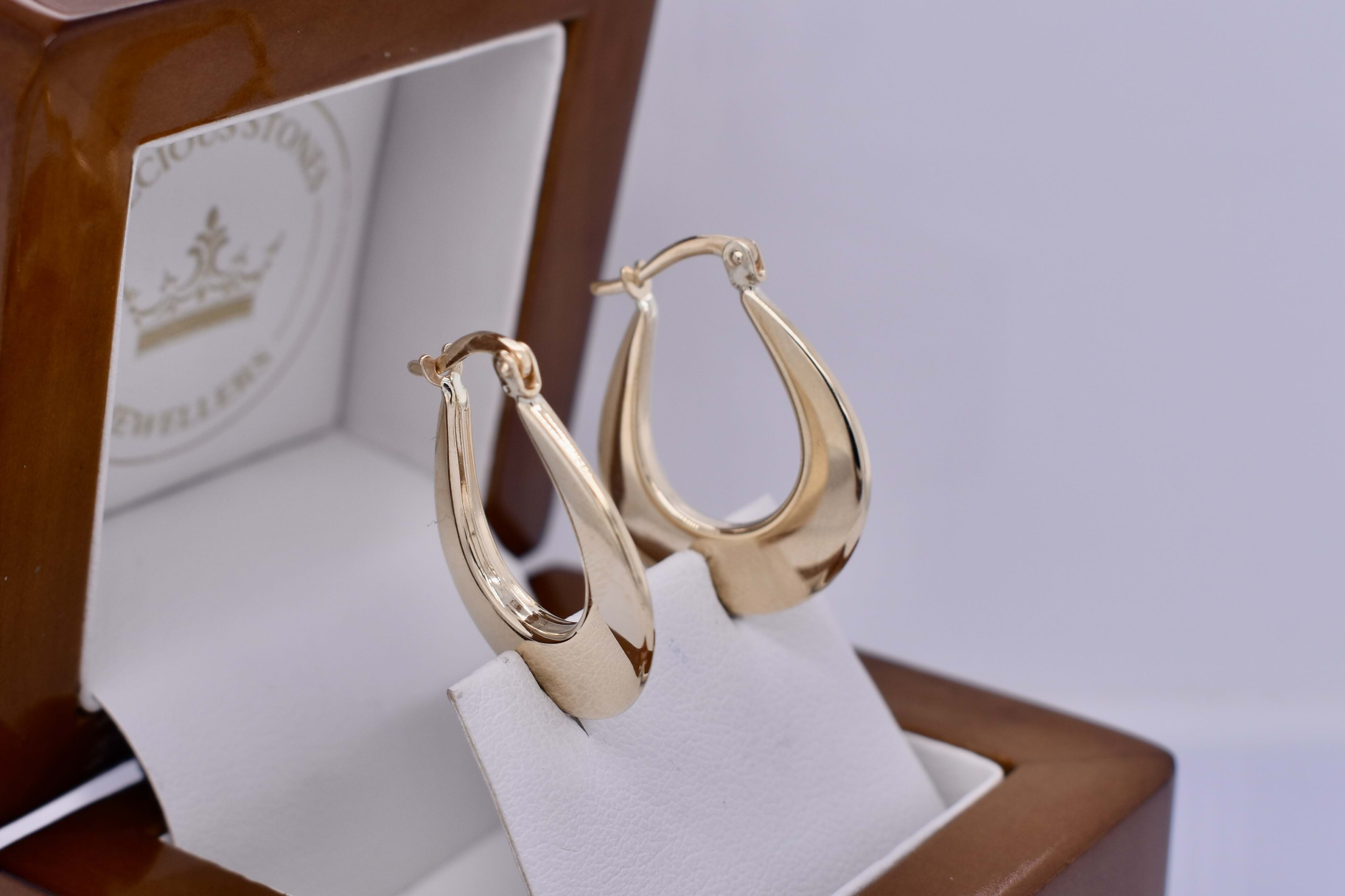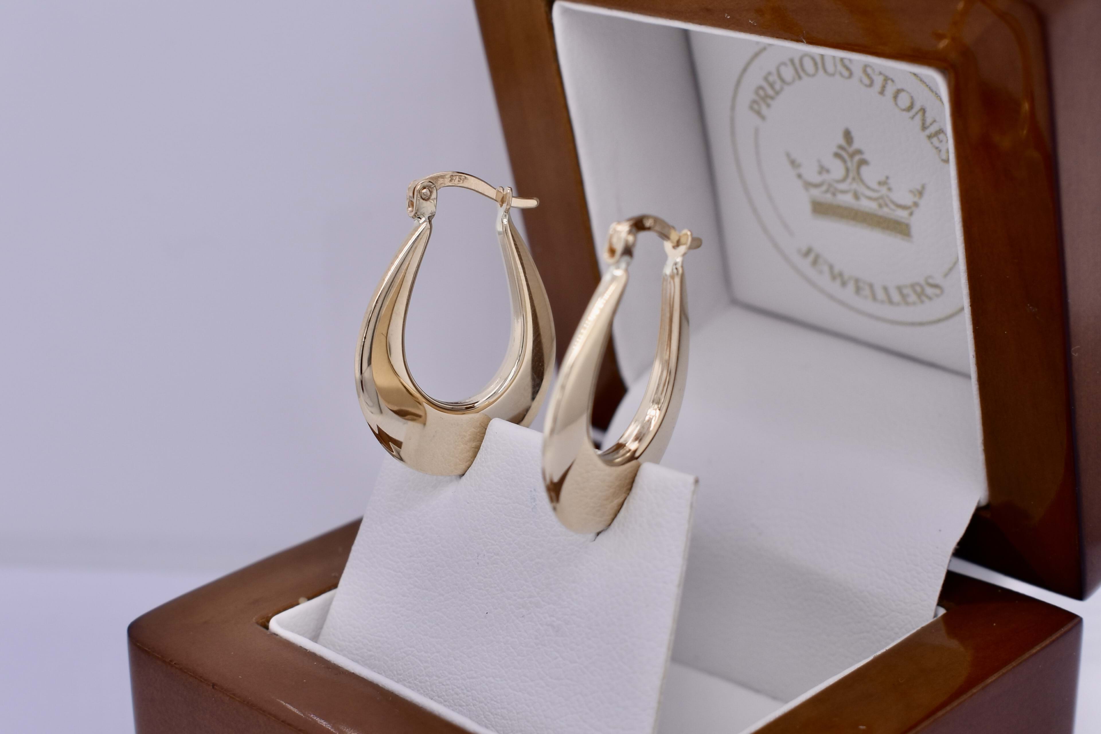Classy and timeless pair of 9ct yellow gold hollow hoop earrings, measuring 25x20mm, in a flat u-shaped design. Completed with clipped post fittings.