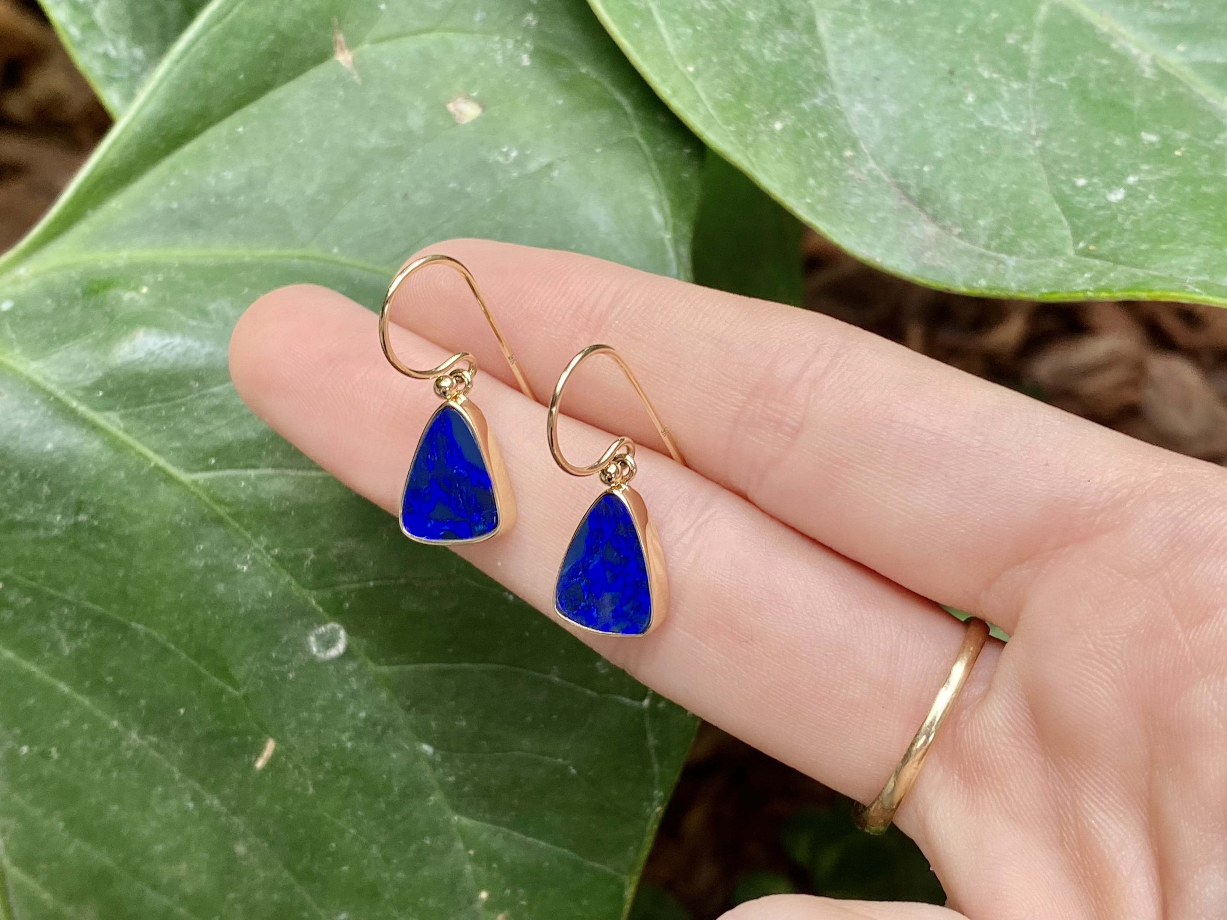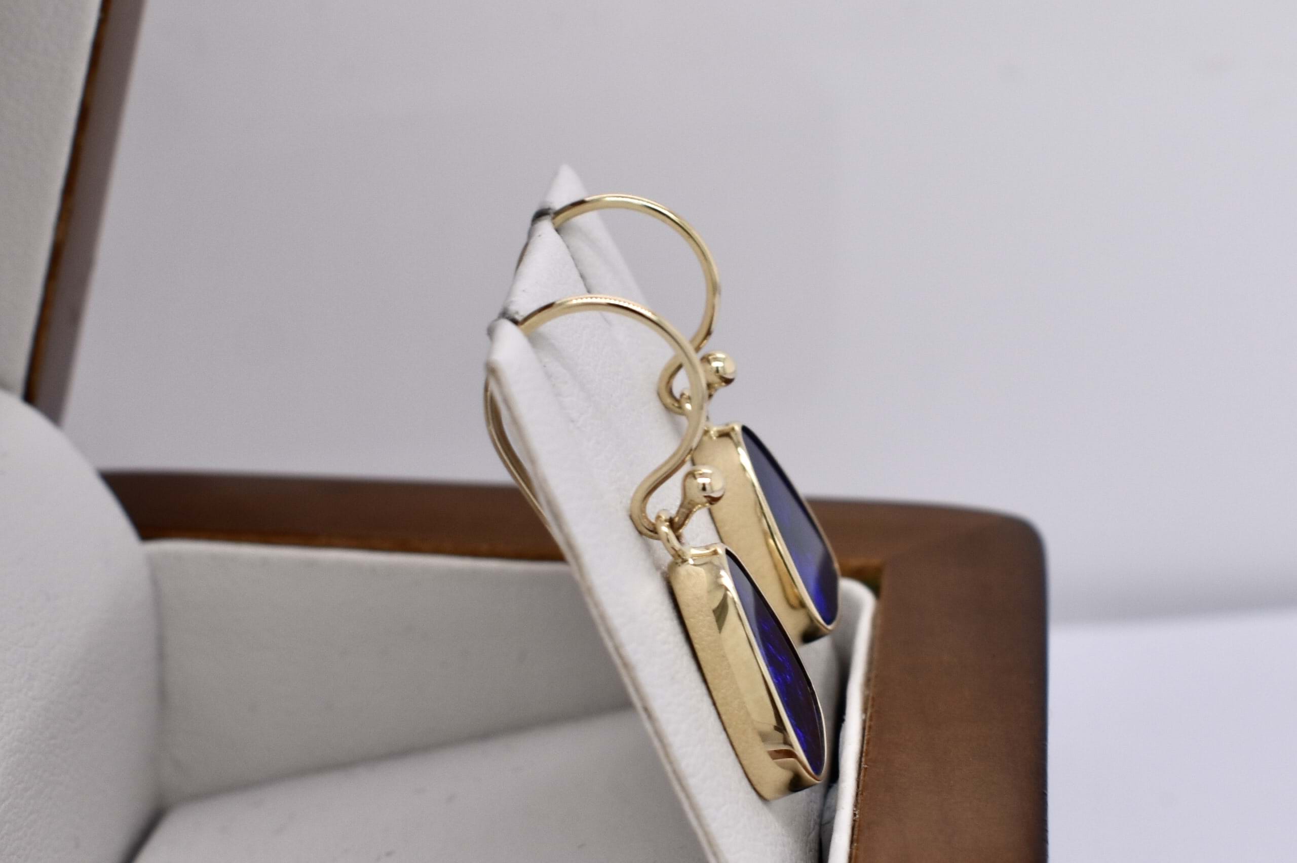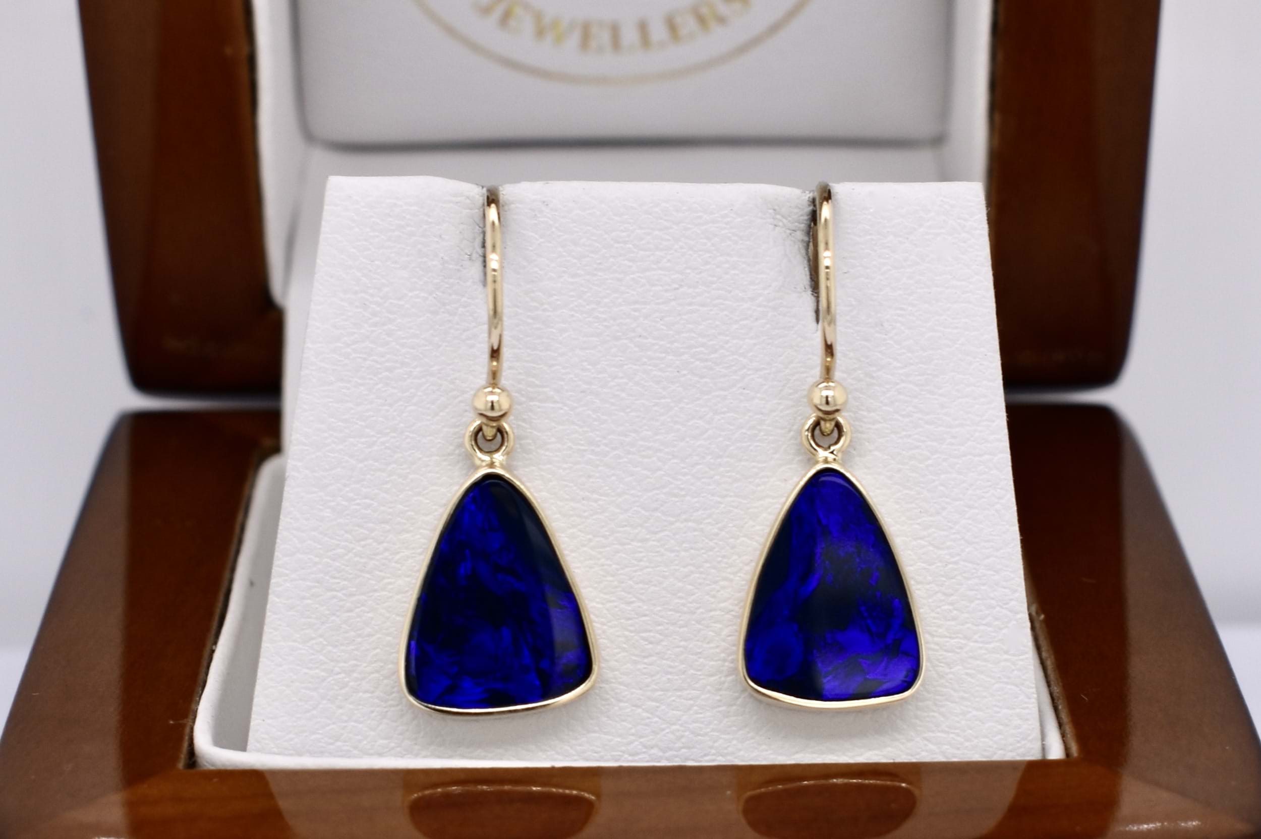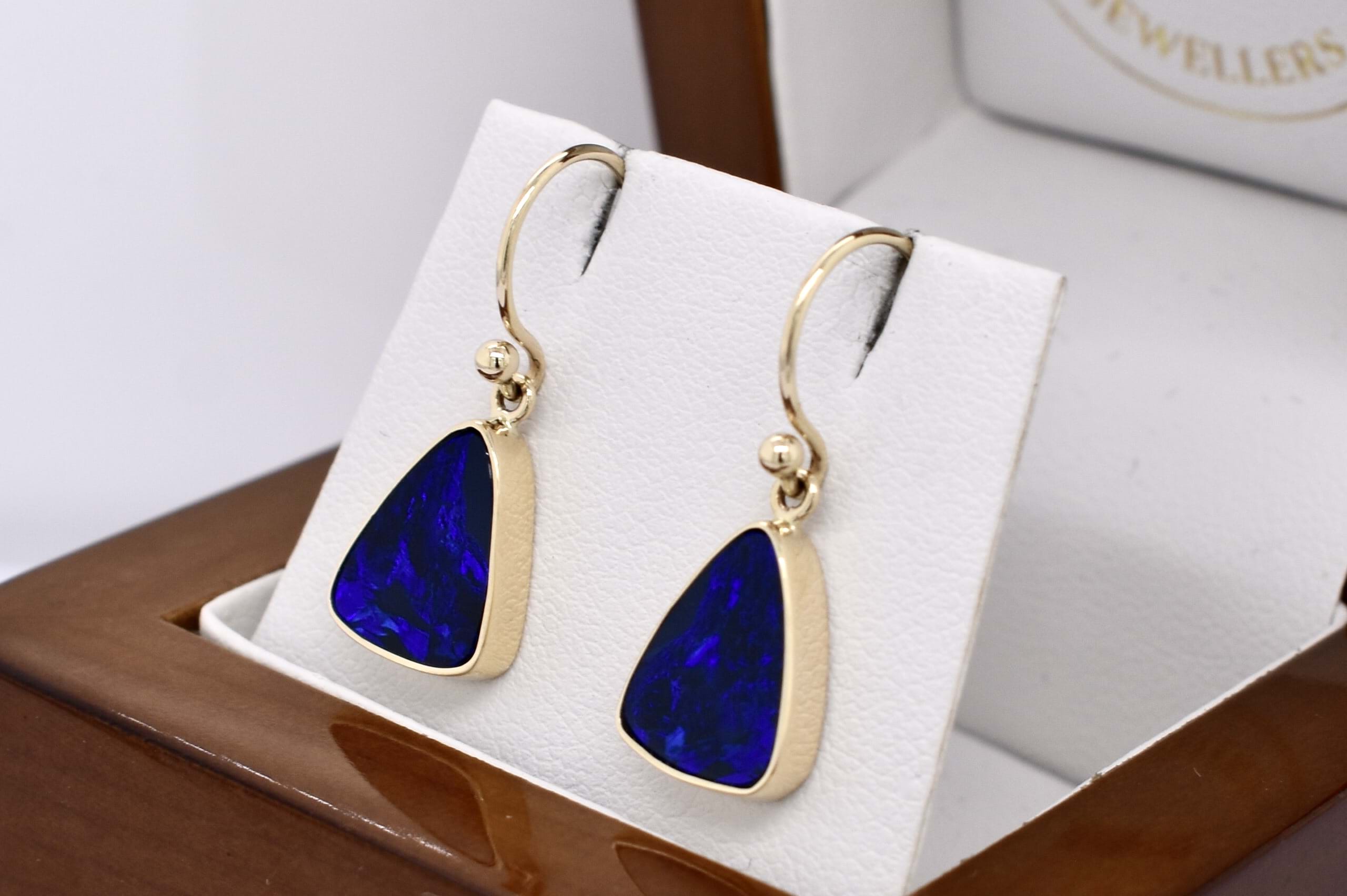 Absolutely gorgeous pair of freeform shaped drops, featuring approx. 12.2x9.7mm Coober Pedy opal doublets. The doublet consisting of Coober Pedy opal (on top) with a boulder opal backing. These opals are dark with pretty flashes of blue throughout. They are bezel set in 9ct yellow gold with shepherd hook fittings.