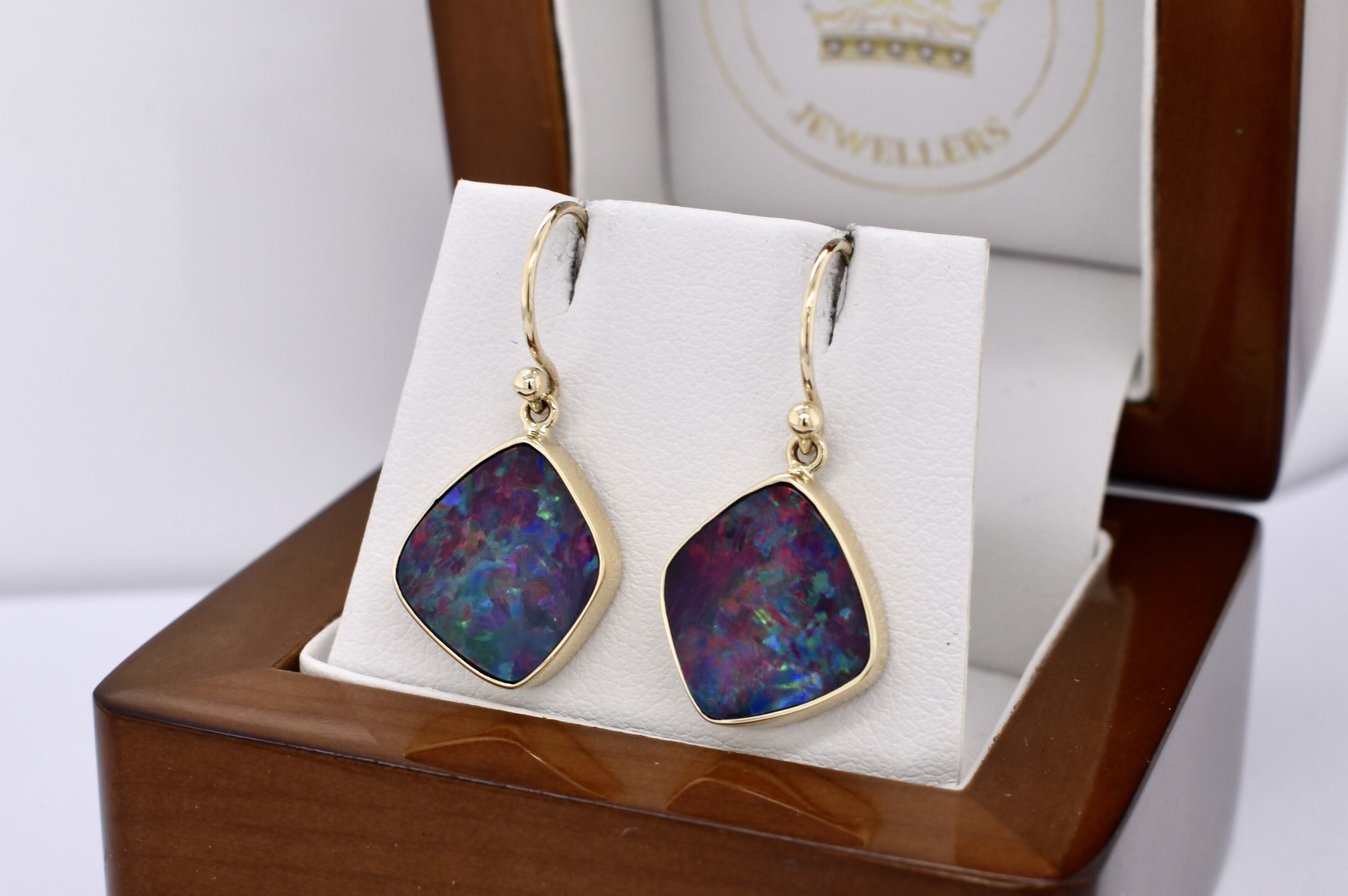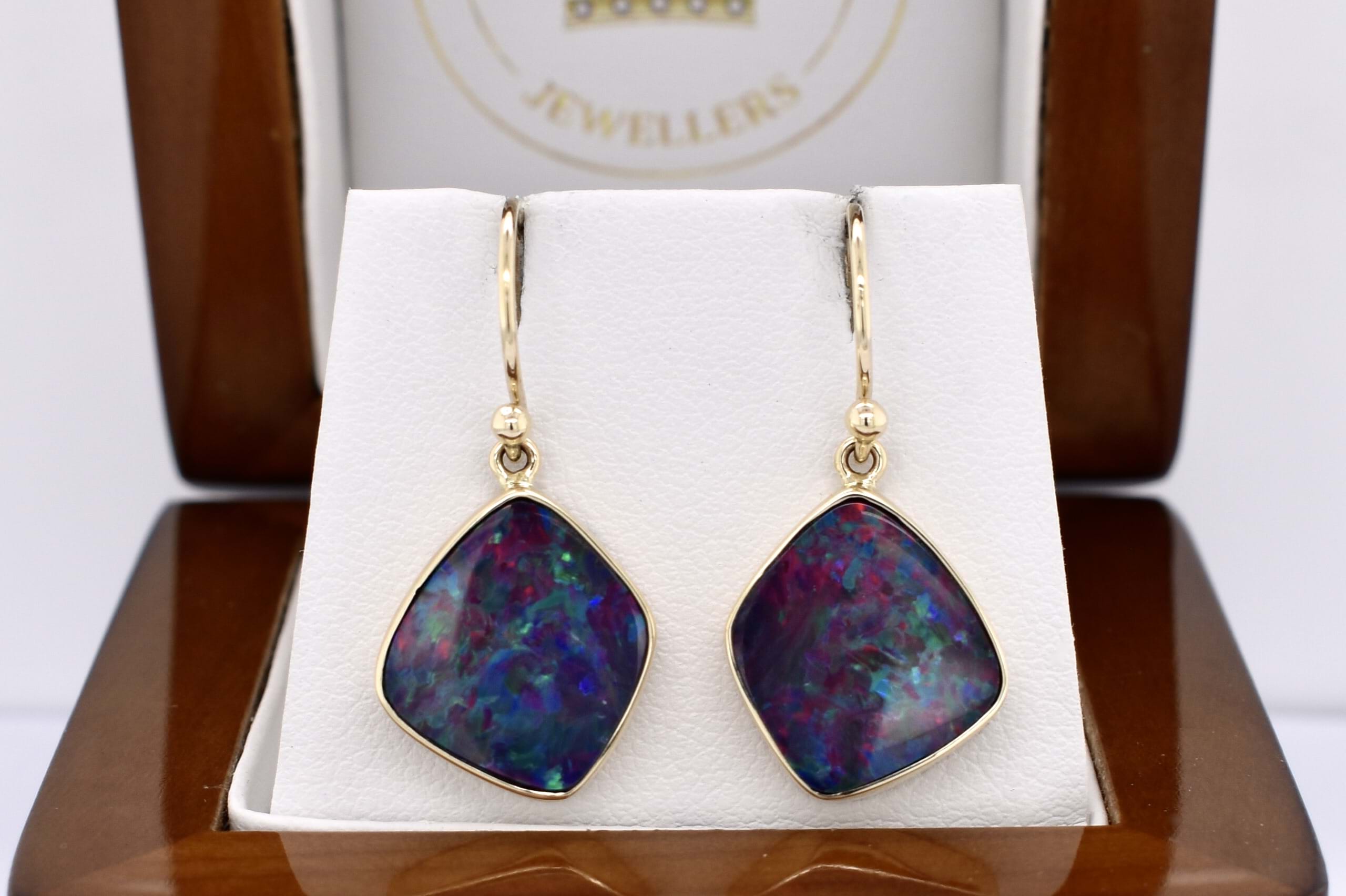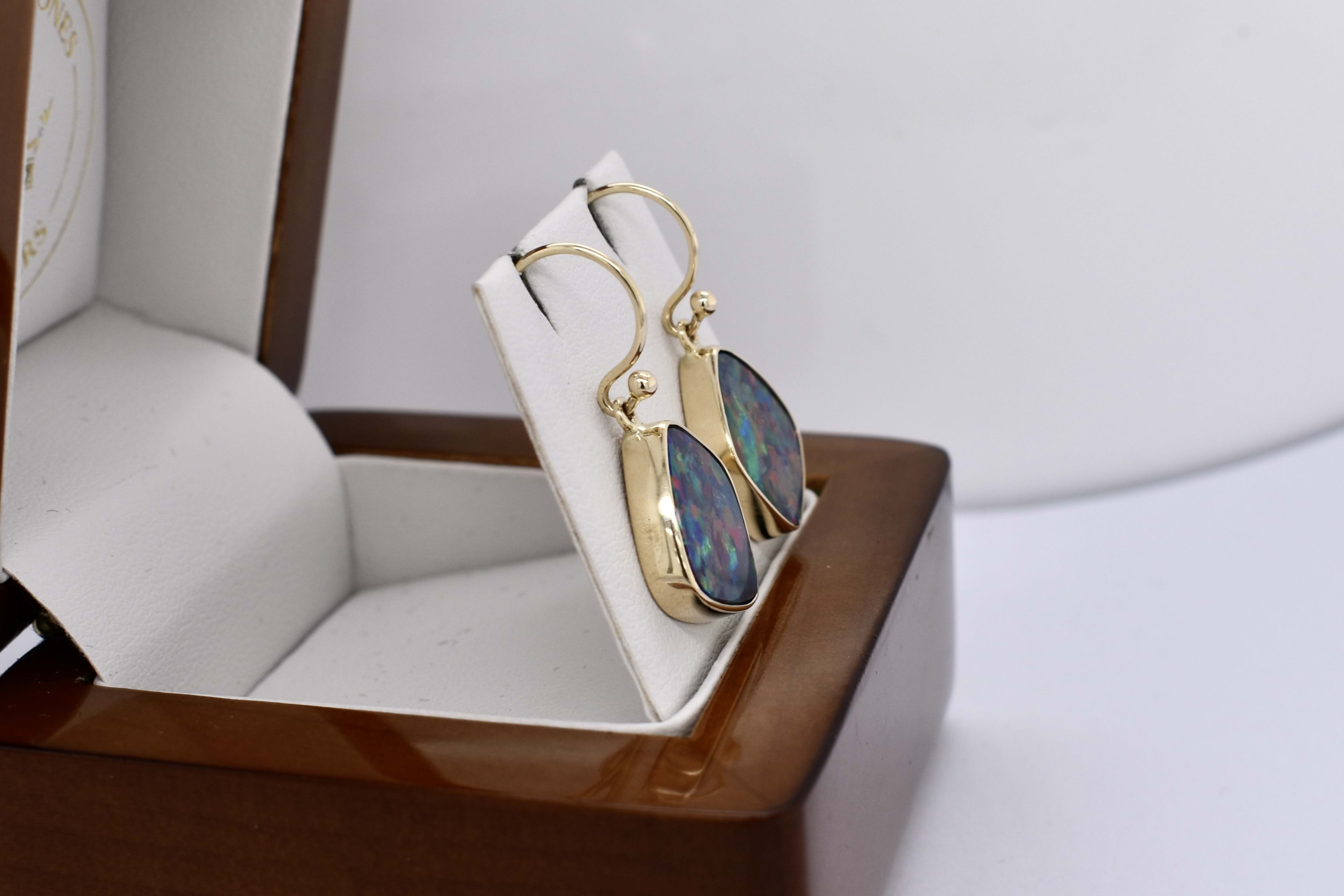 Absolutely stunning pair of freeform shaped drops, featuring approx. 15.0x13.5mm Coober Pedy opal doublets. The doublet consisting of Coober Pedy opal (on top) with a boulder opal backing. These opals are dark with pretty flashes of red, pink and orange throughout. They are bezel set in 9ct yellow gold with shepherd hook fittings.