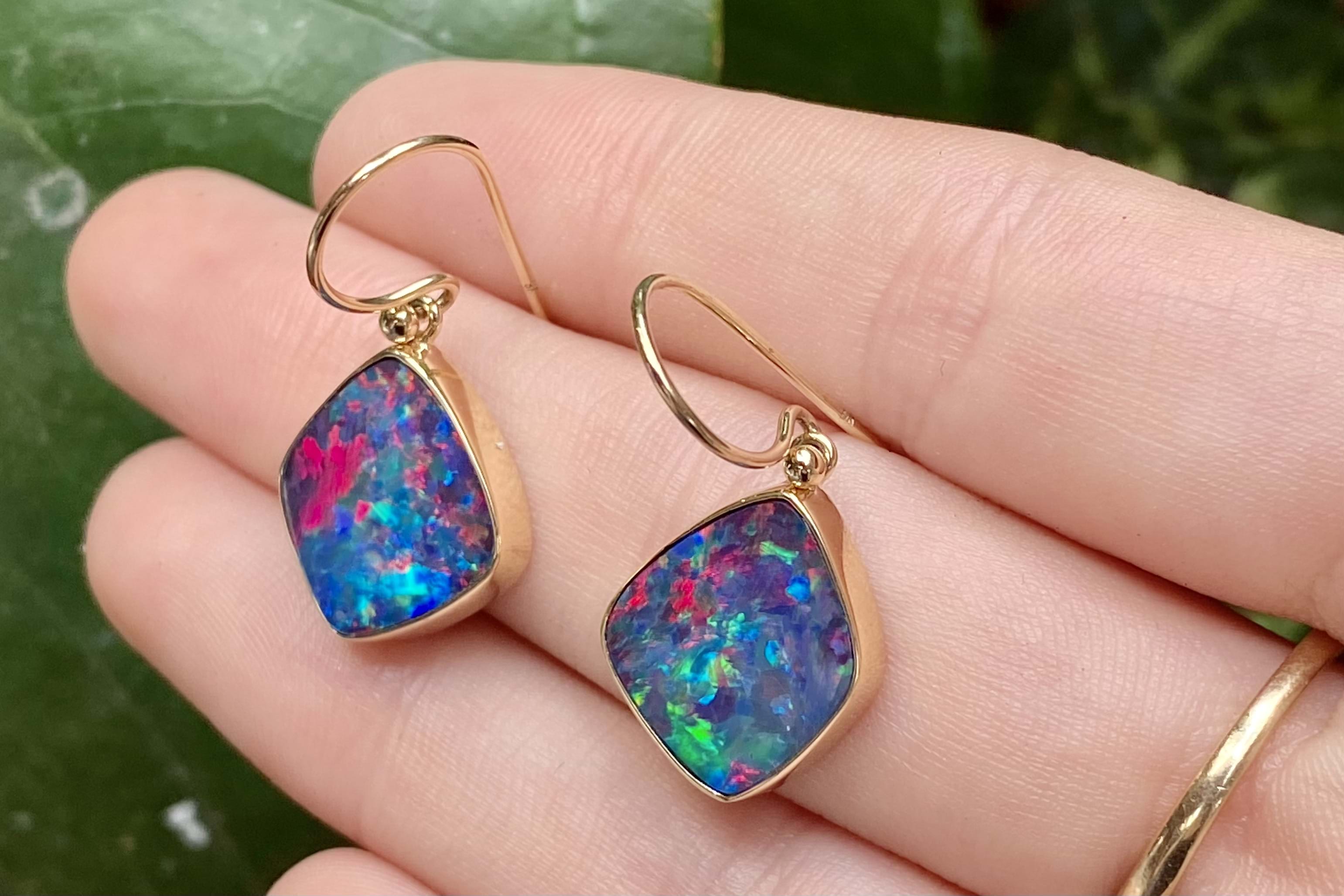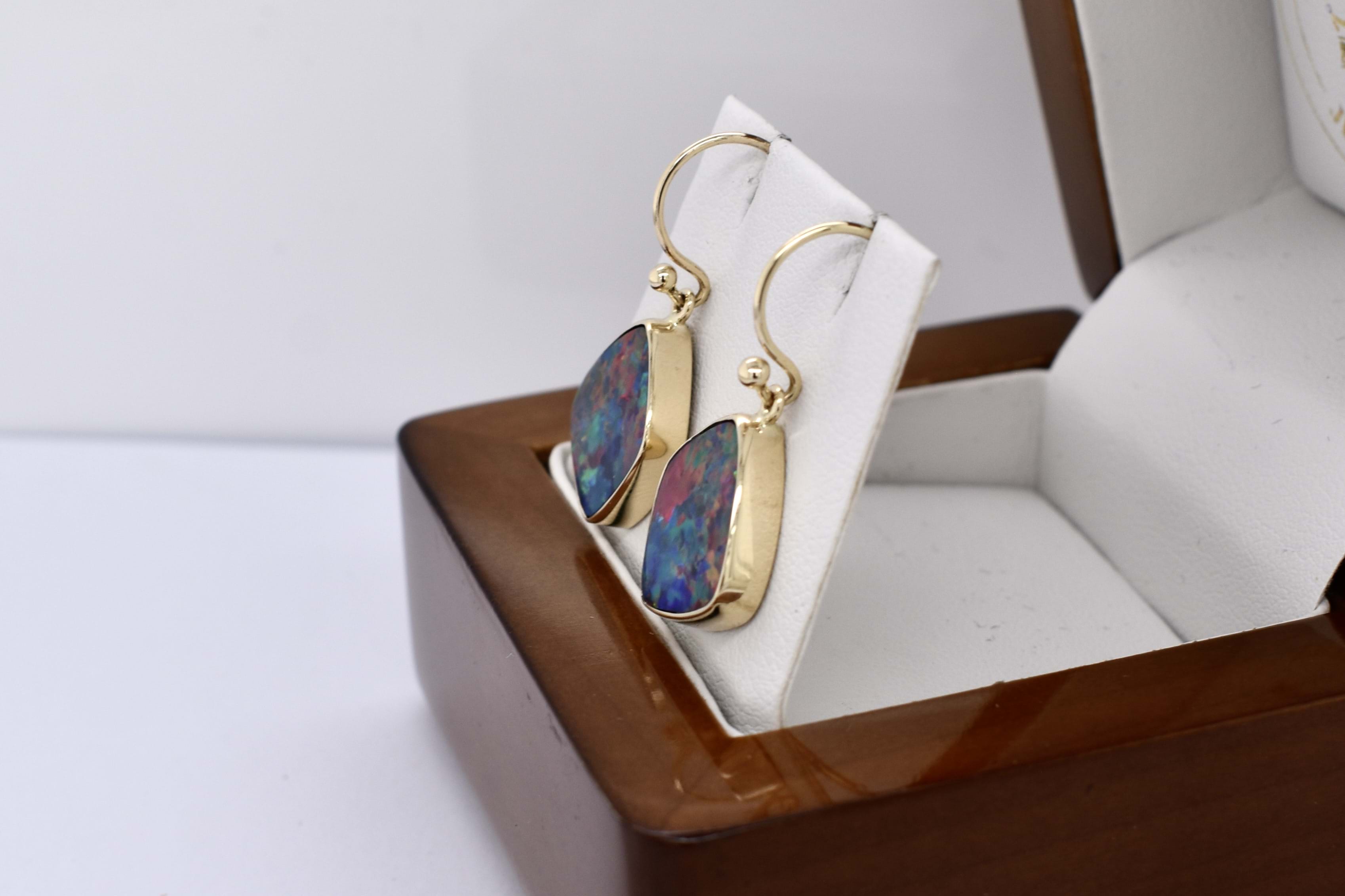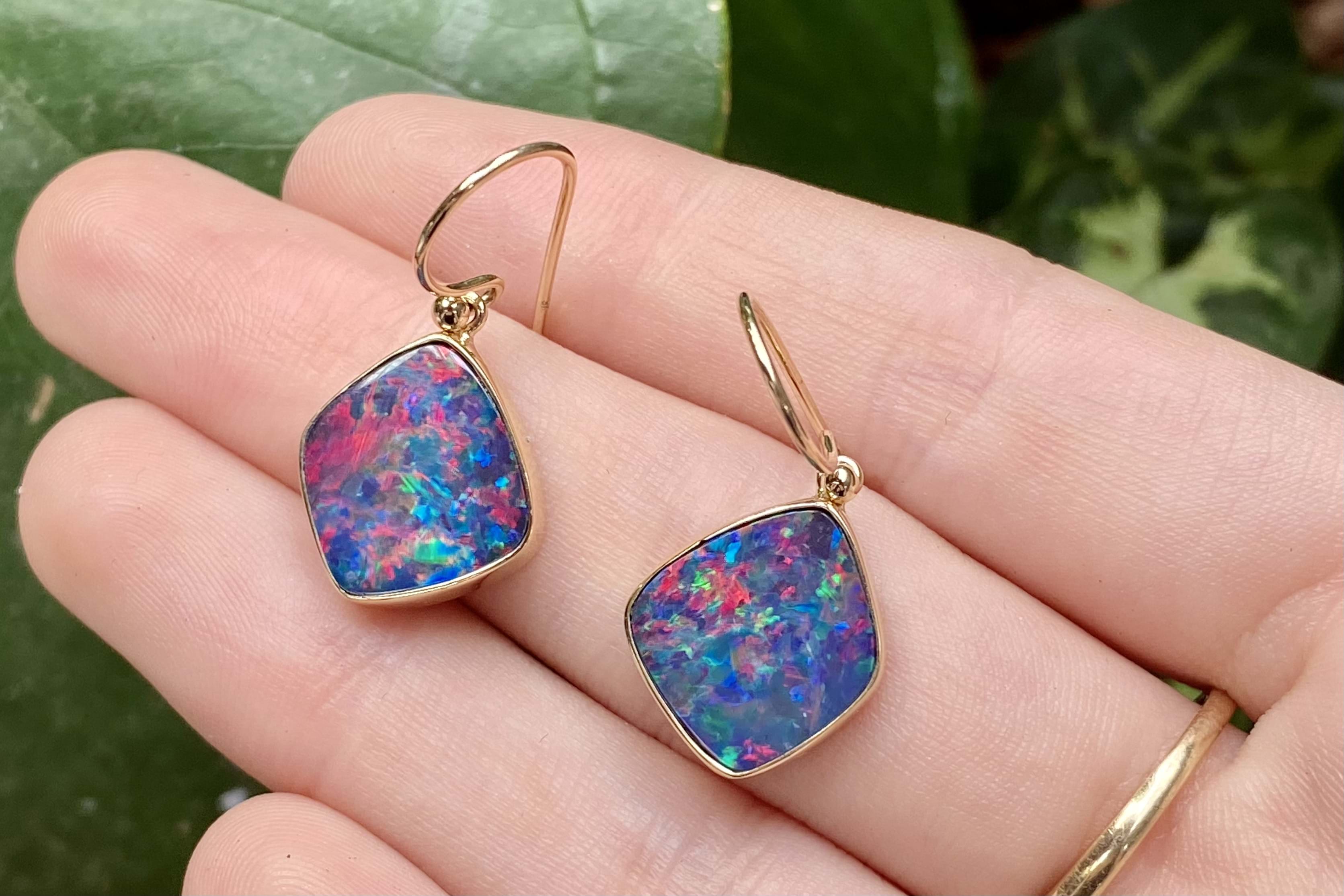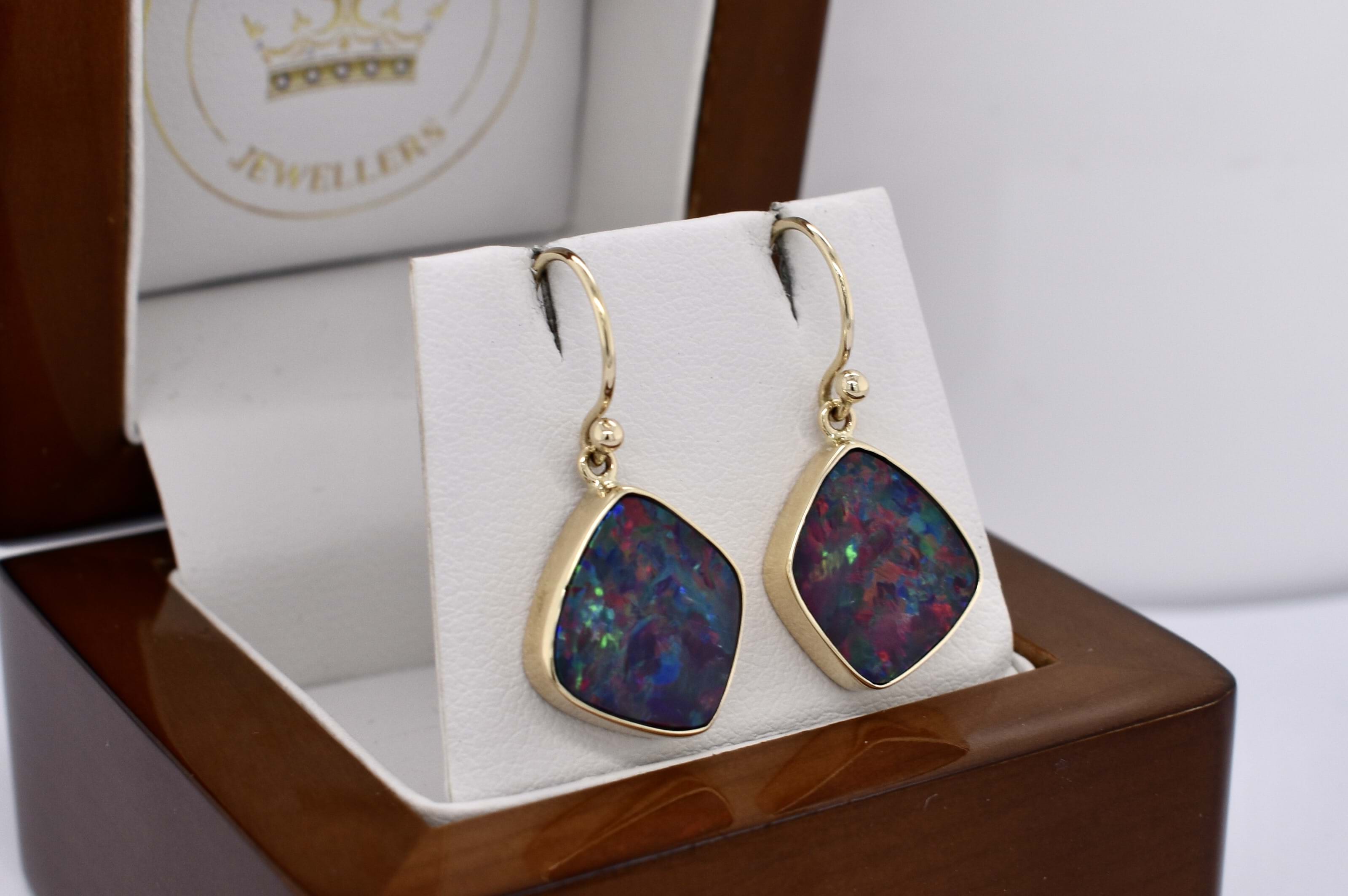 Absolutely stunning pair of freeform shaped drops, featuring approx. 15.0x13.5mm Coober Pedy opal doublets. The doublet consisting of Coober Pedy opal (on top) with a boulder opal backing. These opals are dark with pretty flashes of red, pink and orange throughout. They are bezel set in 9ct yellow gold with shepherd hook fittings.