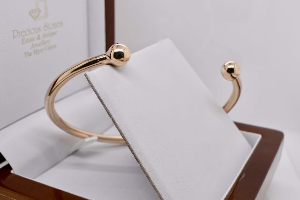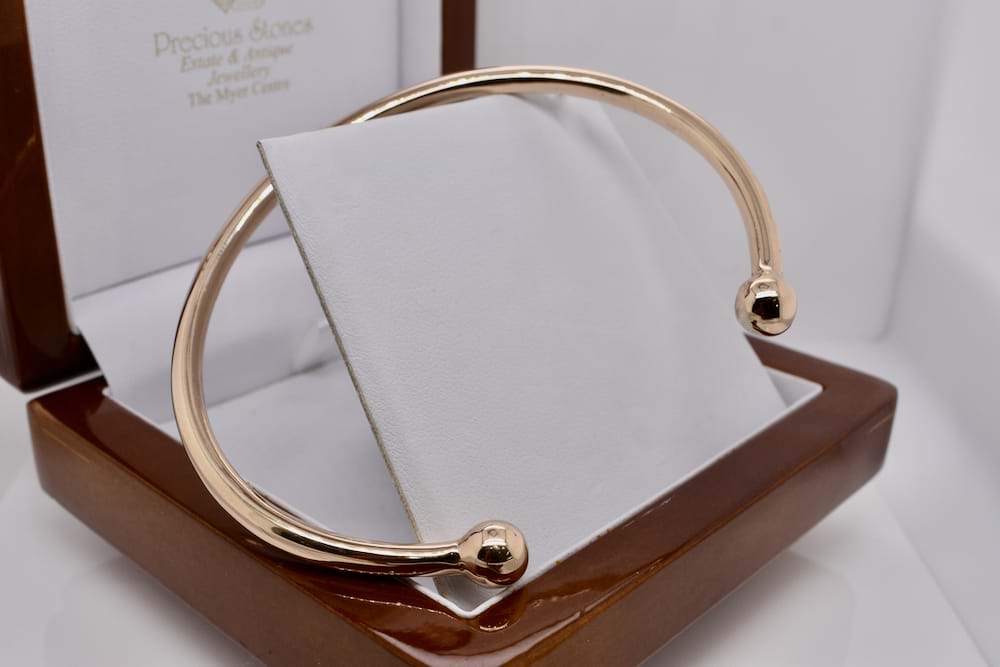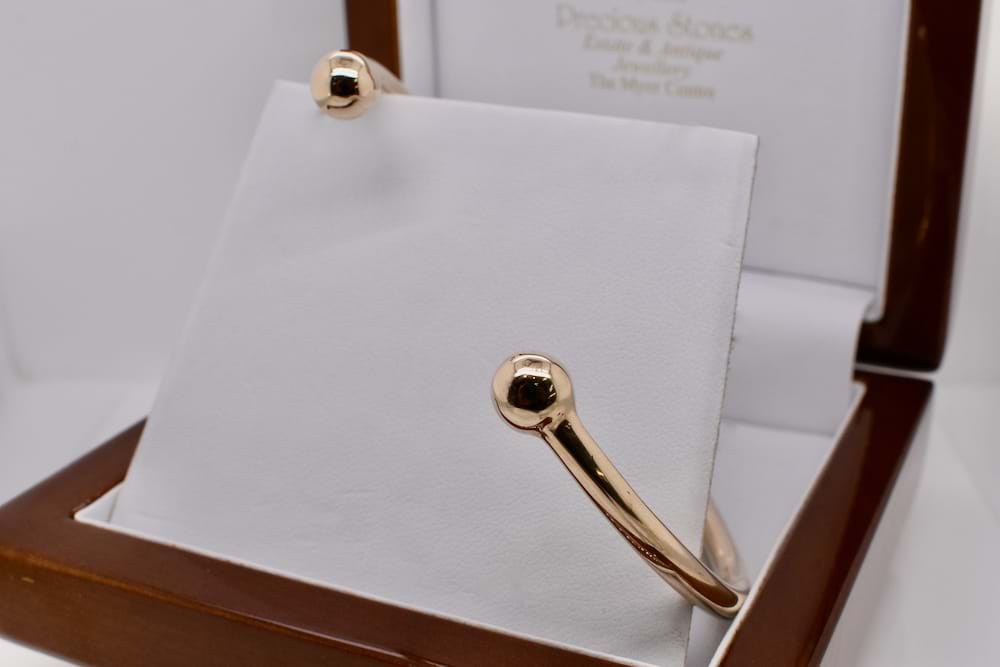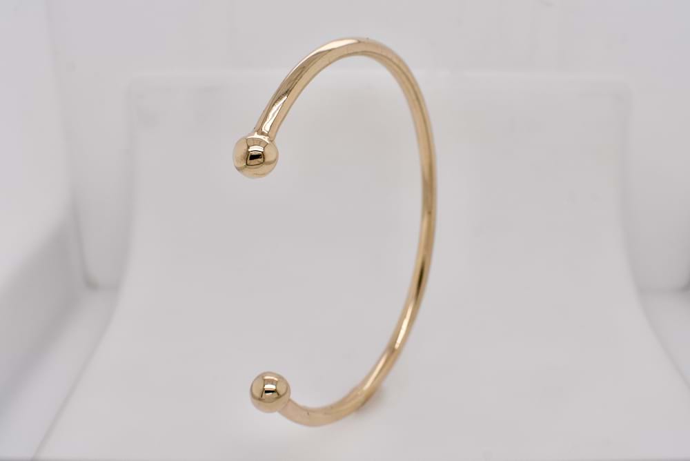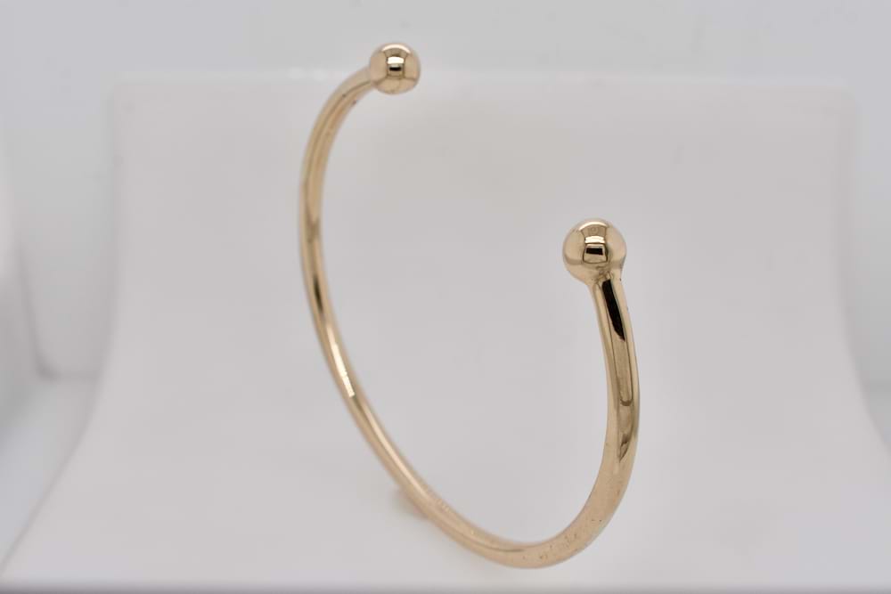 This 9ct yellow gold cuff is perfect for men, being solid in make it is hard wearing, comfortable and easy to take on and off. It has a round profile with a thickness of 8mm and 4mm round ball ends, hand size 70 x 55mm. Total weight 25.60 grams