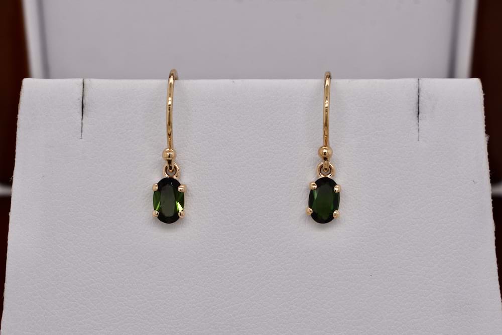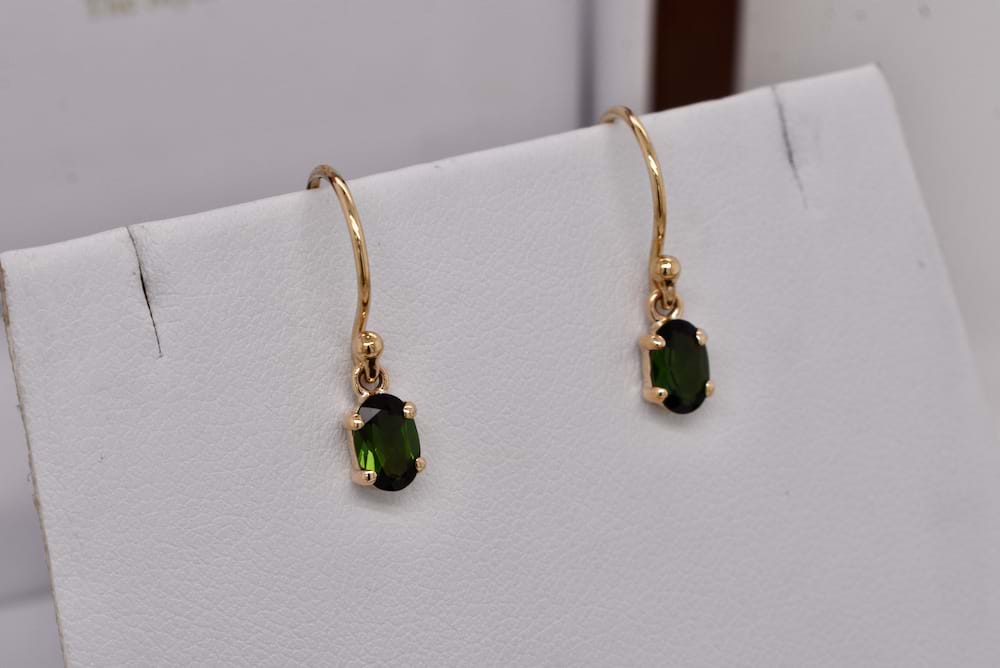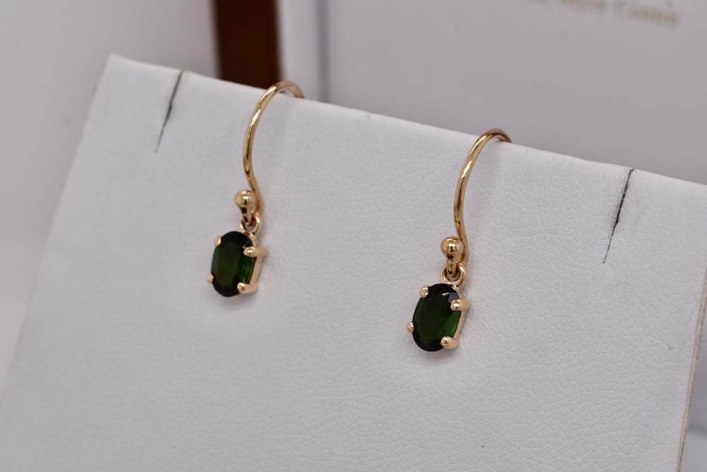 A beautiful pair of matching oval green tourmalines measuring 6.5x4mm four claw set into 9ct yellow gold handmade settings and suspended from shepherd hook fittings