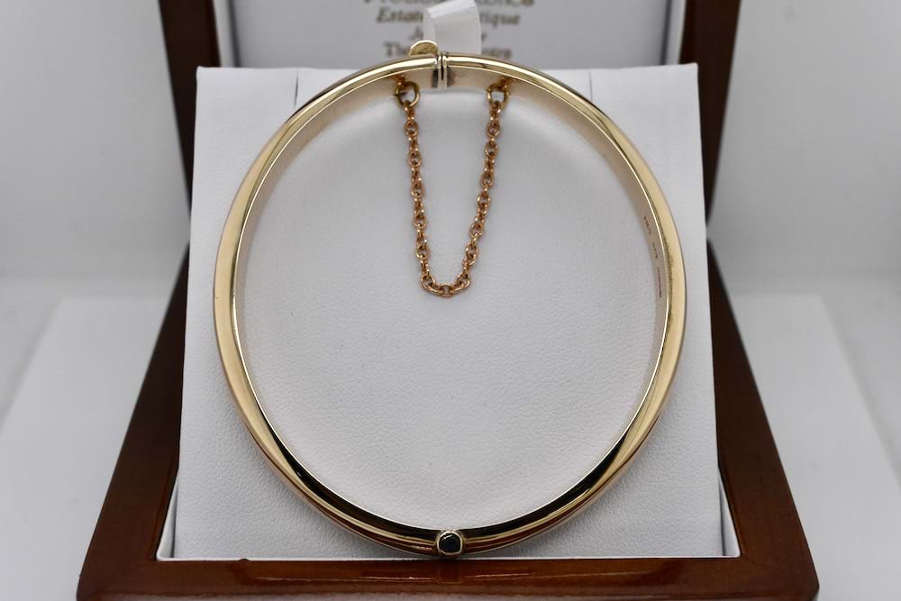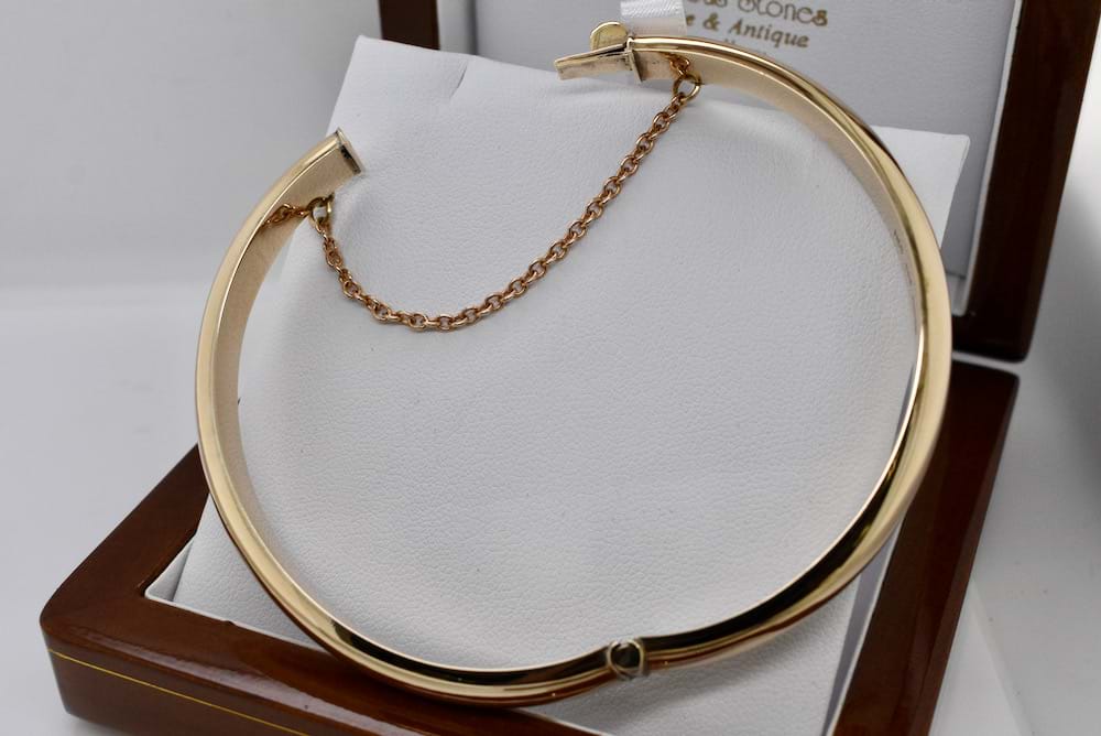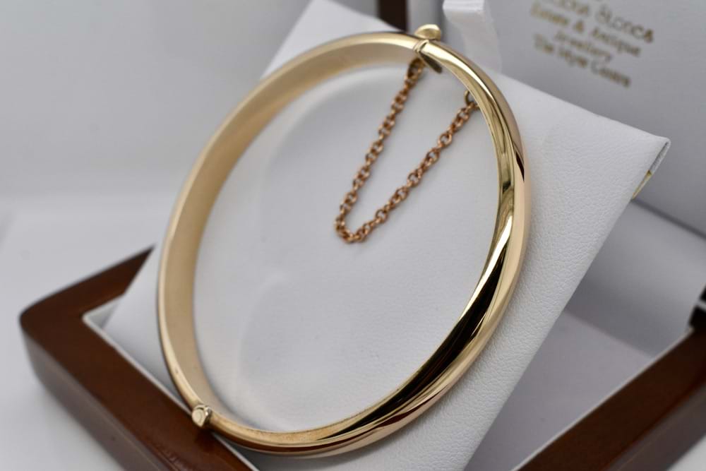 A clasic and timeless 9ct yellow gold hollow bangle with a hinge and safety chain. Measuring 6.8mm wide with an oval internal fitting of 61x55mm, this beautiful bangle weighs 13.91grams and is independently valued for $3,200