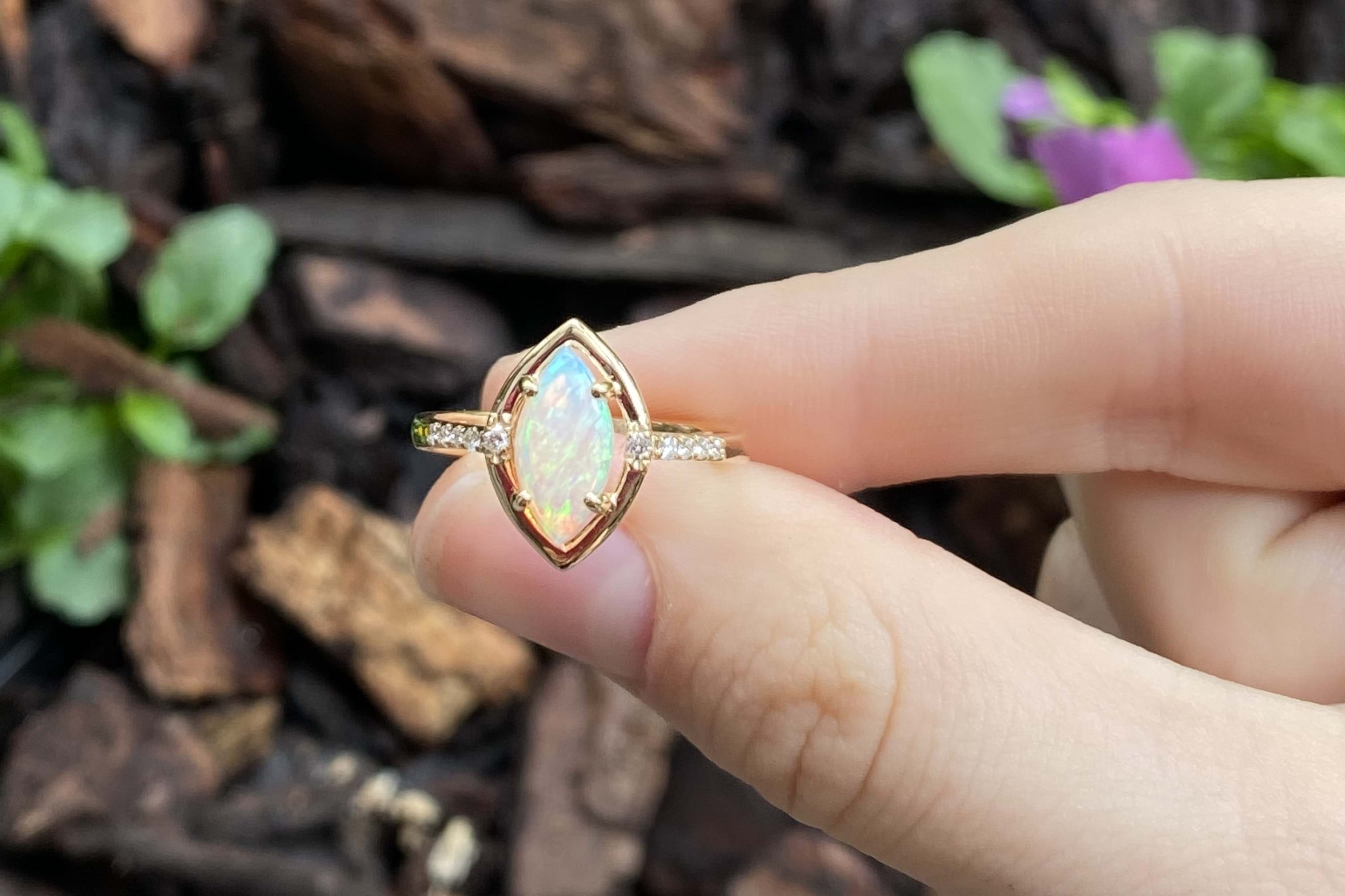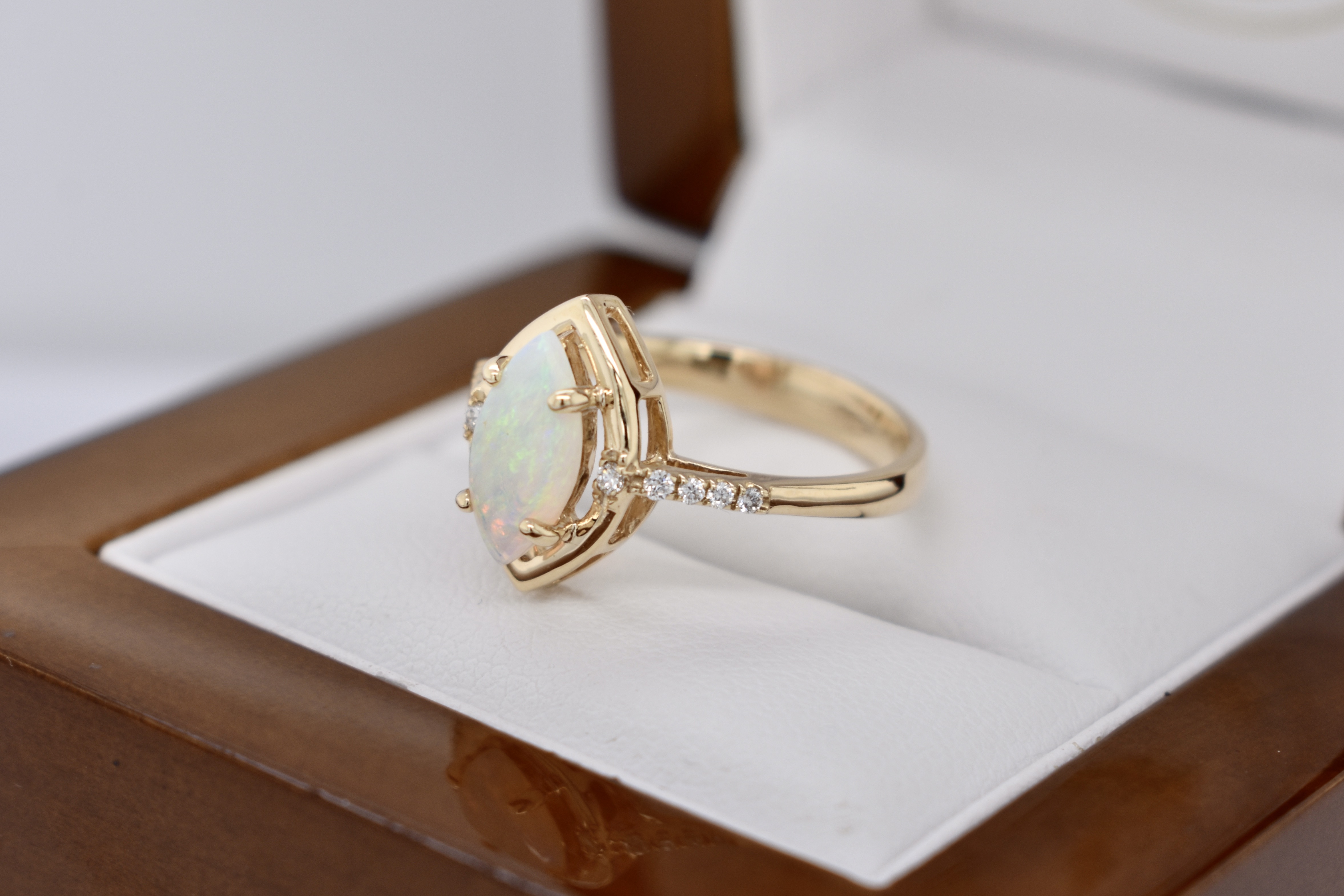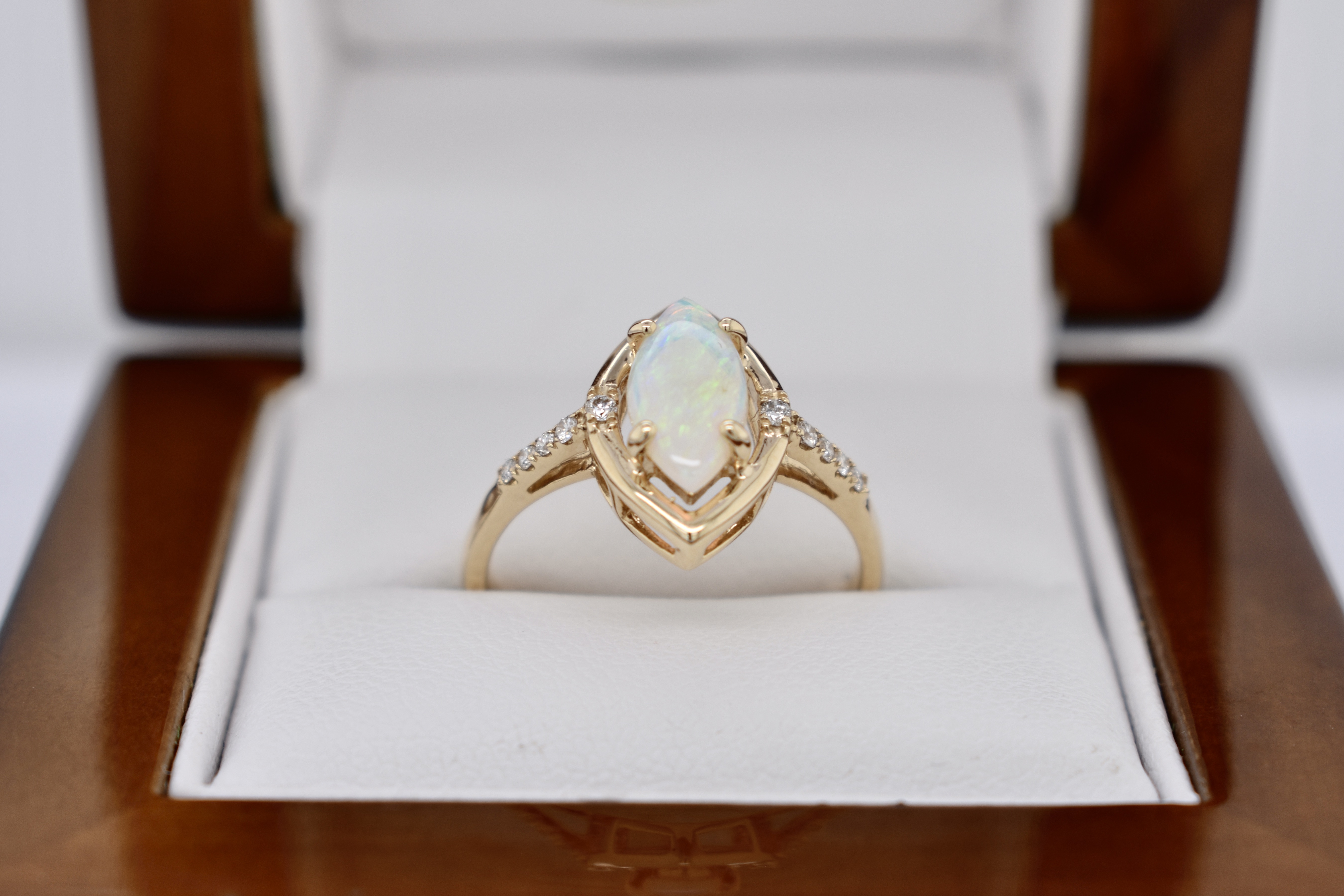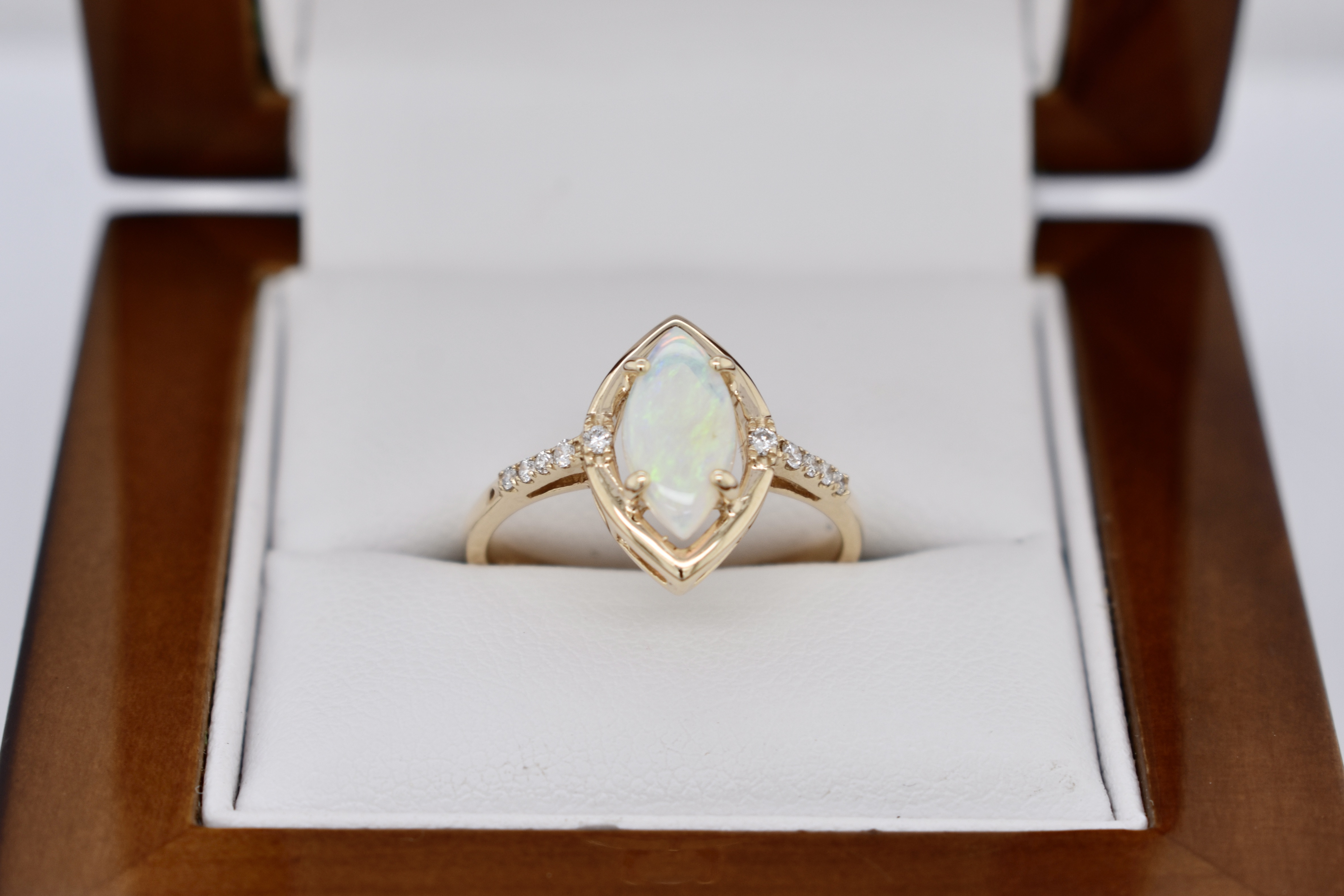 Crafted in 9ct yellow gold, this ring features a white crystal opal measuring 10.4x5.3mm, four claw set with a marquise shaped border and set in 9ct yellow gold. The opal shows green, blue and red flashes throughout and is set with a round brilliant cut diamond on either side and diamonds continuing down the band. Total diamond weight of 0.08ct. Finger size M+.