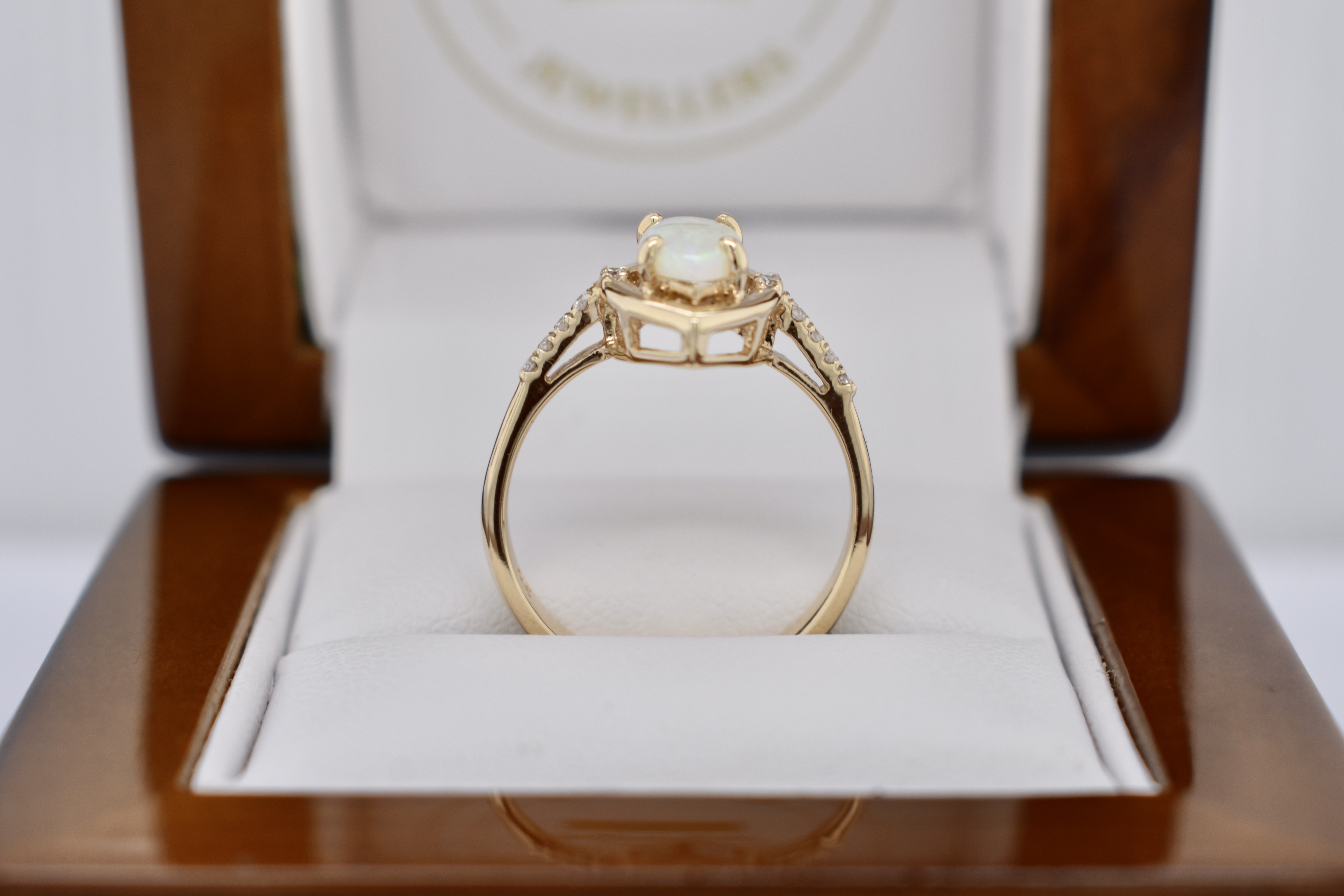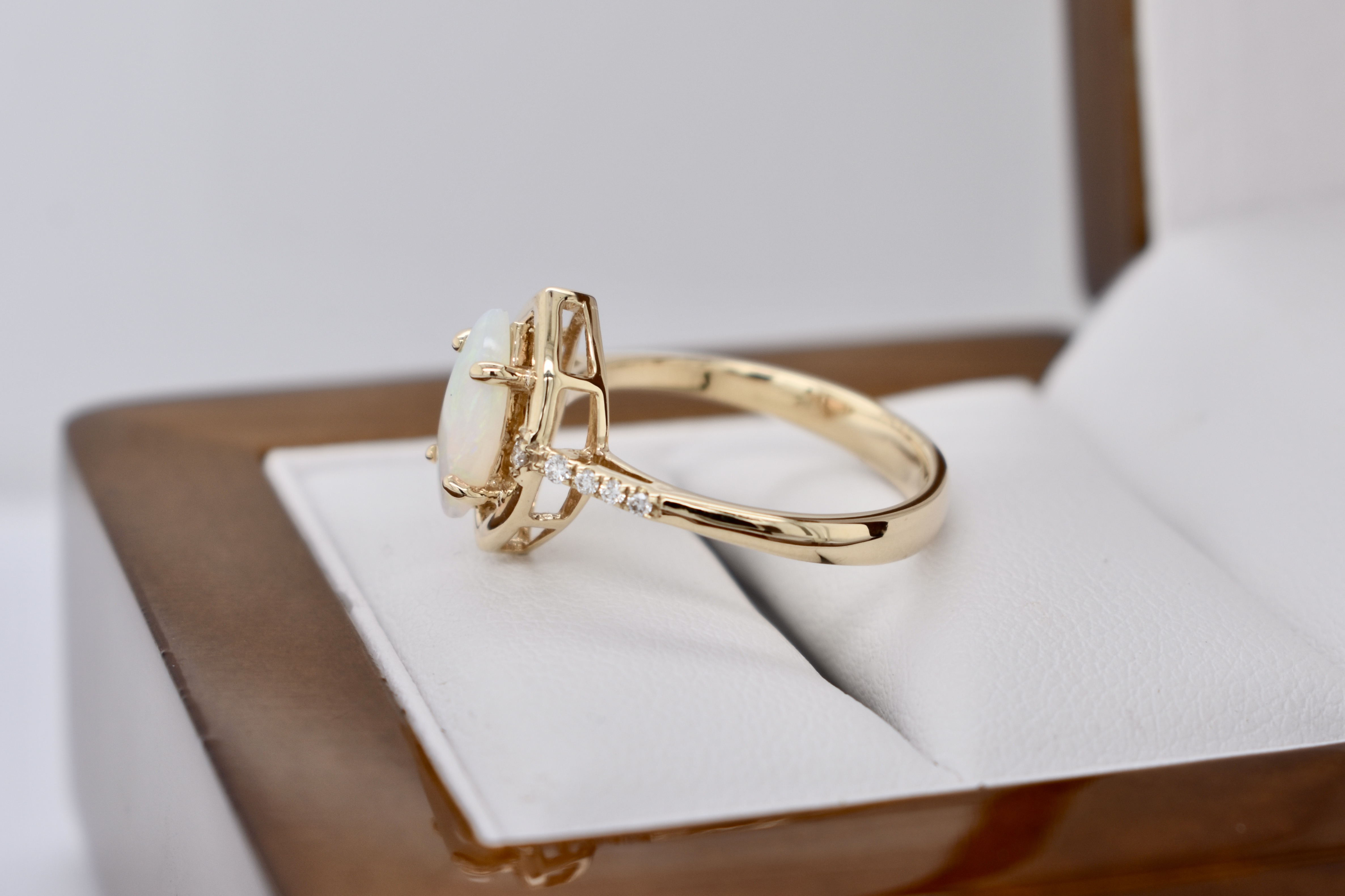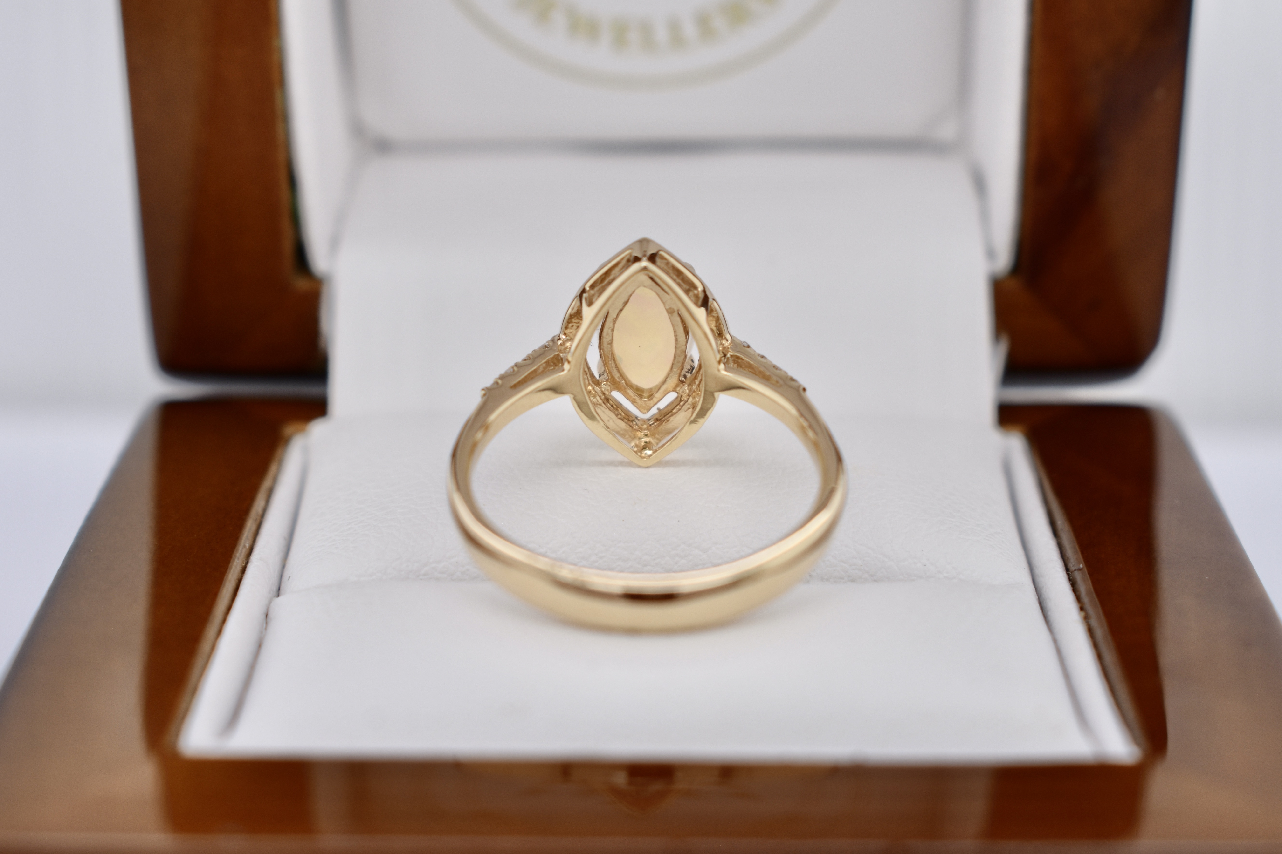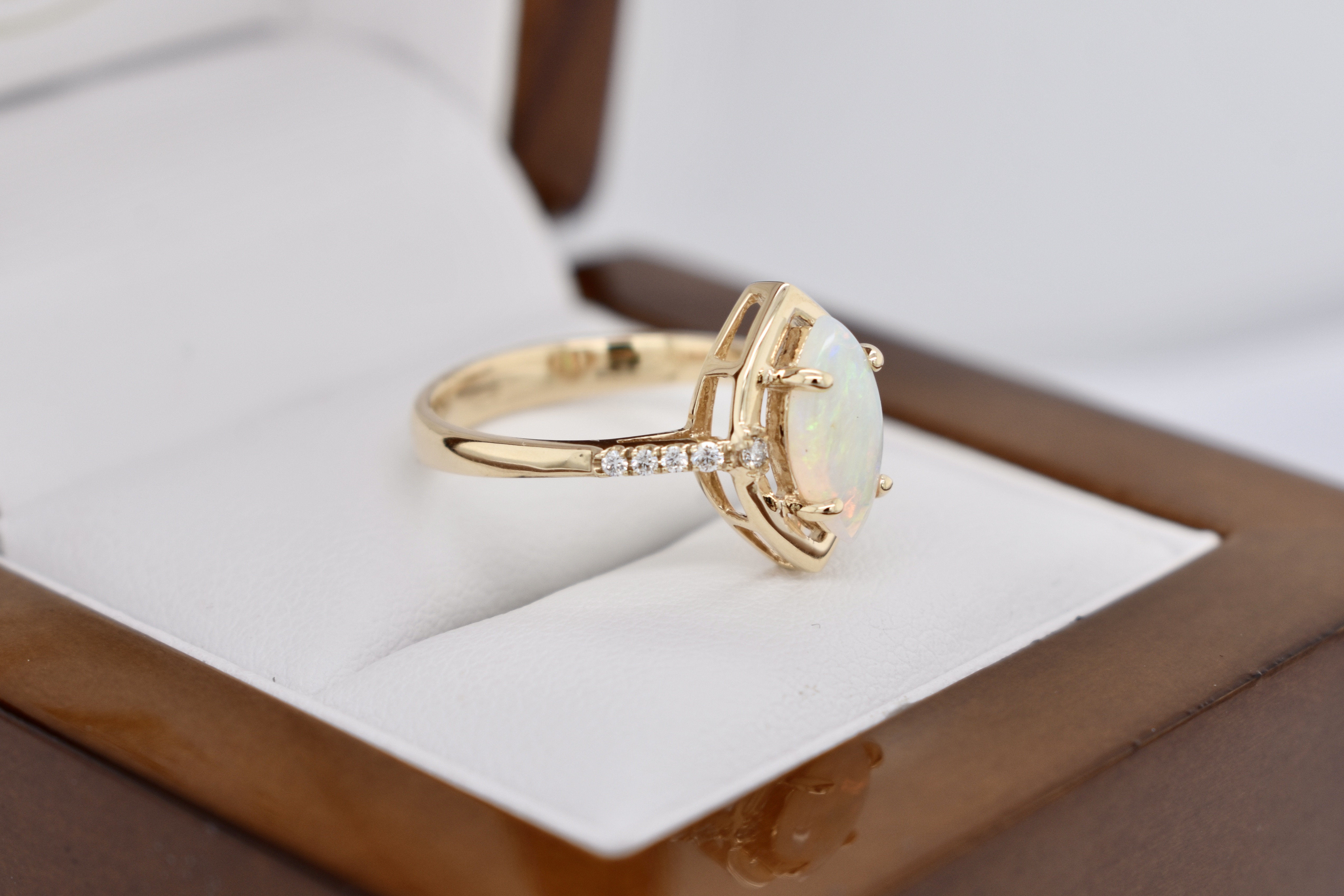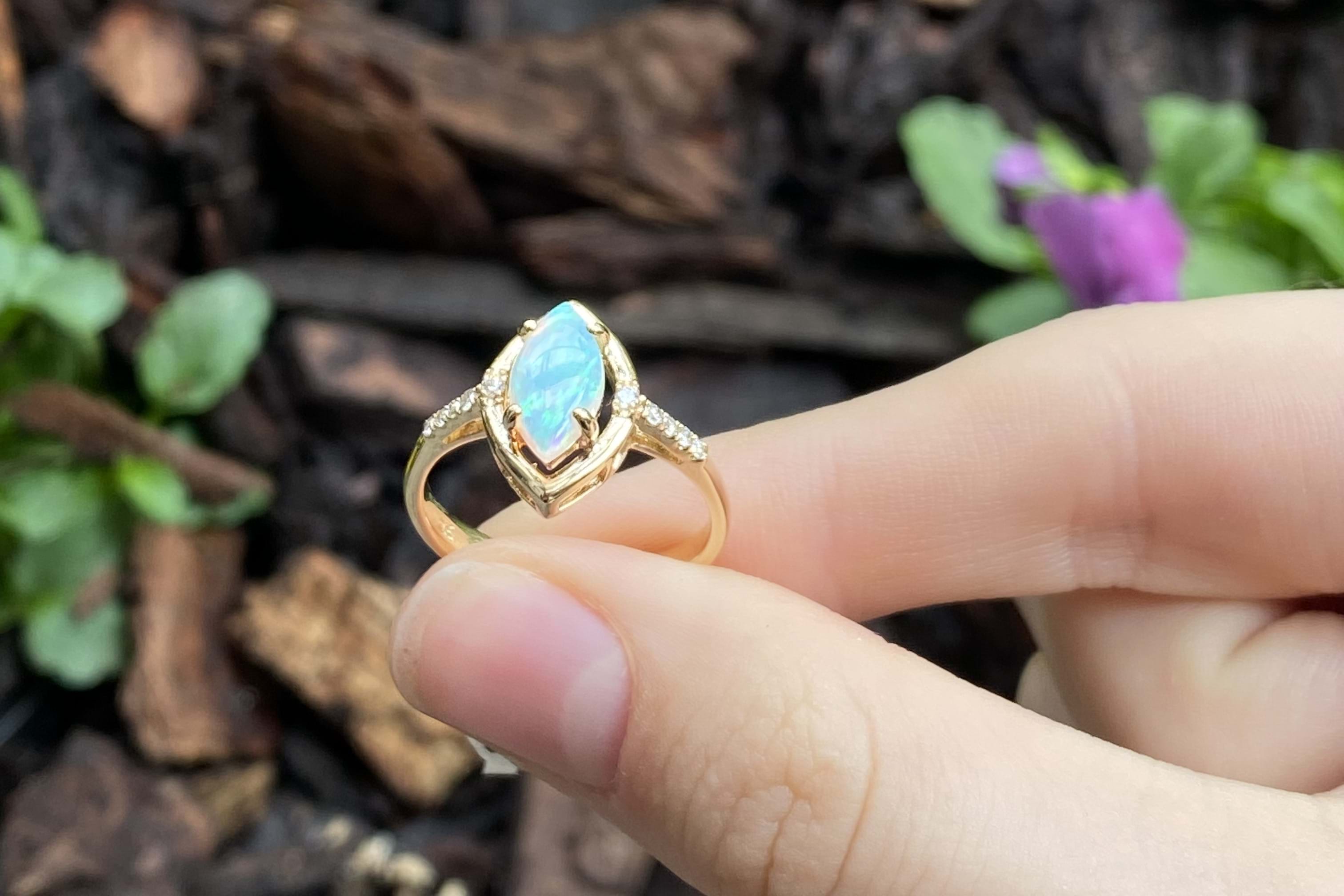 Crafted in 9ct yellow gold, this ring features a white crystal opal measuring 10.4x5.3mm, four claw set with a marquise shaped border and set in 9ct yellow gold. The opal shows green, blue and red flashes throughout and is set with a round brilliant cut diamond on either side and diamonds continuing down the band. Total diamond weight of 0.08ct. Finger size M+.