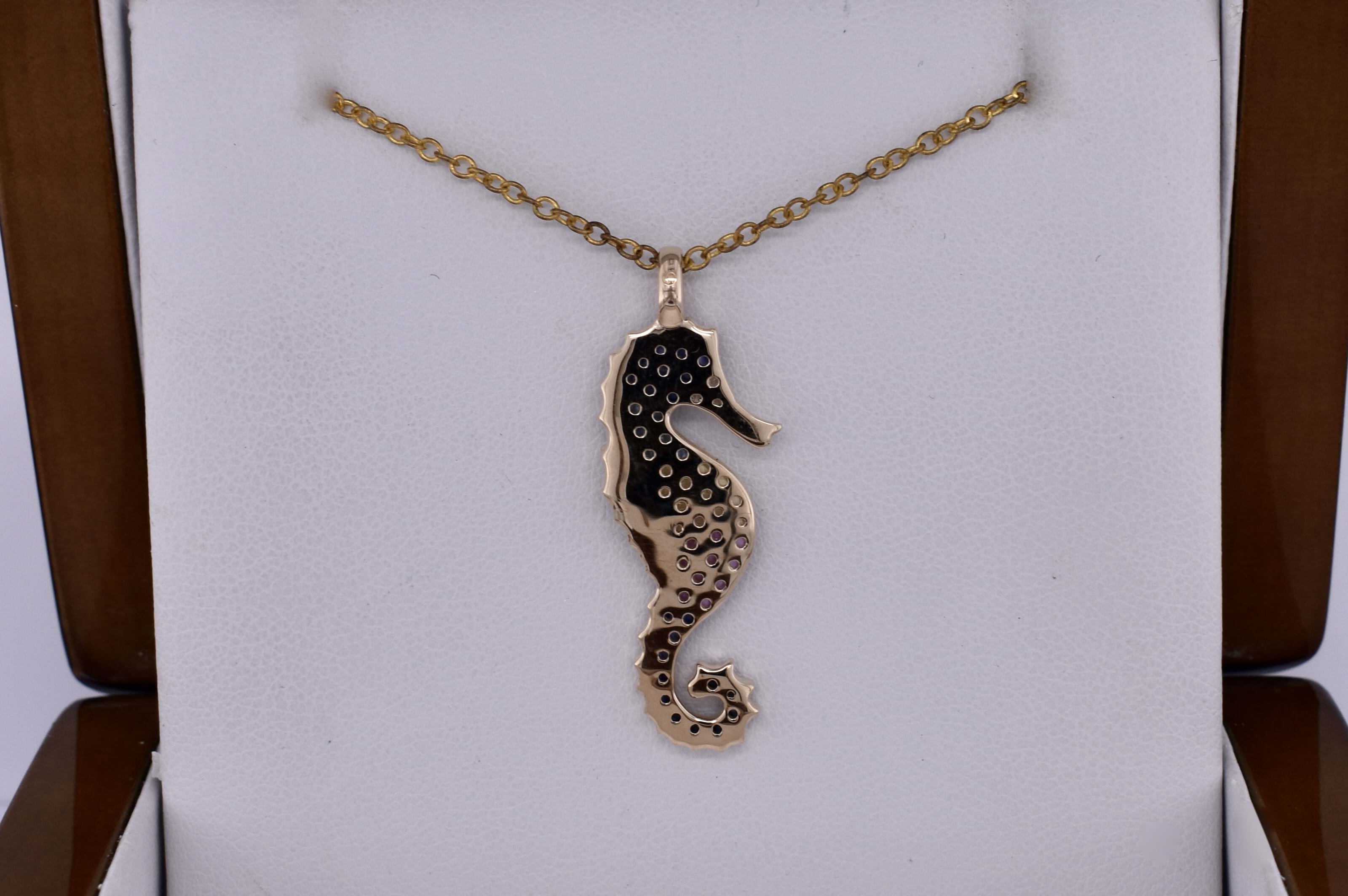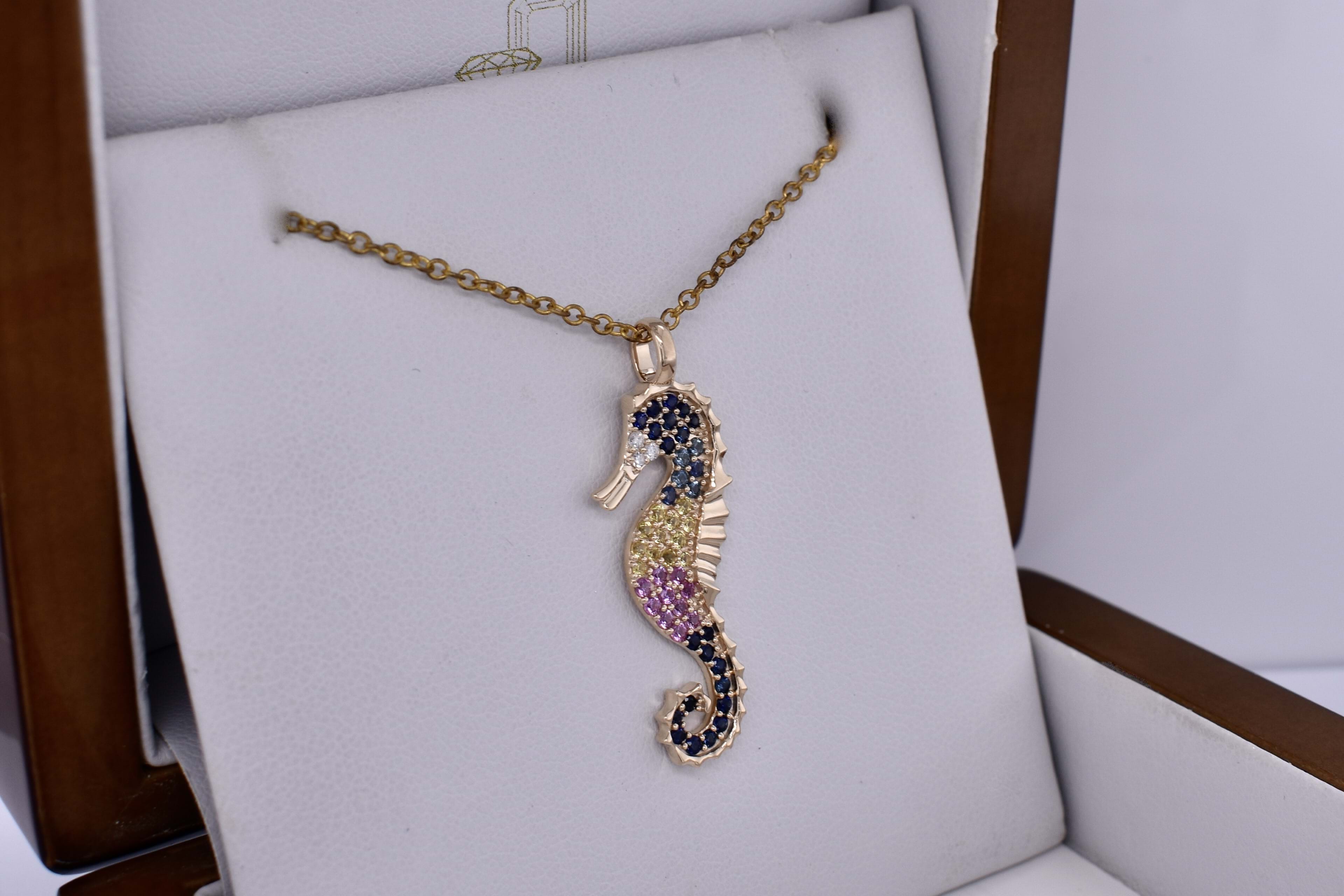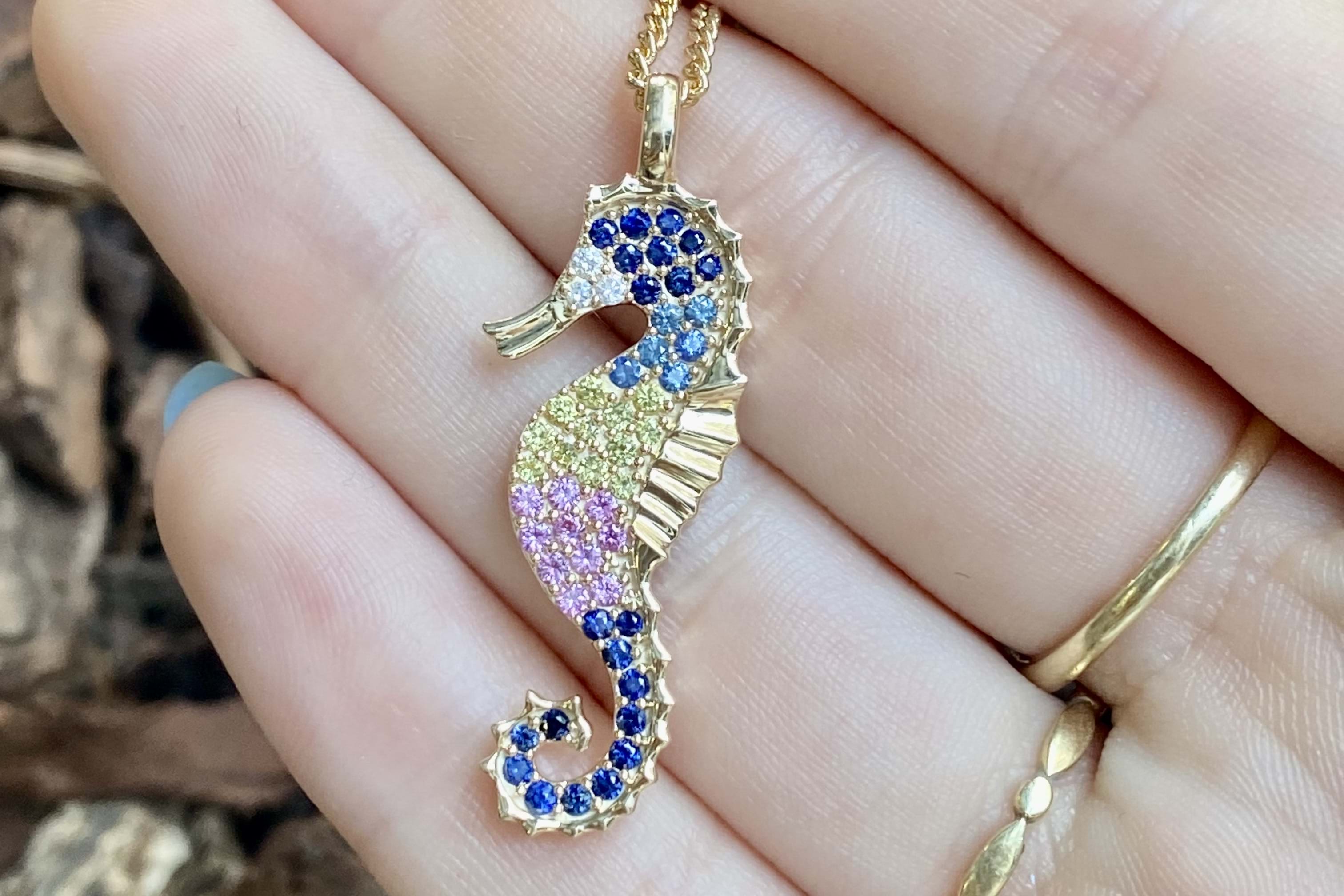 This gorgeous seahorse shaped pendant is set with a coloured arrangement of round sapphires & diamonds. It includes 0.80cts of pink, yellow and blue sapphires and 0.04ct of GH SI diamonds. Finished with a plain bale. Chains are available for separate purchase.