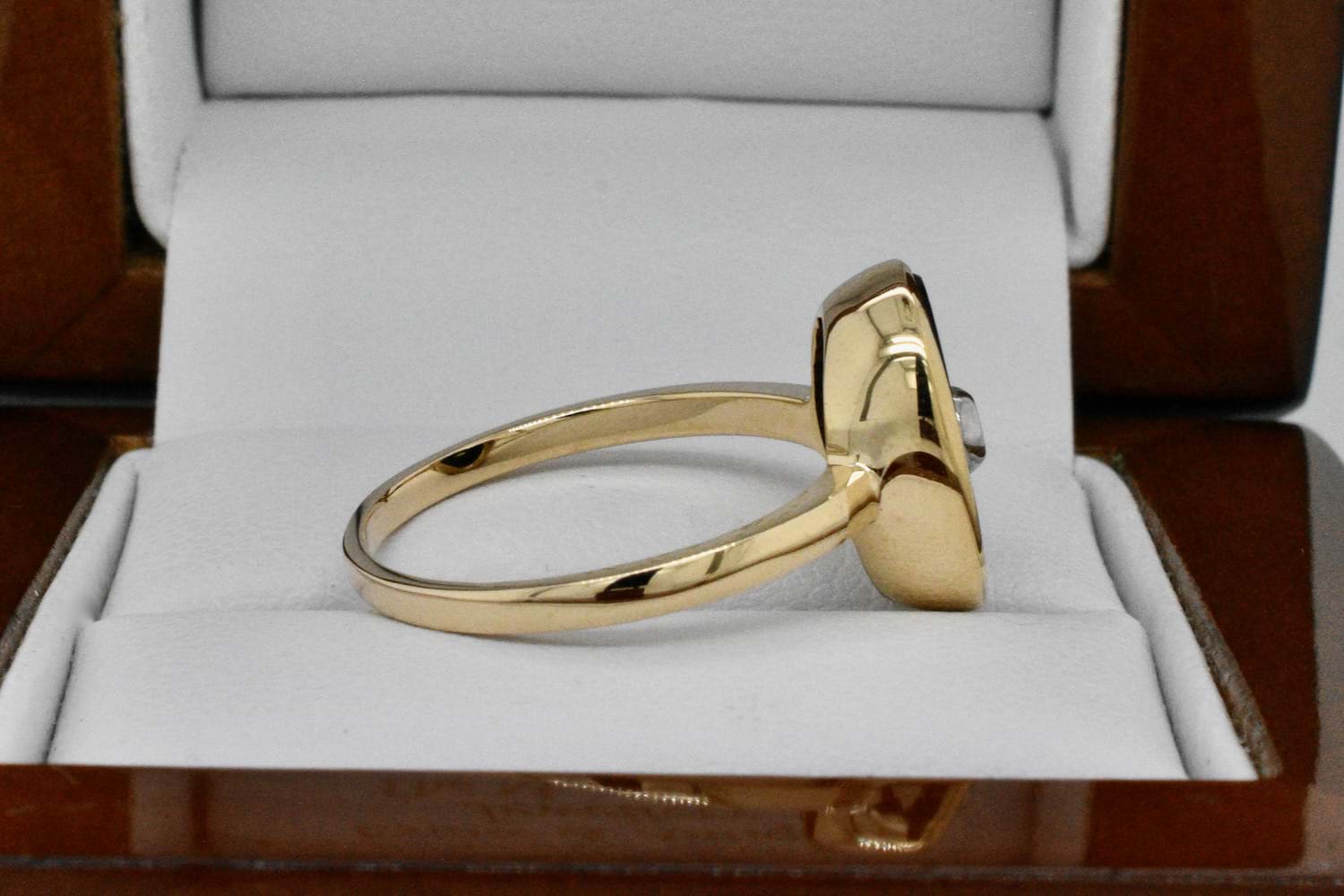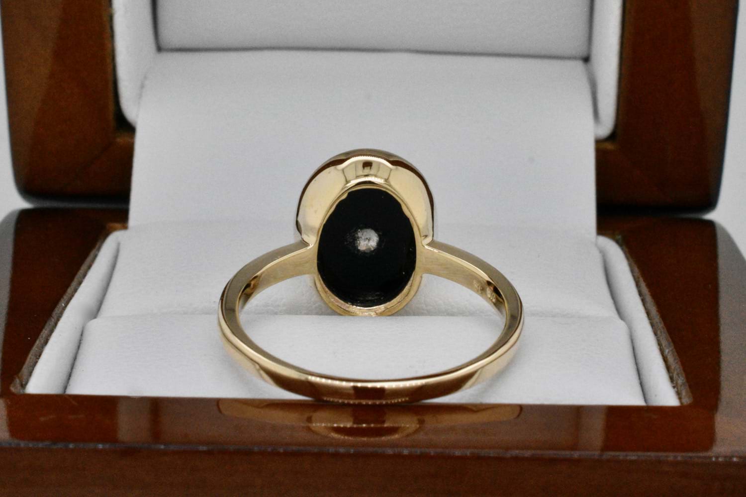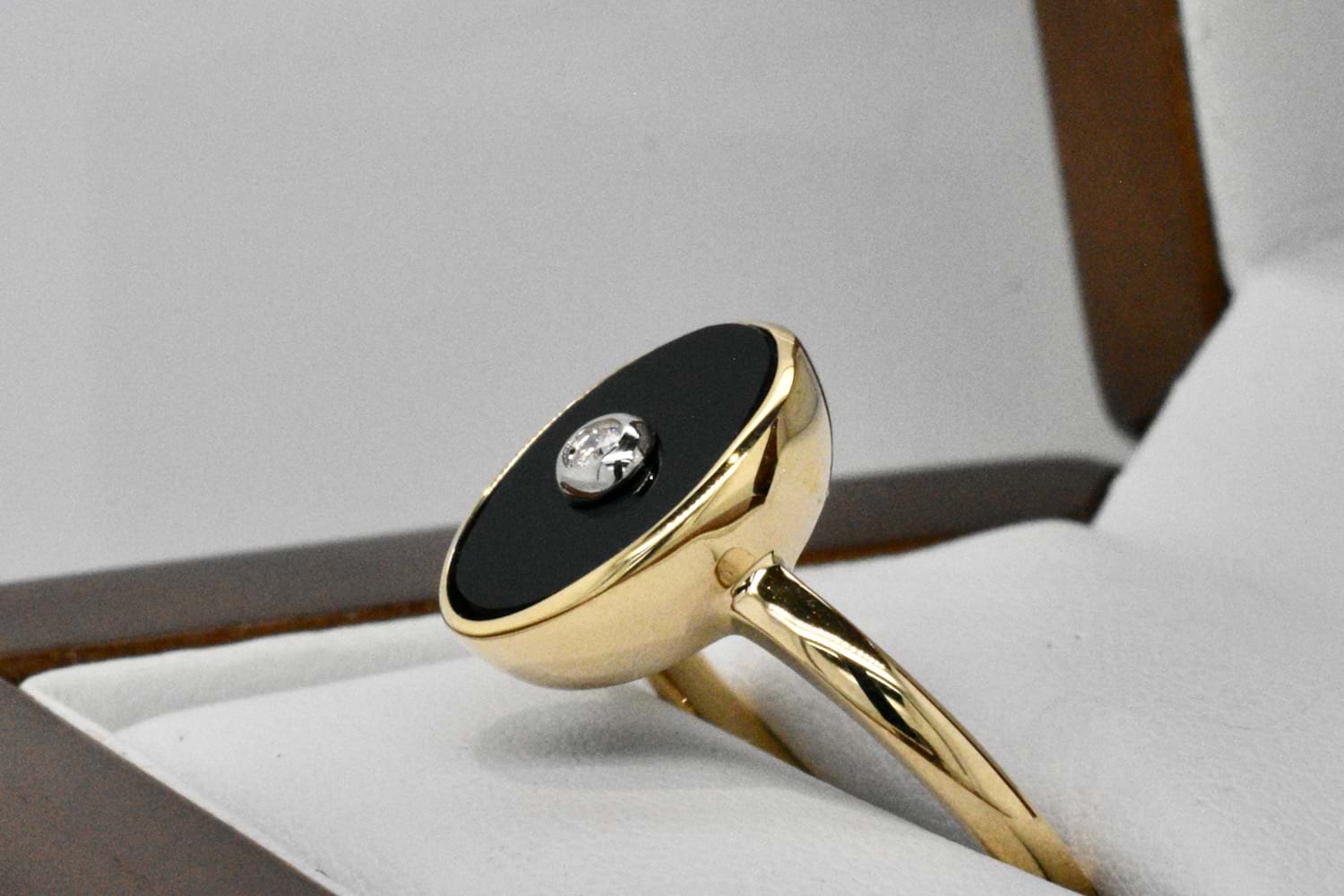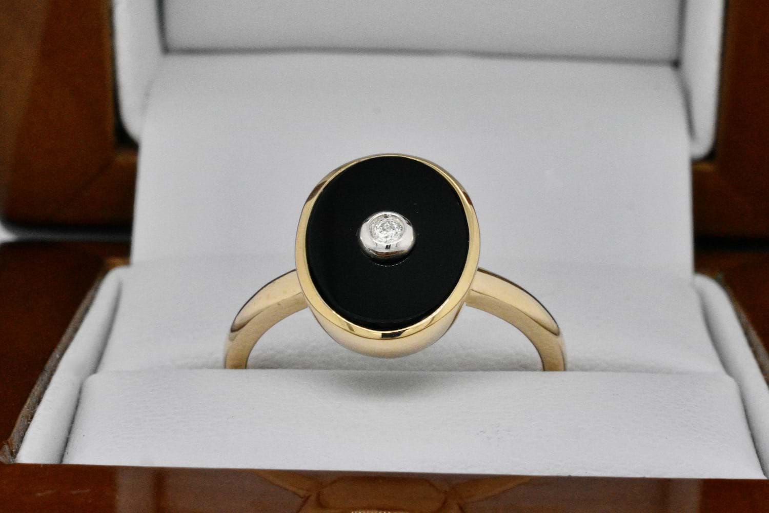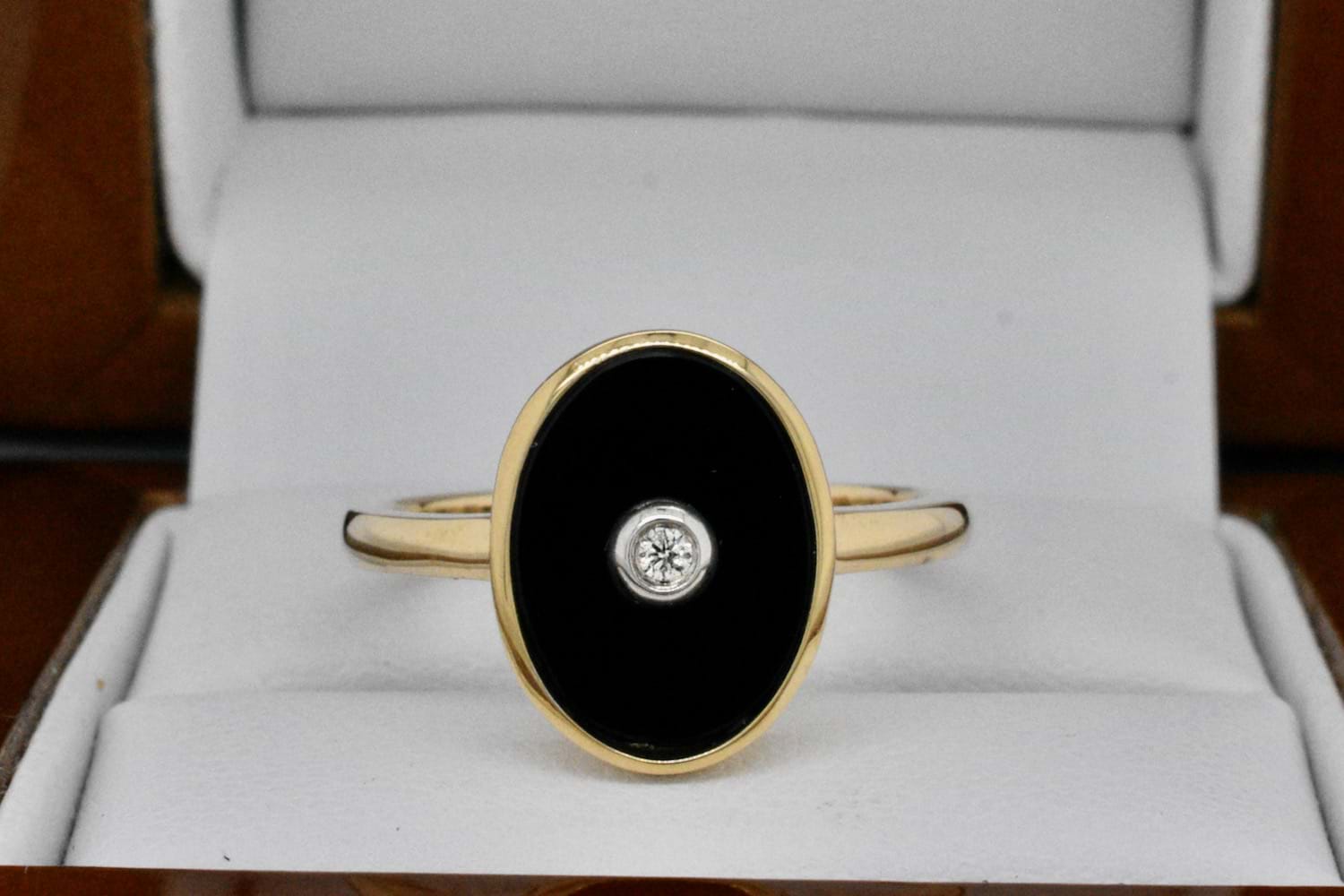 A timeless, classic onyx ring crafted in 9ct yellow gold with an oval piece of onyx measuring approximately 13.7 x 10.7mm, bezel set and with a bezel set RBC diamond in the centre on a plain band. Finger size P