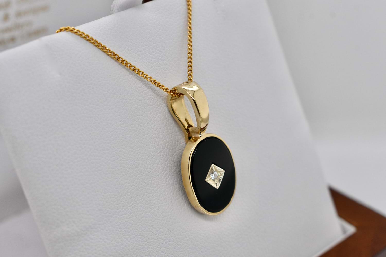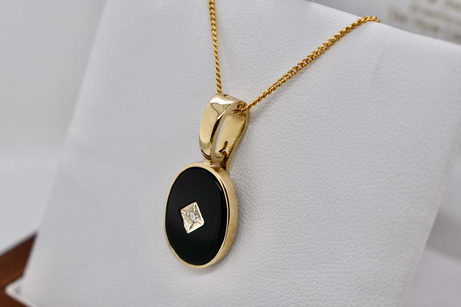 A simple and classic 9ct yellow gold onyx and diamond enhancer featuring an oval panel of black onyx yellow gold bezel set with a shimmering 0.03ct round diamond white gold bezel set in the center and a plain enhancer bale. Onyx measures approx 16x12mm. Chains are available for separate purchase