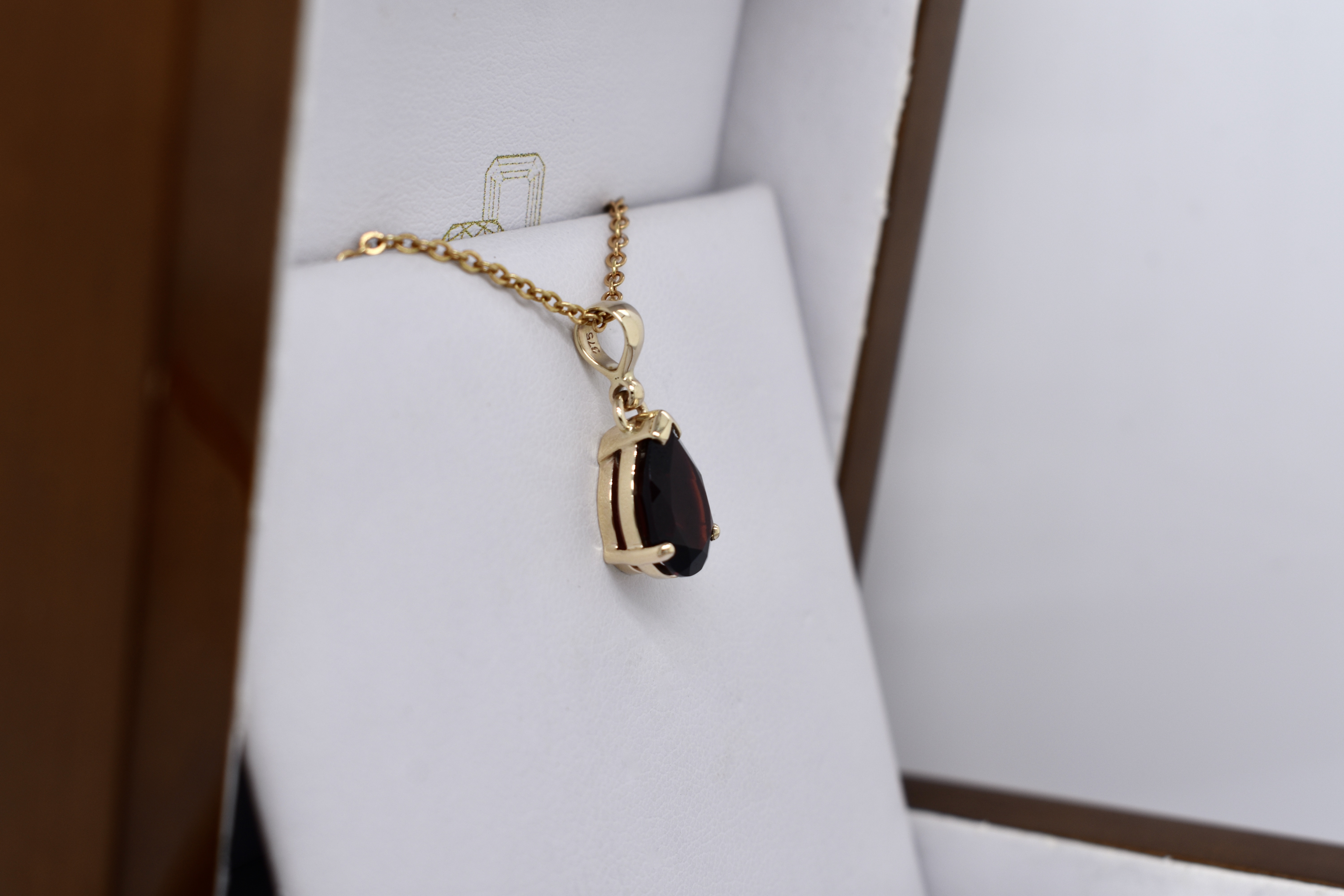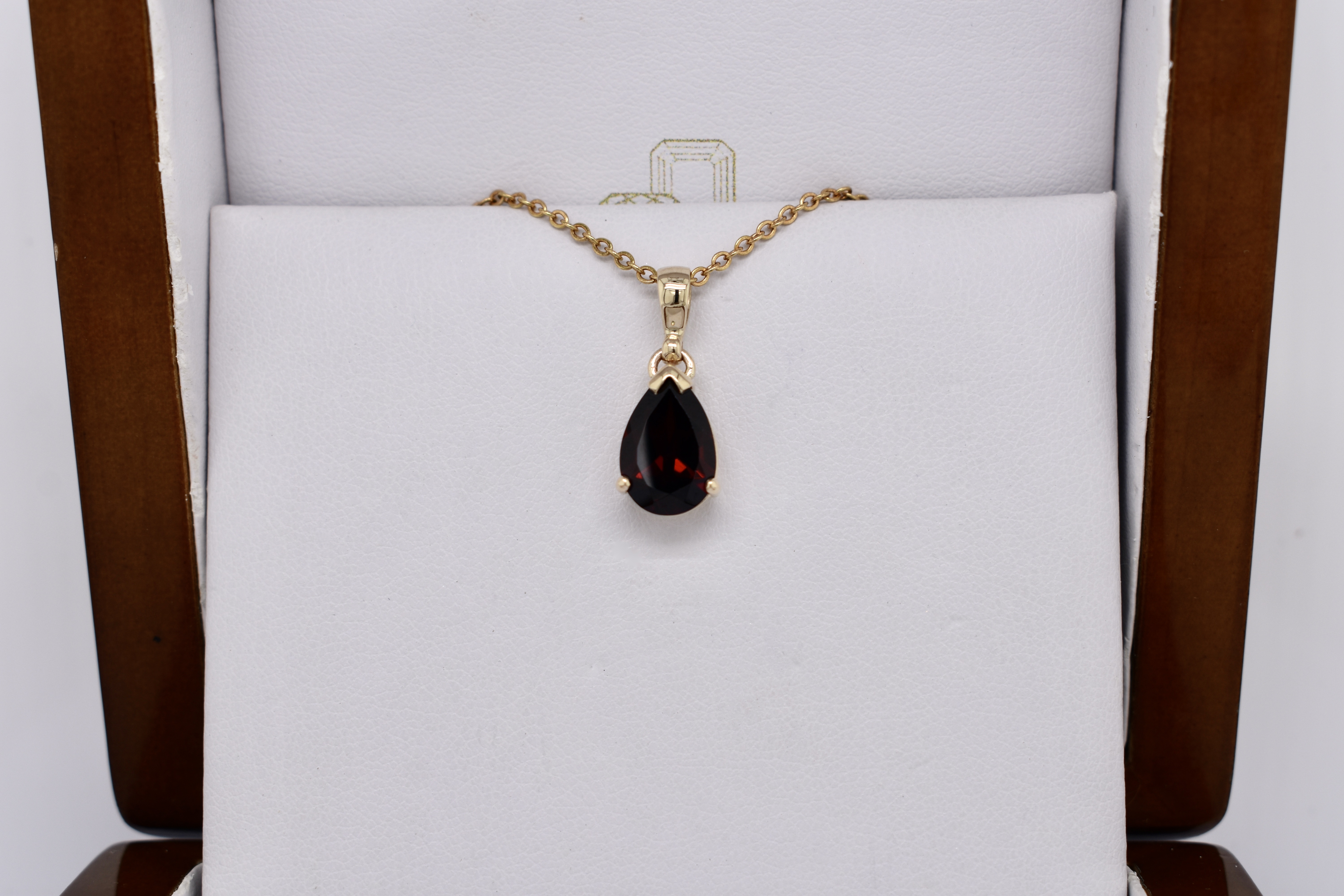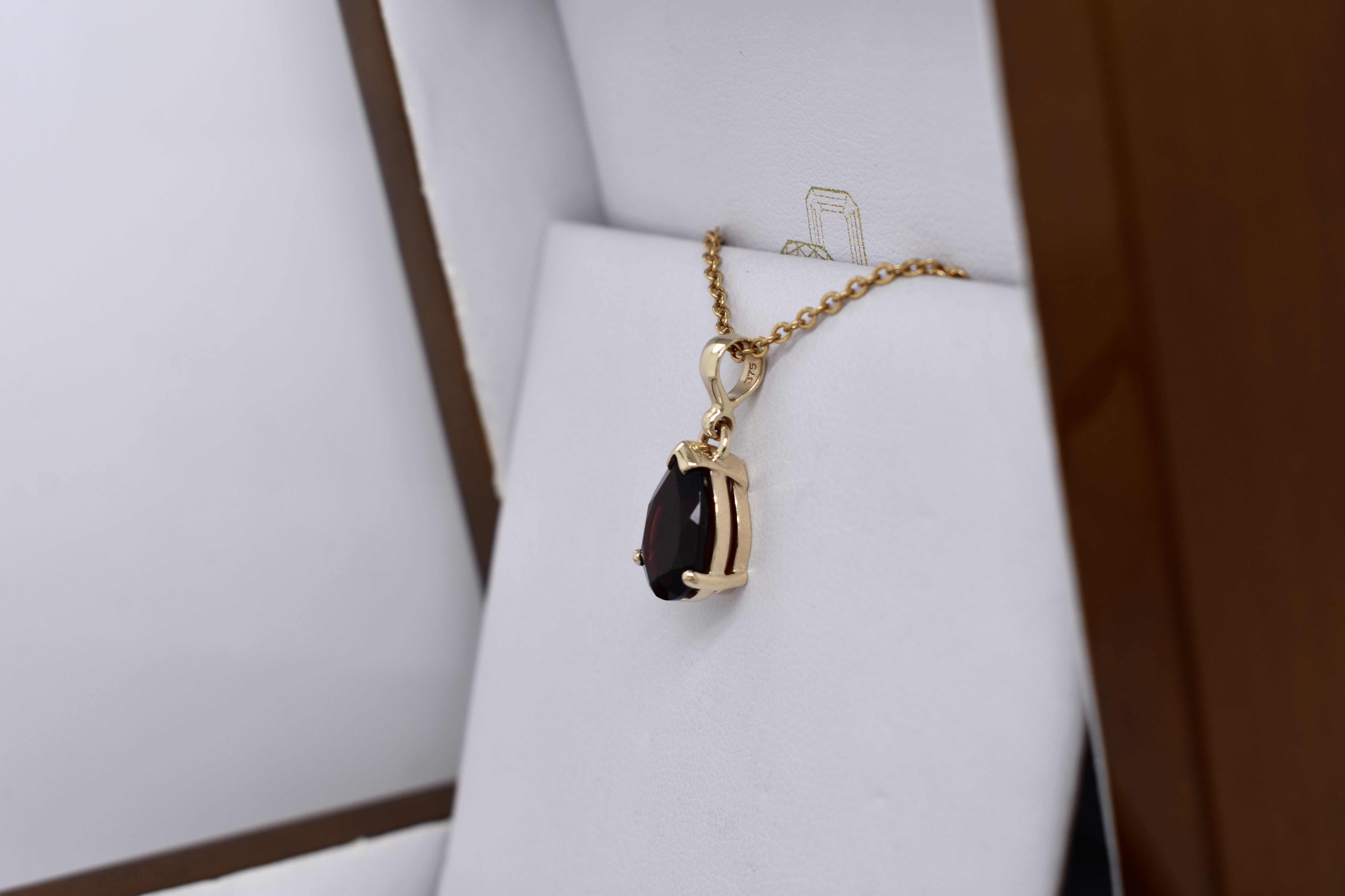 Timeless handmade 9ct yellow gold pendant, featuring a pear shaped 12.5x8.0mm garnet, two claw and cap set with a plain pendant bale. Chains are available for separate purchase.