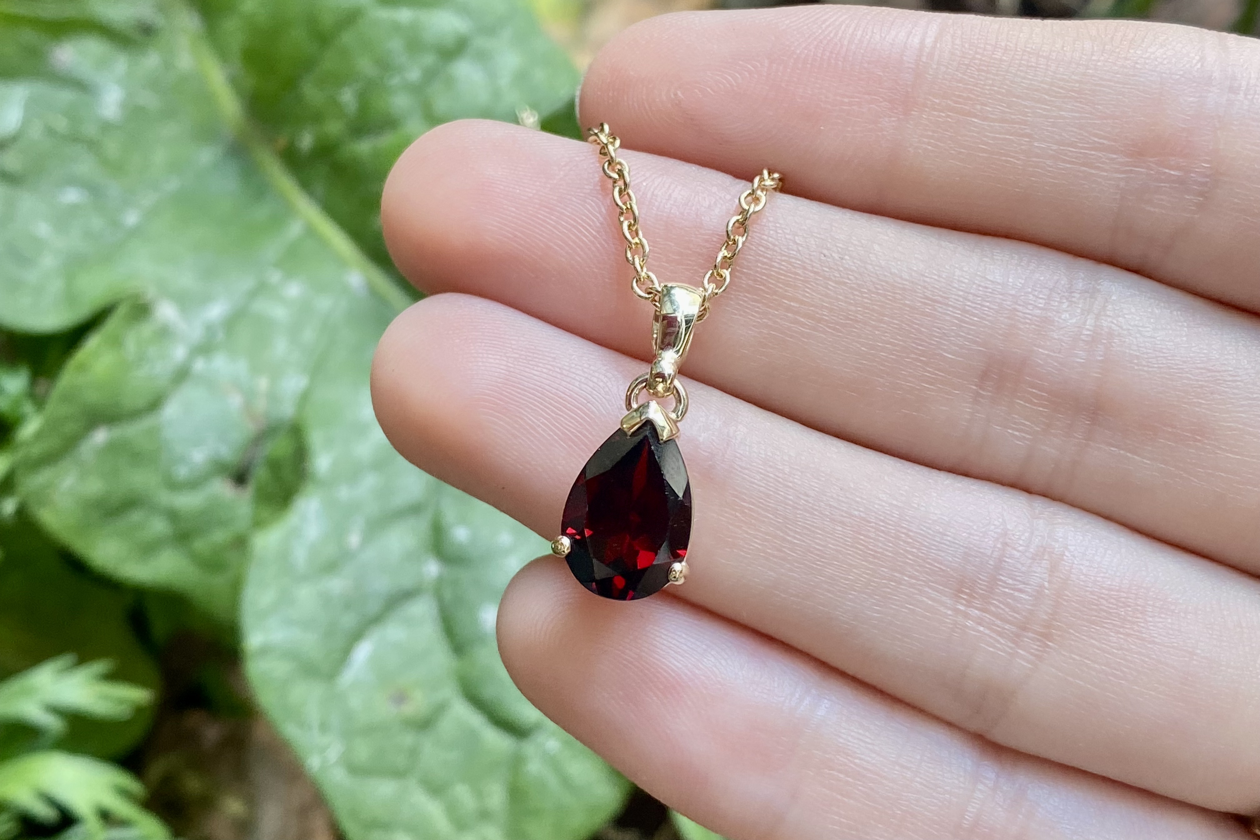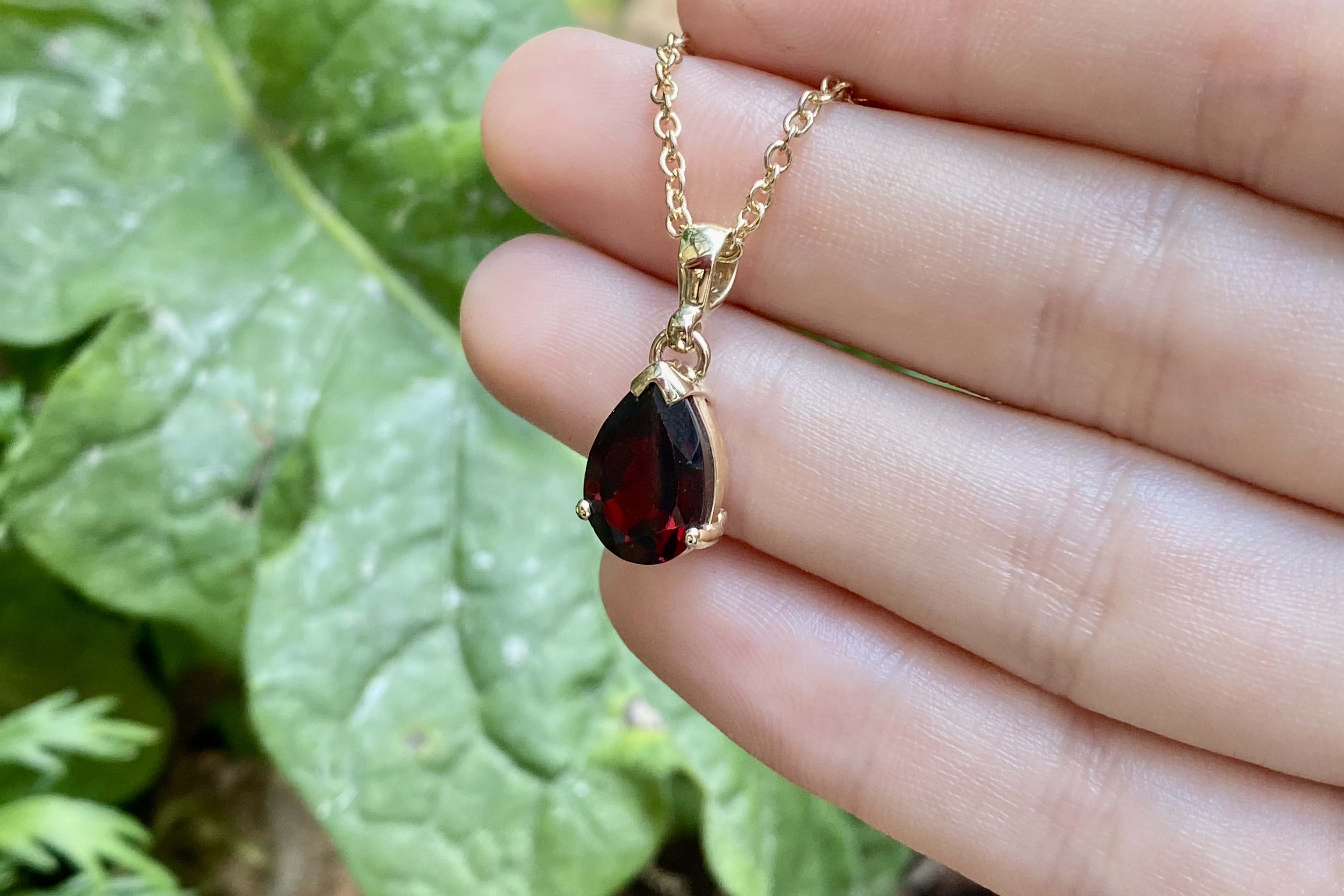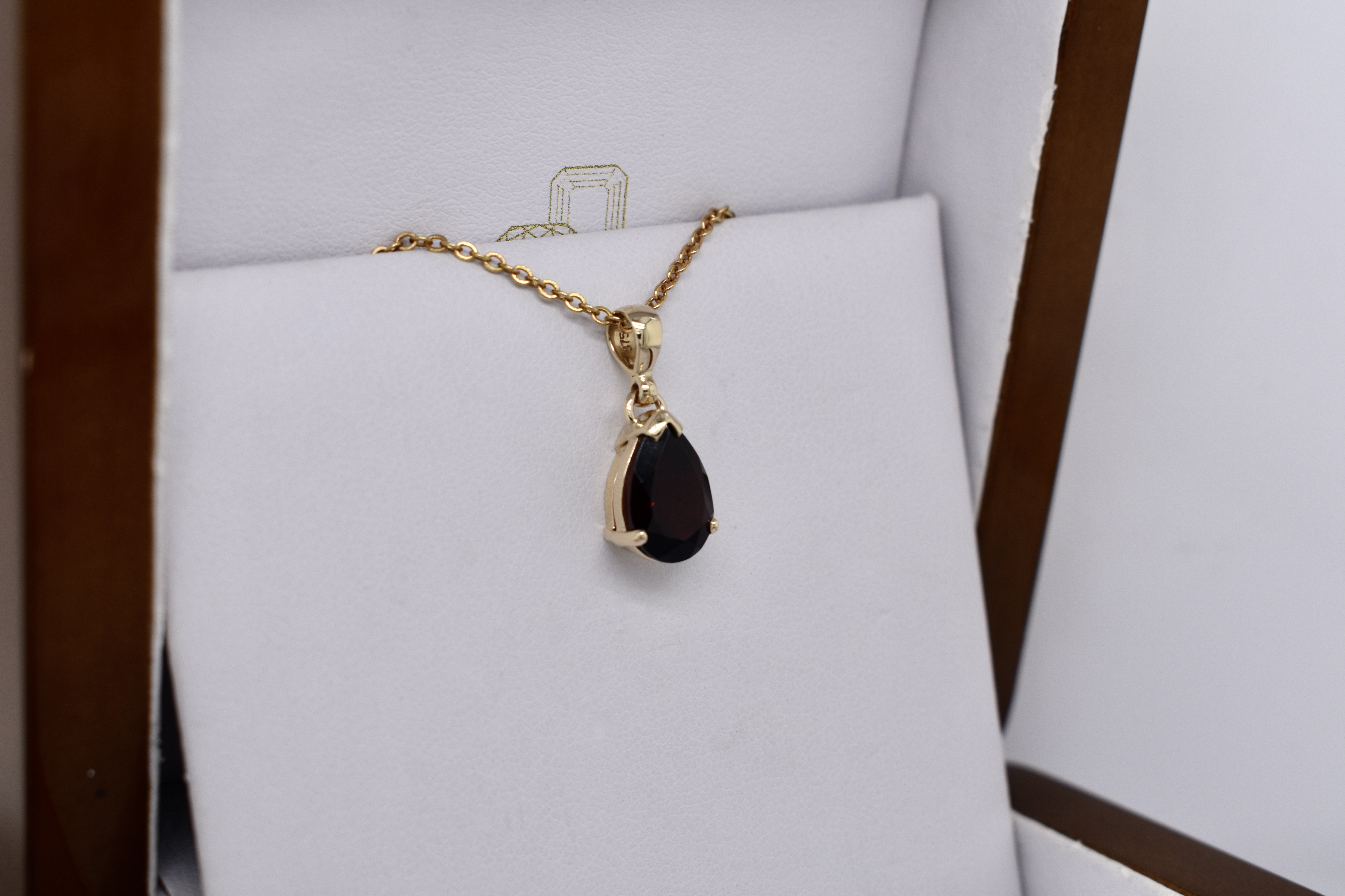 Timeless handmade 9ct yellow gold pendant, featuring a pear shaped 12.5x8.0mm garnet, two claw and cap set with a plain pendant bale. Chains are available for separate purchase.