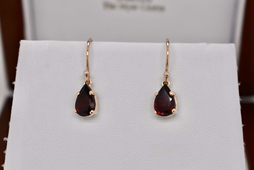 Handmade in 9ct yellow gold these simple four claw drop earrings featuring pearshape garnets measuring 9x6mm with shepherd hook fittings