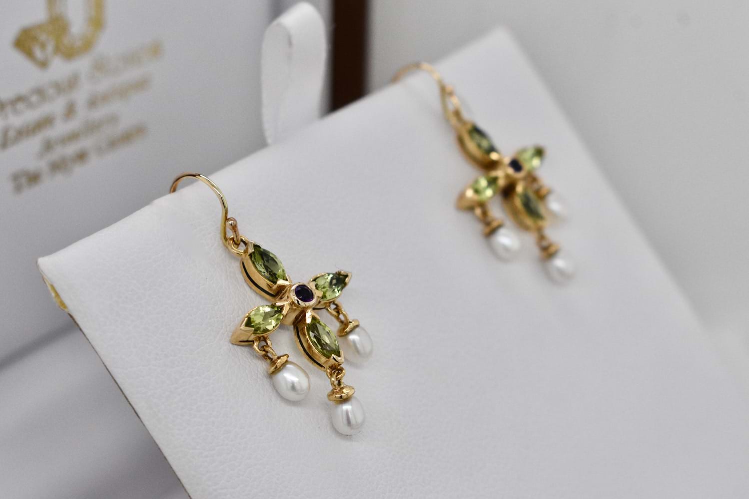 SOLD 9ct Yellow Gold Peridot, Amethyst & Seed Pearl Earrings