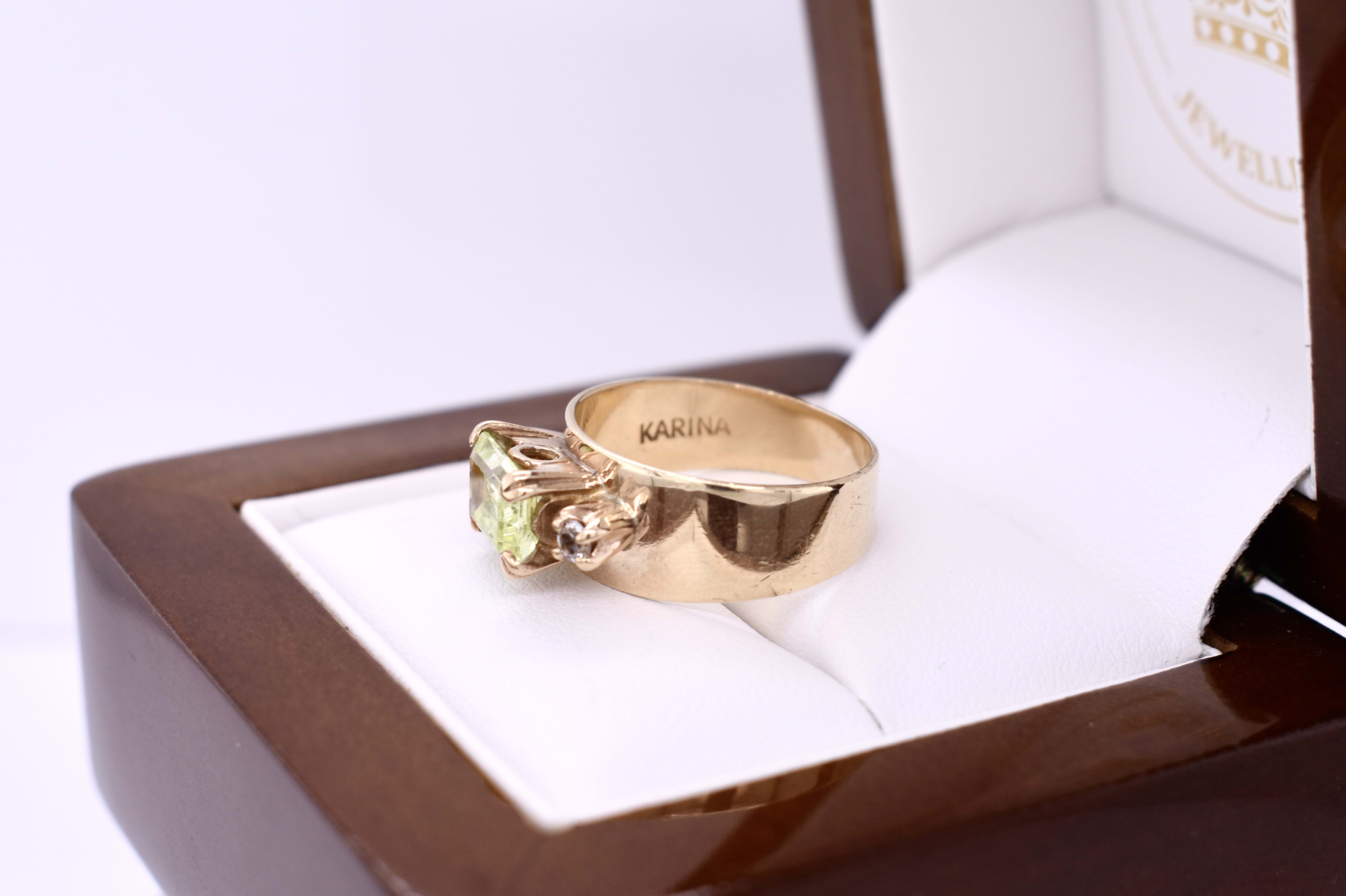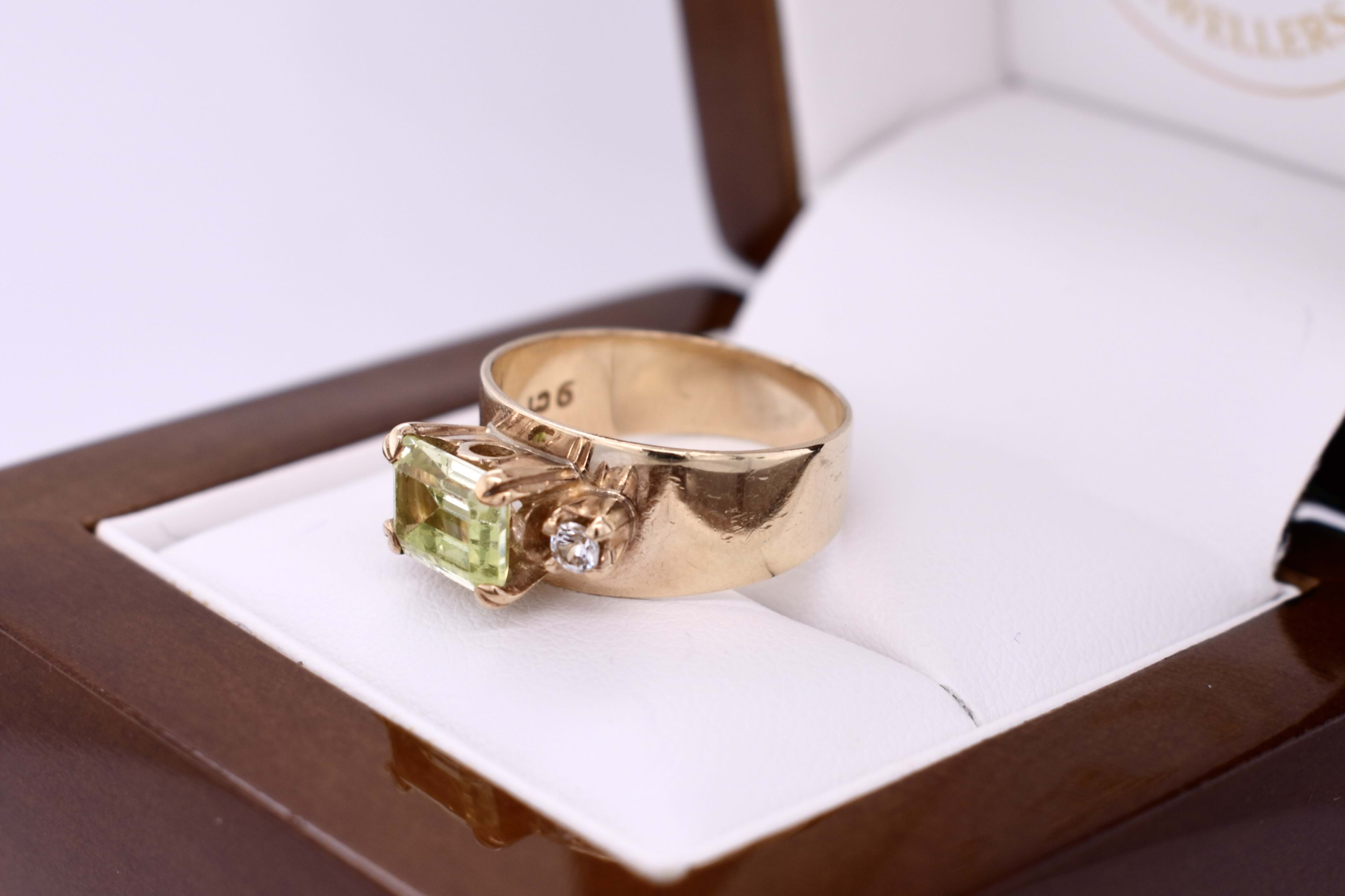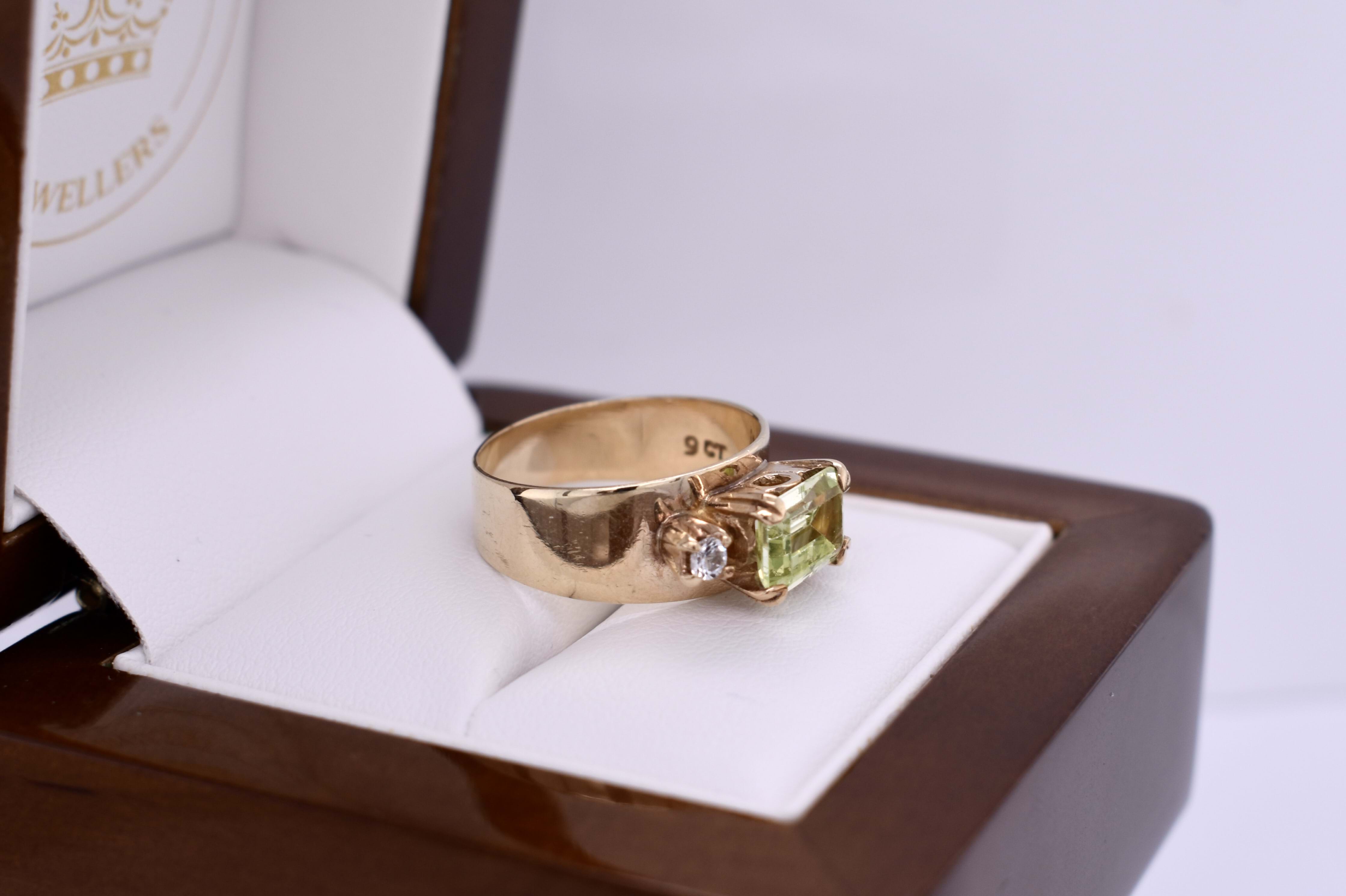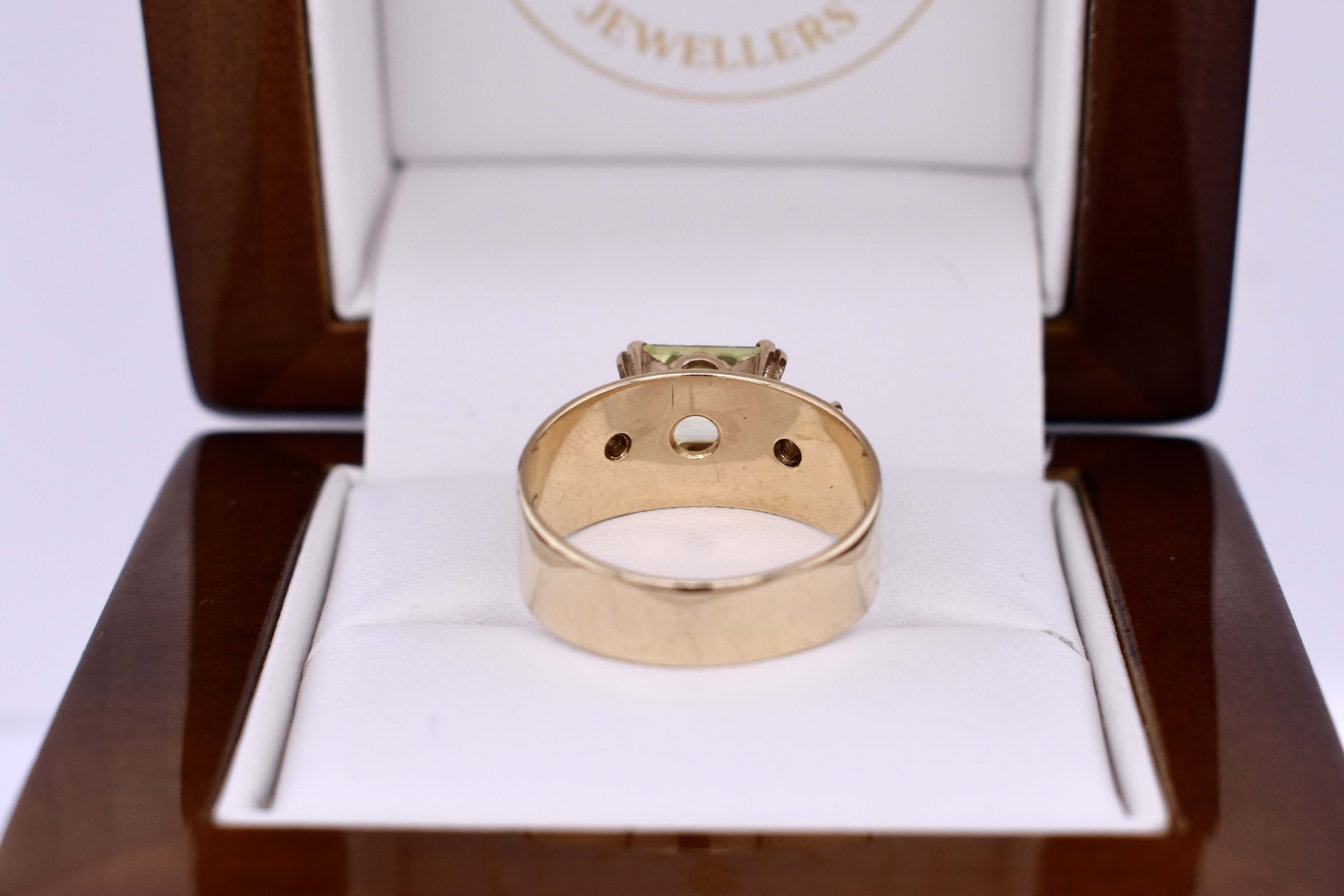 This ring is crafted in 9ct yellow gold and has a 5-7.8mm wide, flat band. It features a vintage synthetic mint green spinel, measuring 8x6mm, four claw set in an east west setting. The main stone is complimented by two round, clear synthetic spinels, four claw set either side. Finger size M. Total ring weight 3.58 grams.
