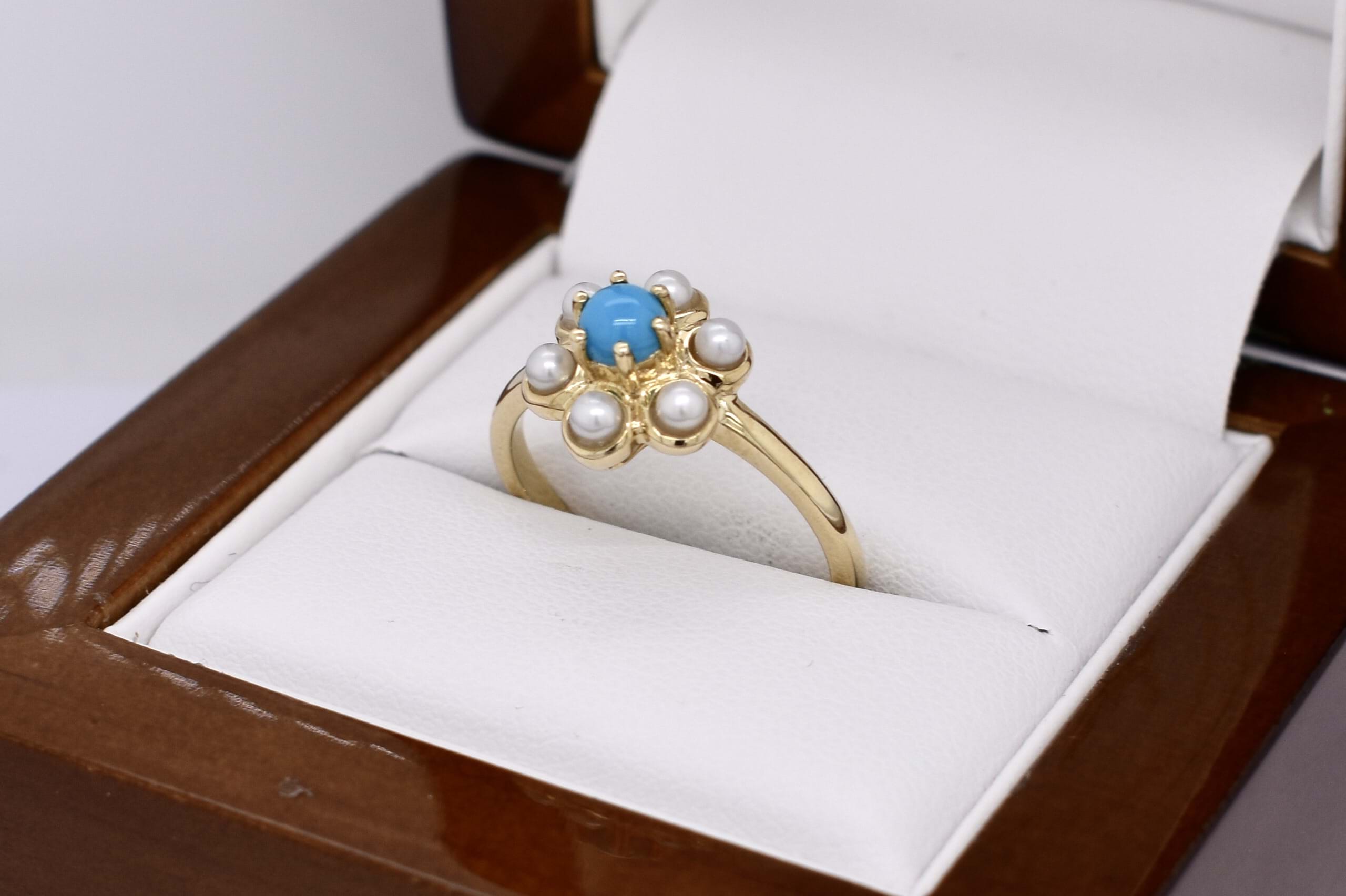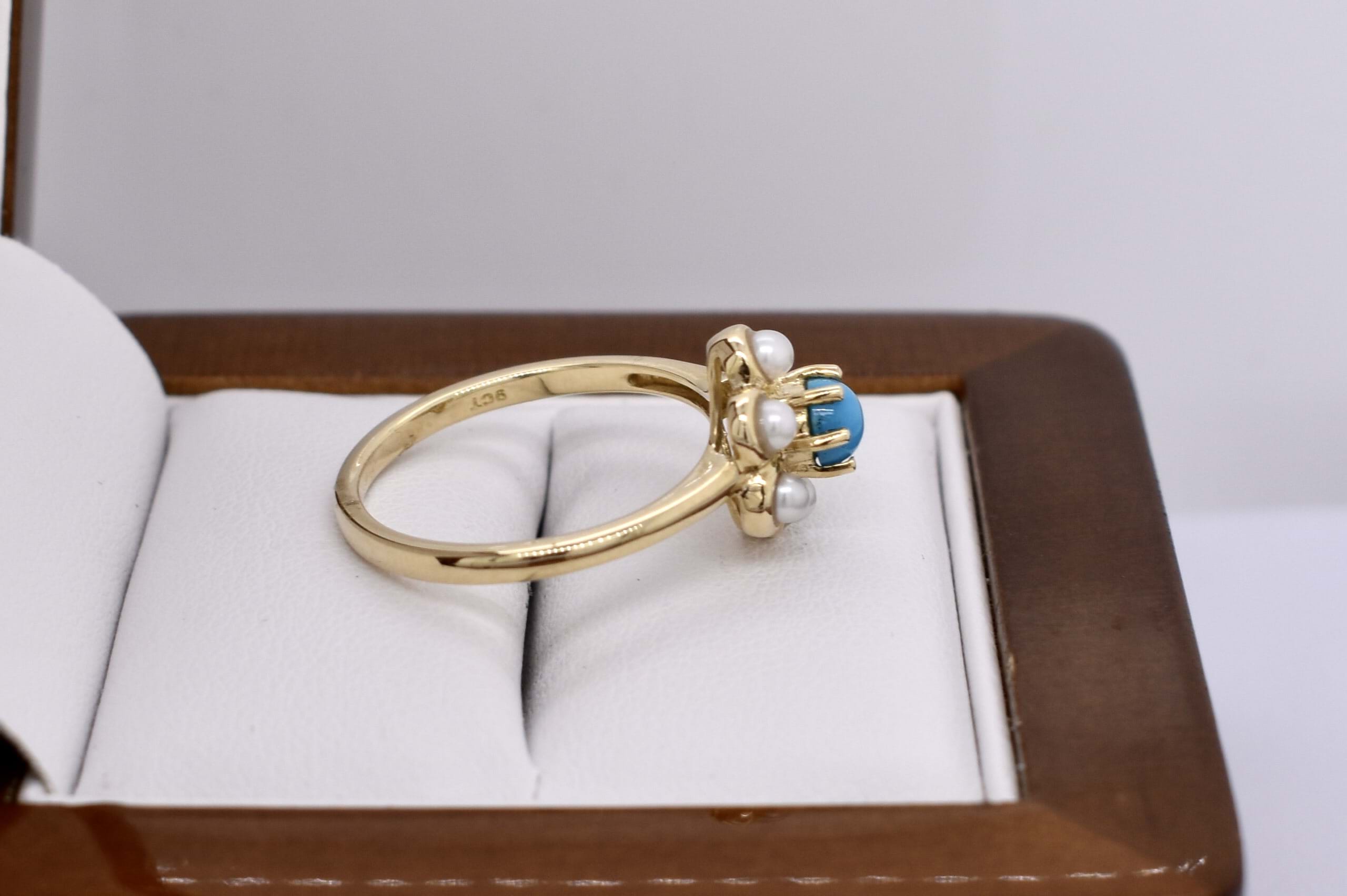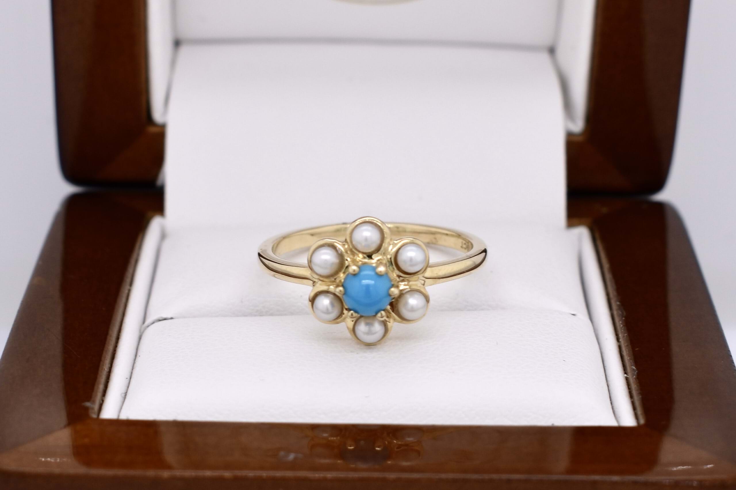The cutest 9ct yellow gold cluster ring, featuring one centre round turquoise, claw set with 6 bezel set white seed pearls in a flower shape. Finished on a plain gold band. Finger size N.