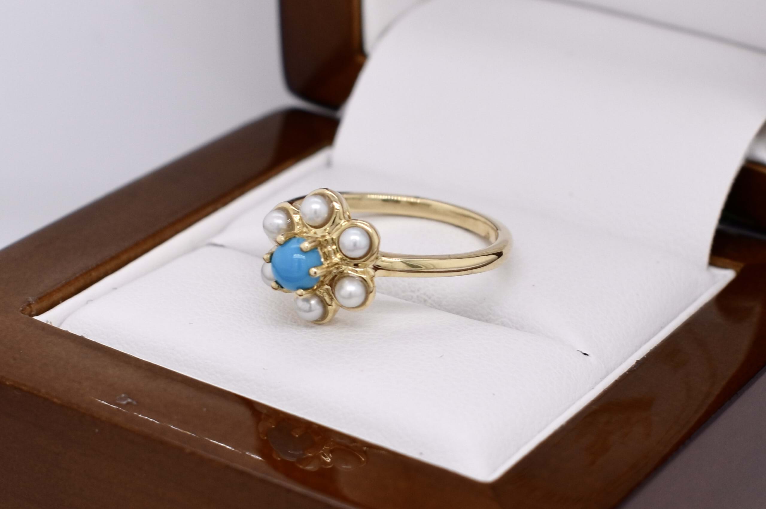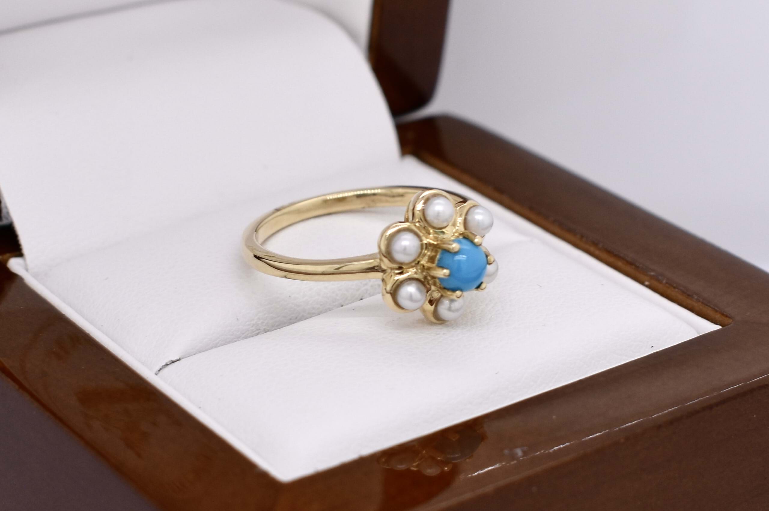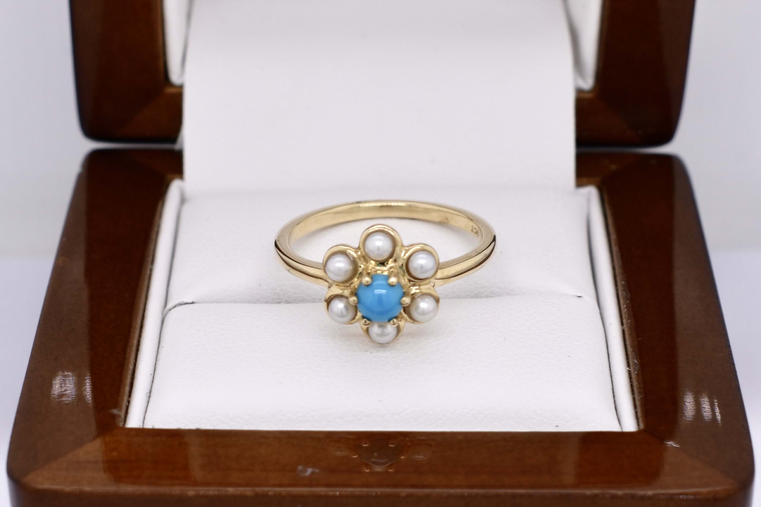 The cutest 9ct yellow gold cluster ring, featuring one centre round turquoise, claw set with 6 bezel set white seed pearls in a flower shape. Finished on a plain gold band. Finger size N.