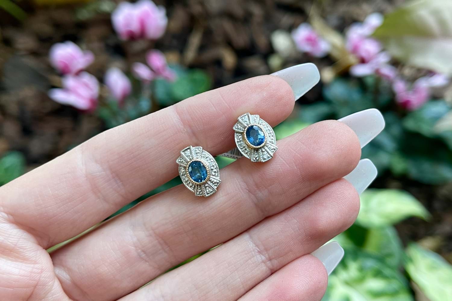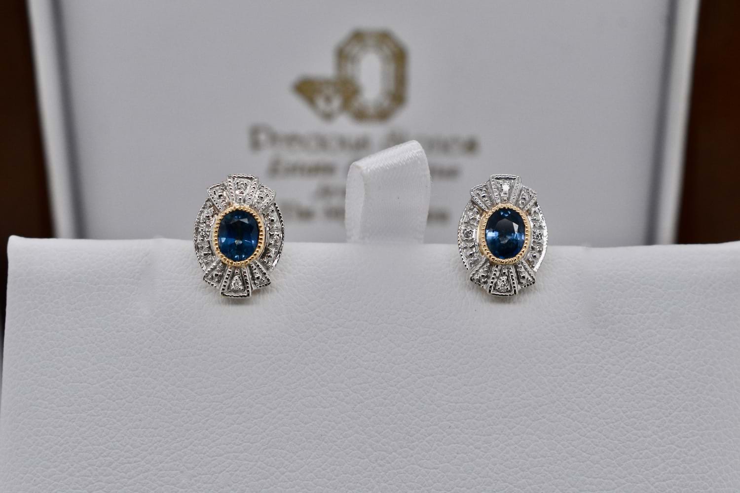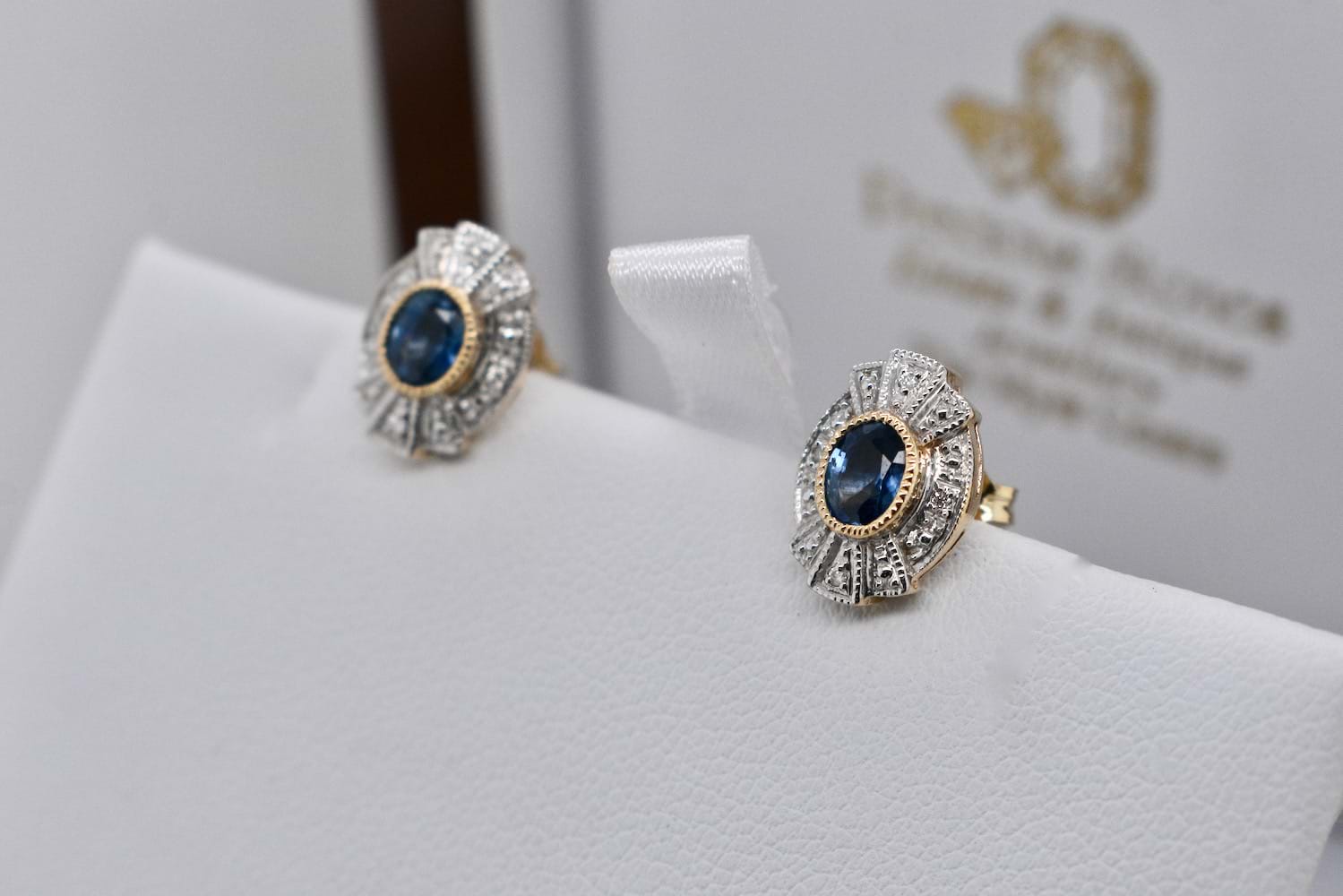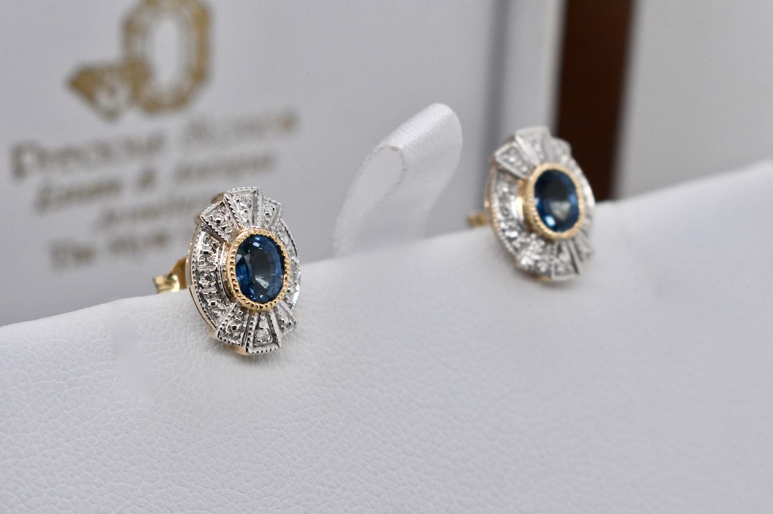 A stunning pair of Art Deco inspired earrings set in 9ct yellow and white gold, featuring two 5 x 4mm oval blue sapphires bezel set in yellow gold, with a 'fan' style surround in white gold and complimented by four 1mm white diamonds. The studs measure approximately 12 x 9mm overall with post and butterfly fittings