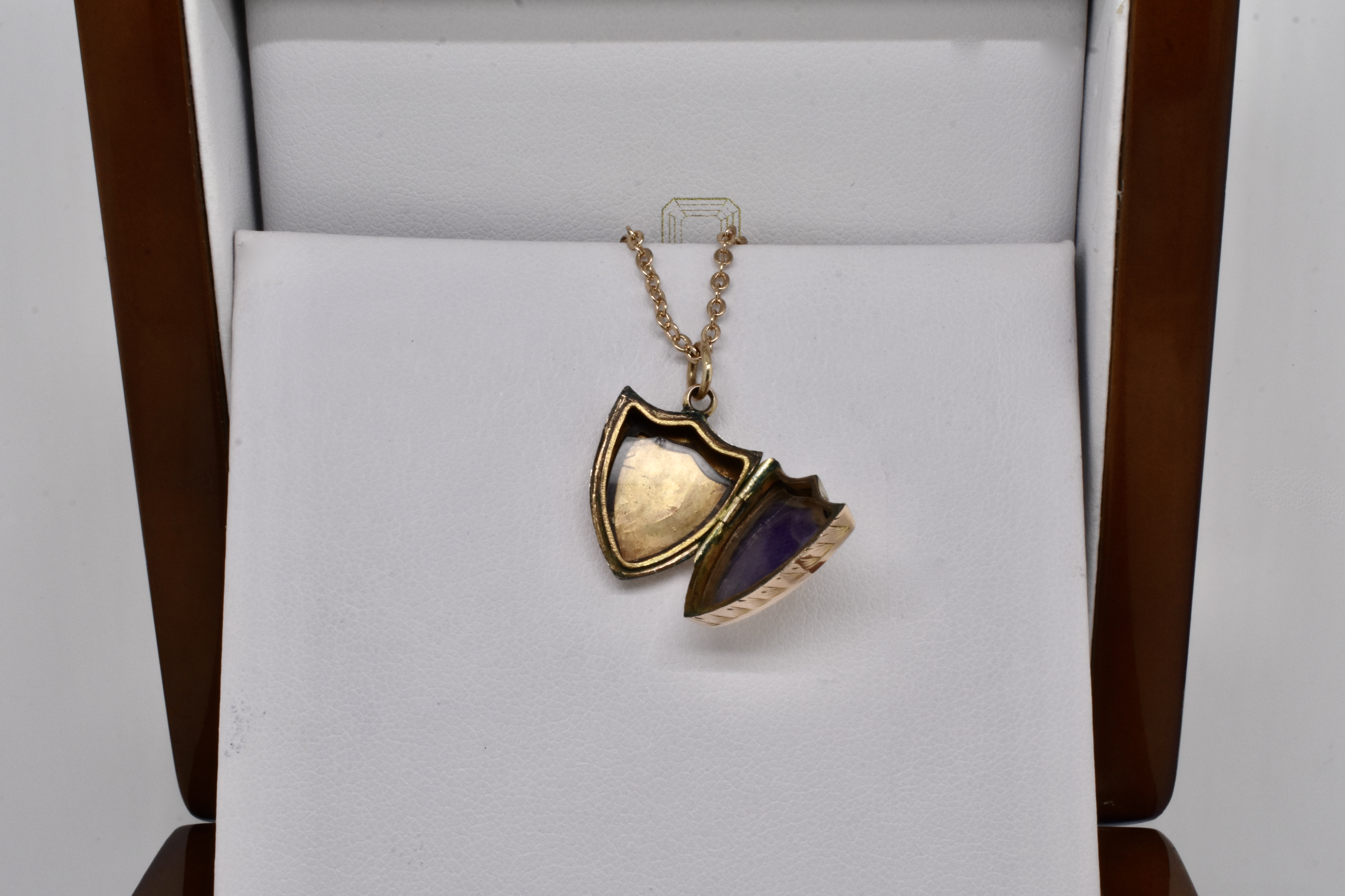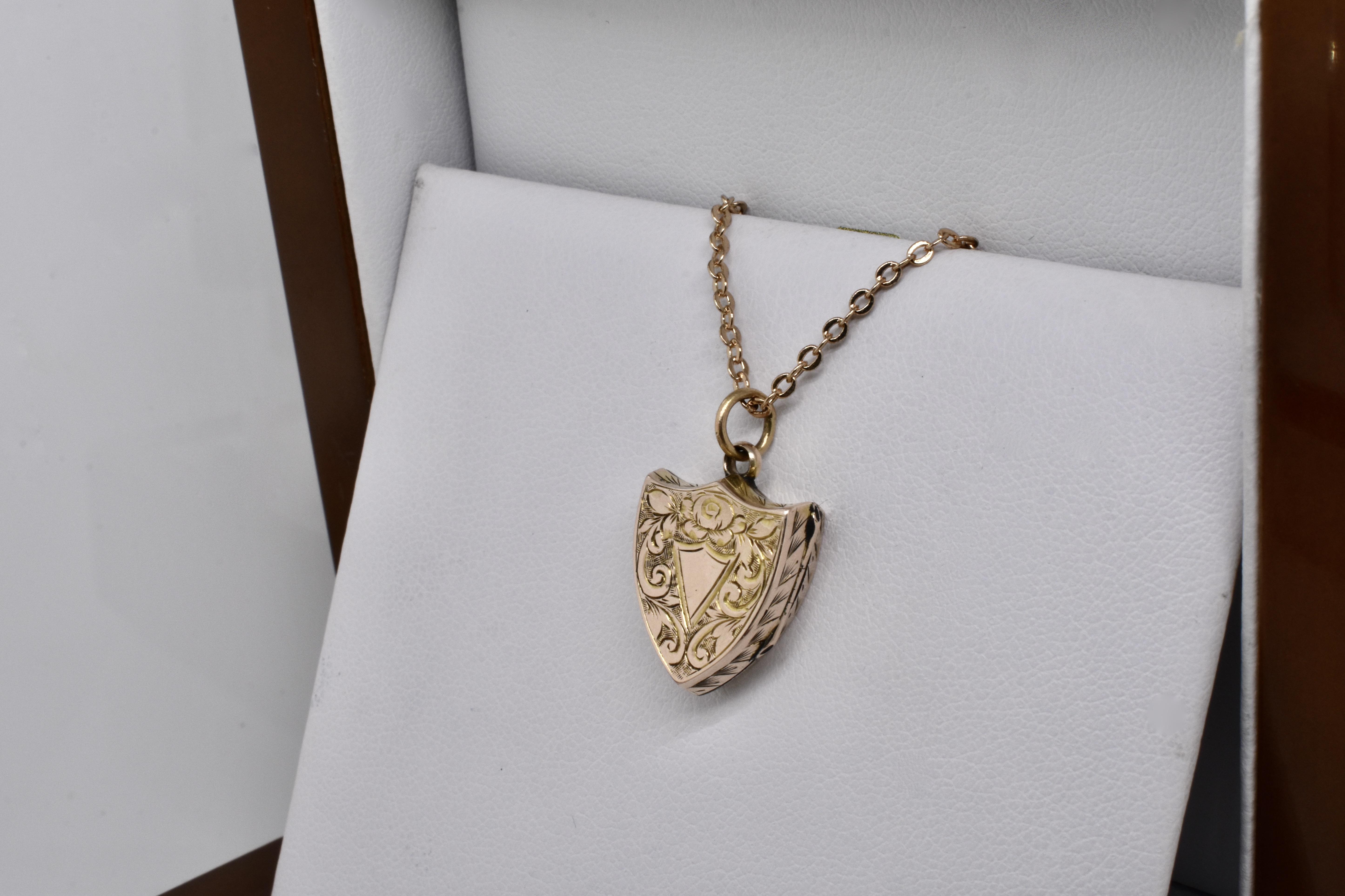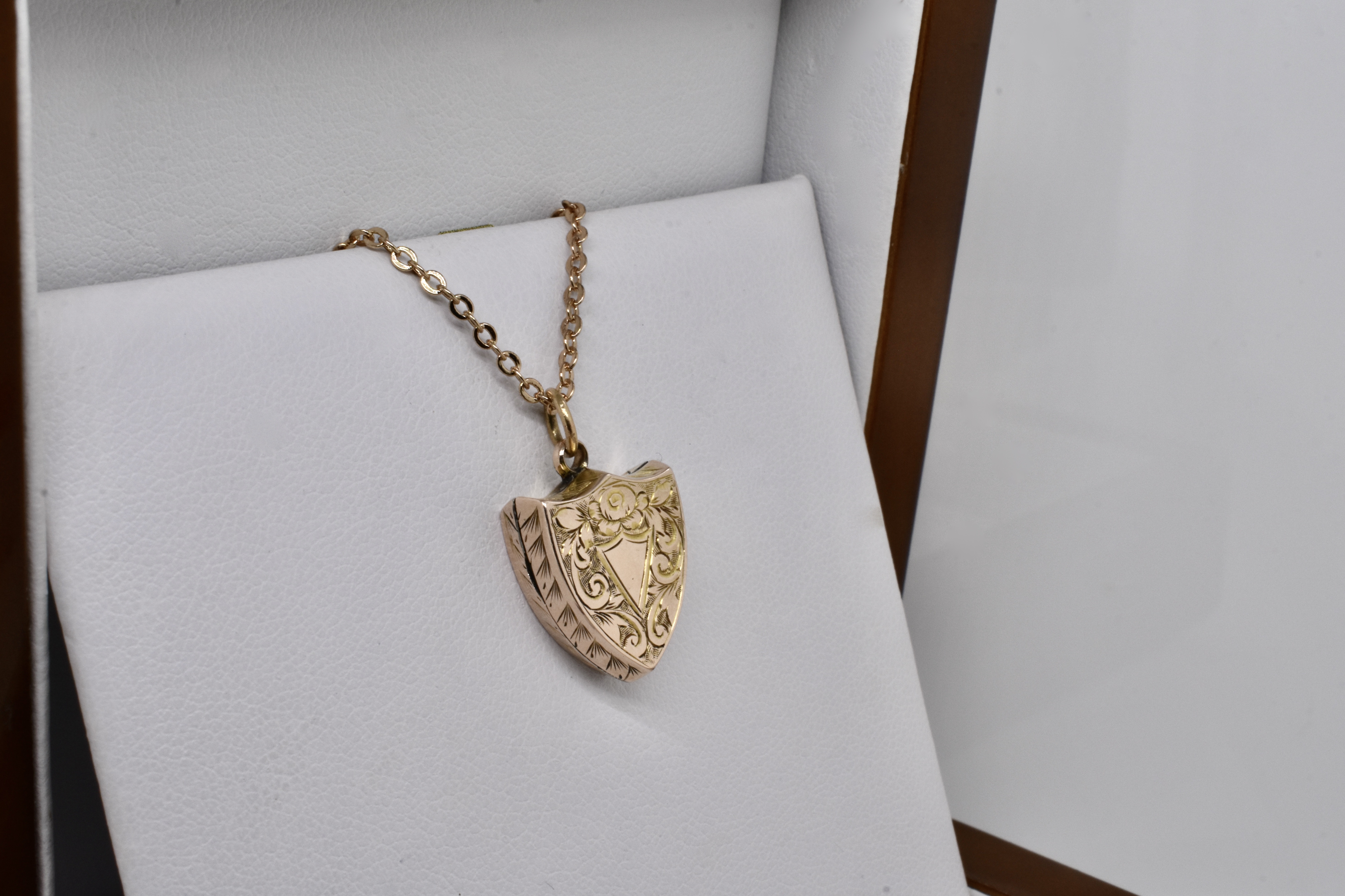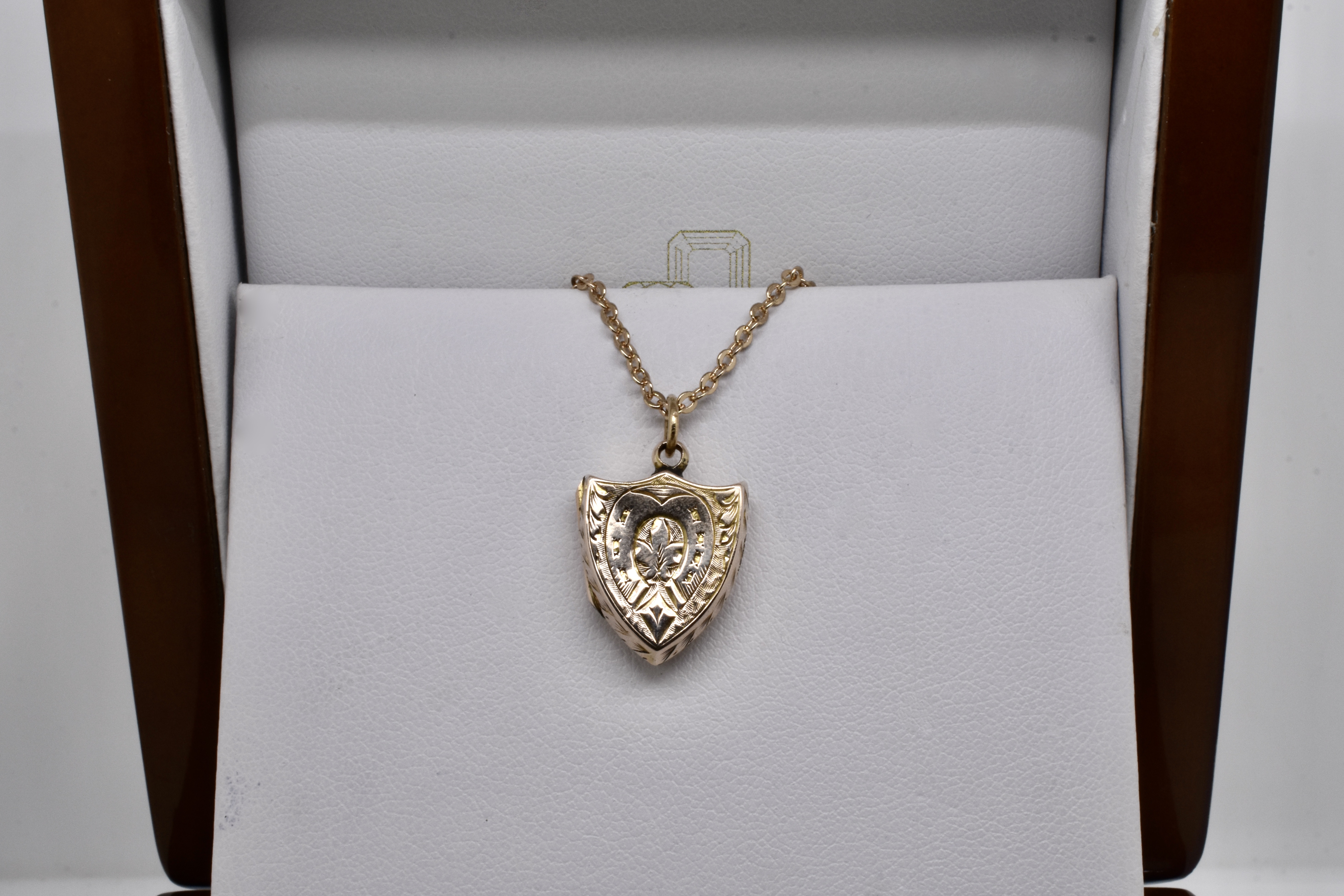 This lovely, petite, antique locket is a shield shape with intricate scroll engraving on both sides and is 9ct yellow gold front and back. The locket measures approx. 19x16mm and is dated circa 1890s