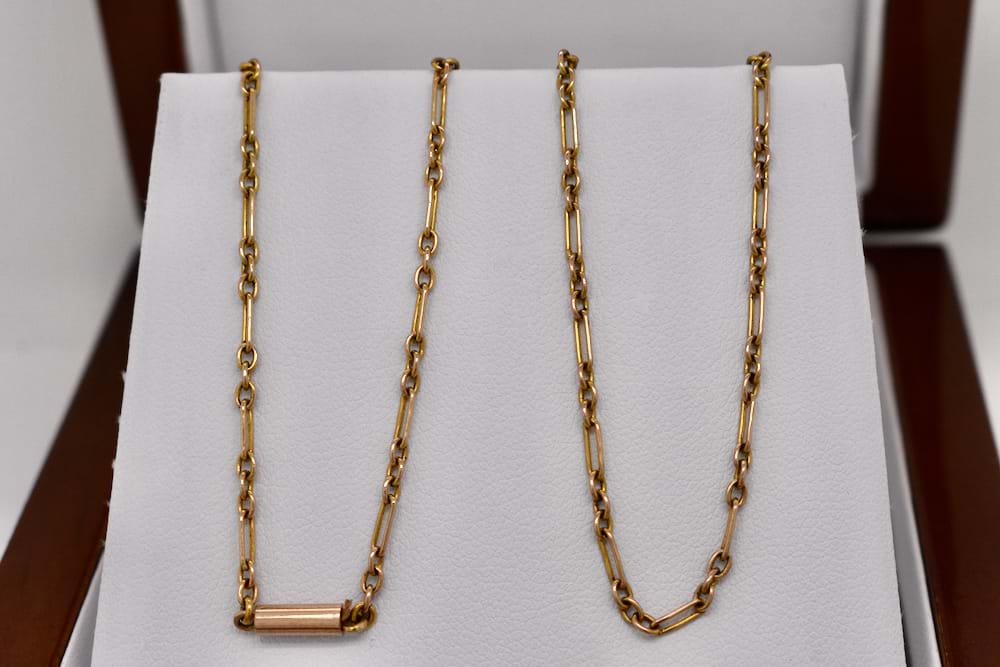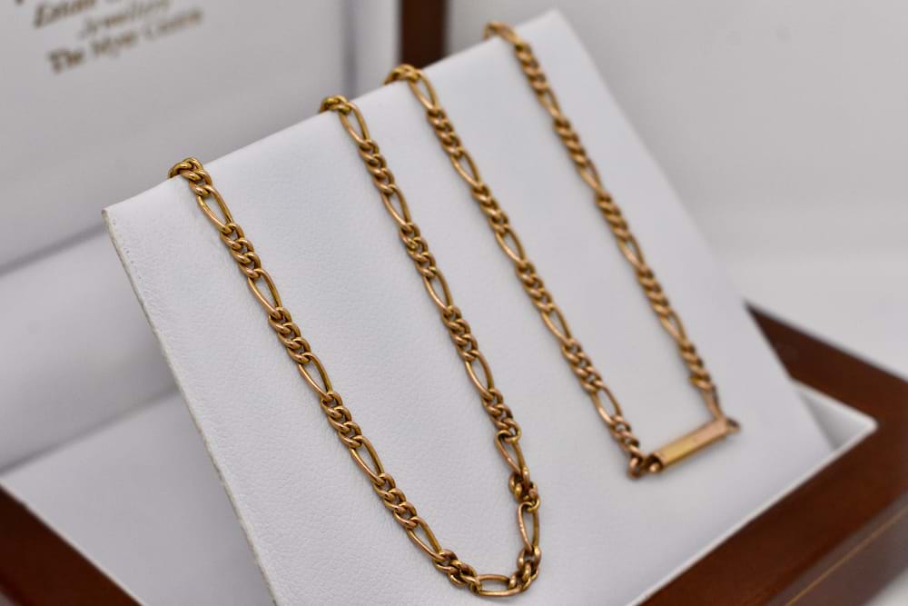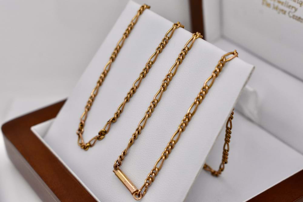 A lovely antique chain with original barrel clasp. Made in 9ct yellow gold with a 3+1 figaro link and measuring 43cm
