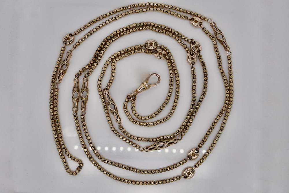 Stunning antique muff chain crafted in 9ct yellow gold with grooved ball style links and eight oval embossed star links and six elongated cage links with a swivel clasp. Length 145cm. Circa 1890's. Independent Valuation Supplied