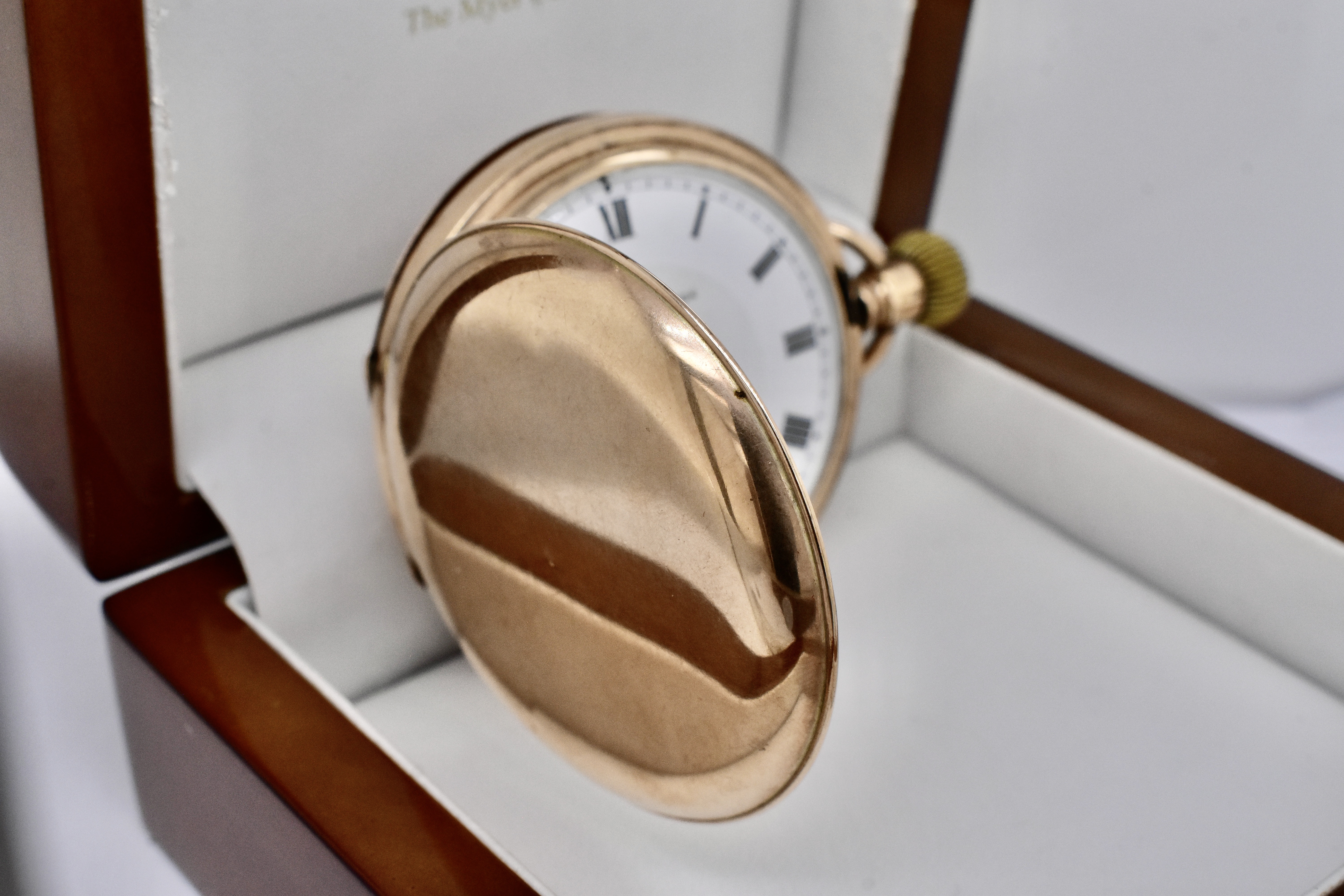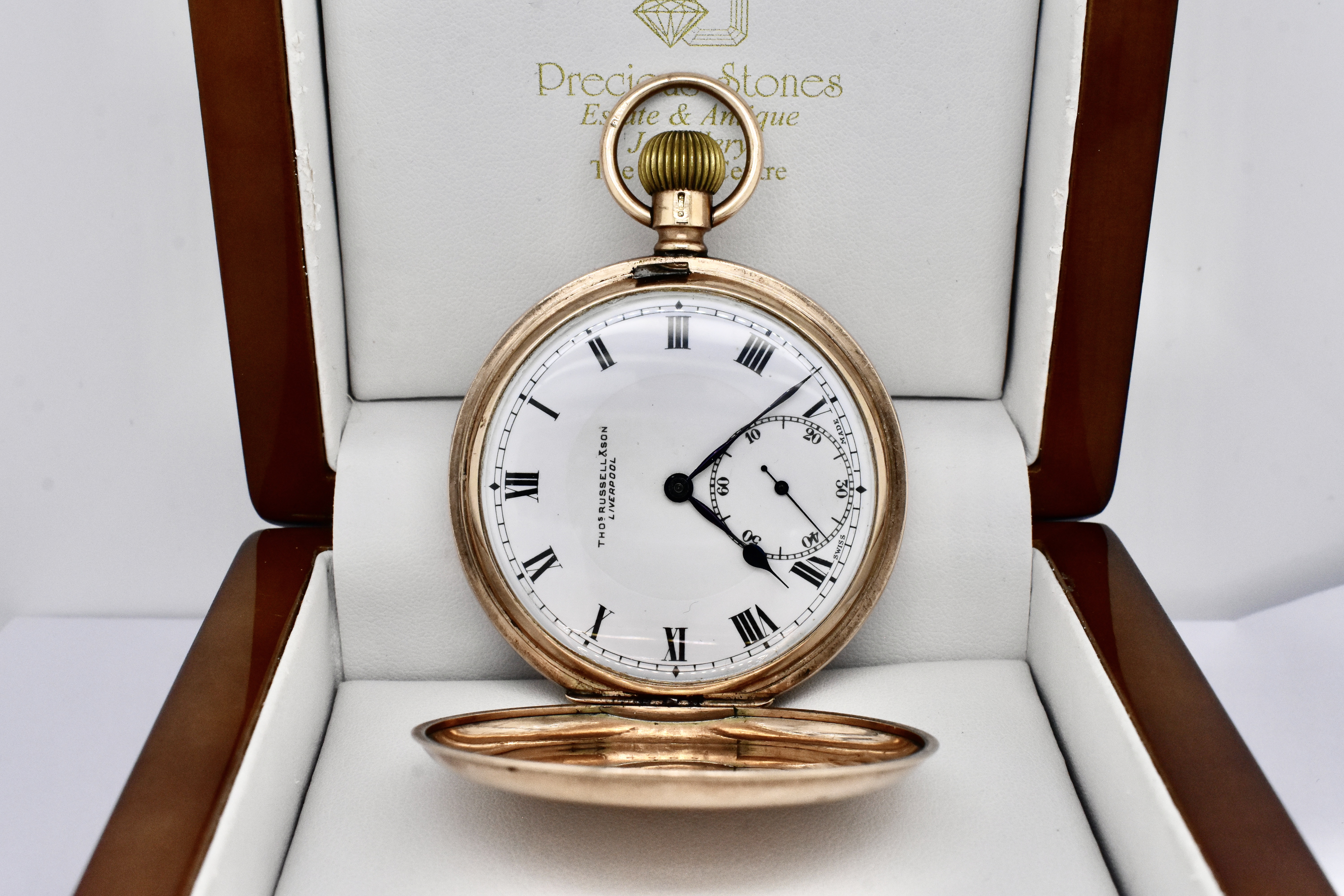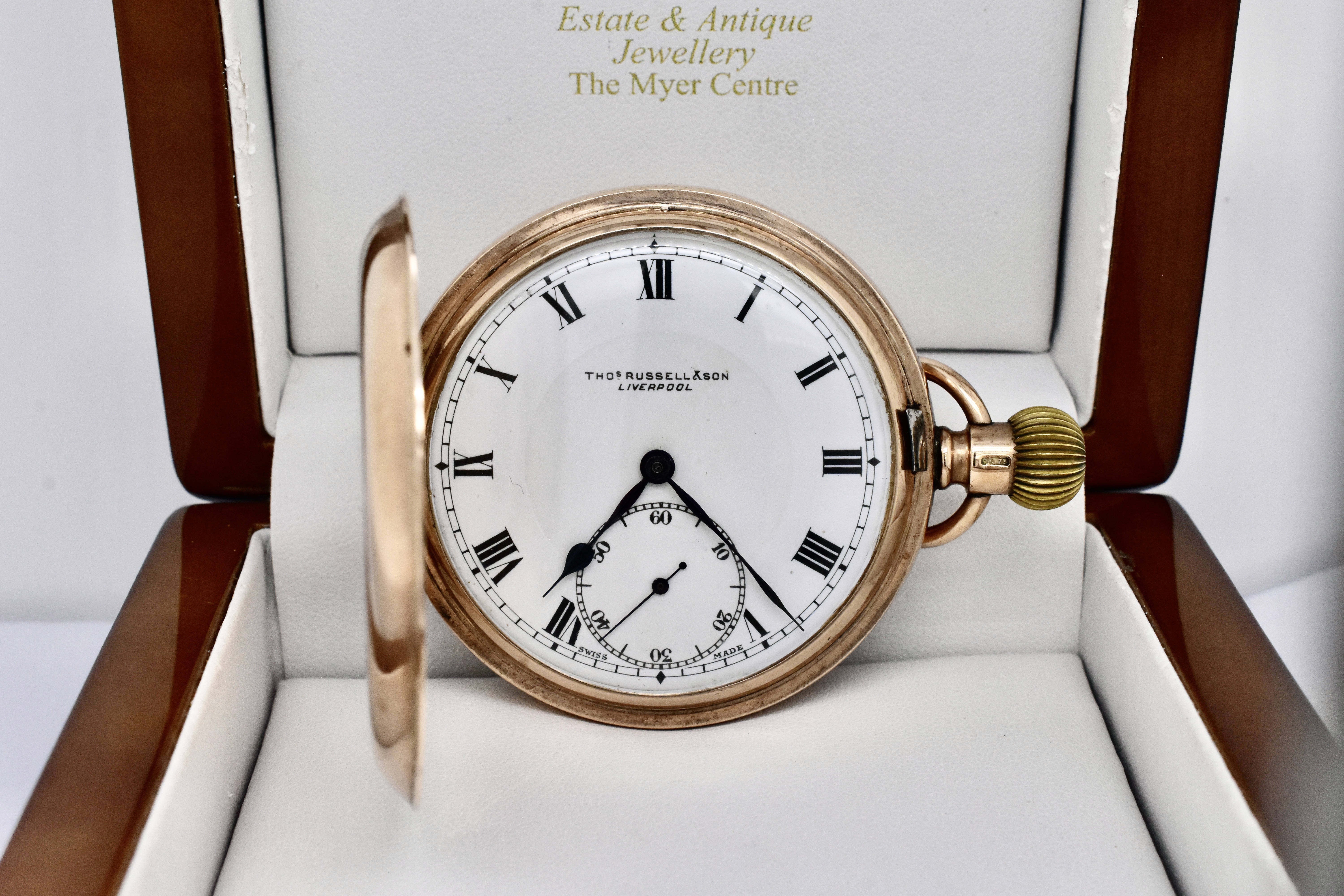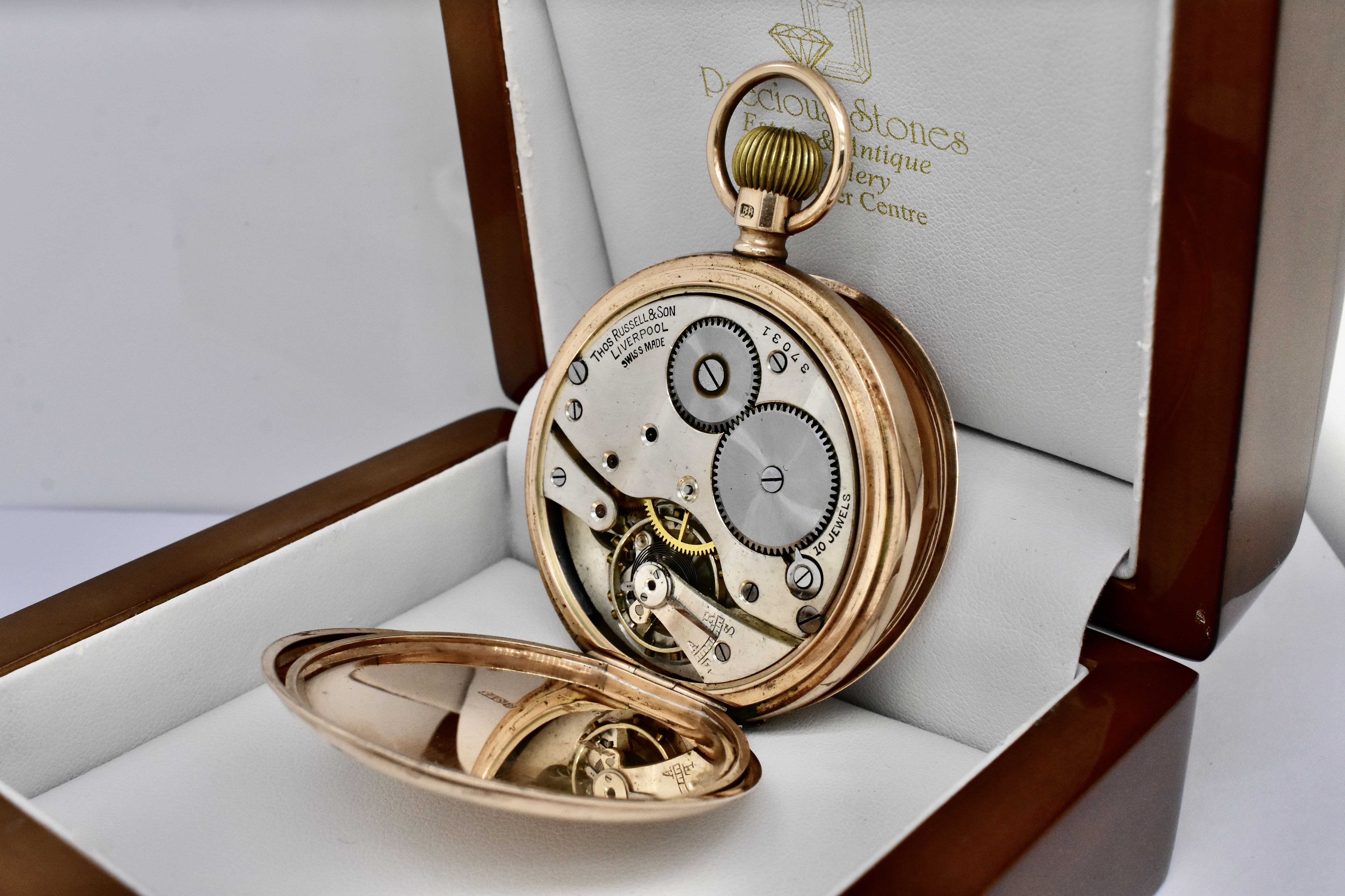 Crafted in 9ct yellow gold, this antique full hunter pocket watch is hallmarked Chester 1923 and was made my 'Thomas Russell + Son Liverpool'. In very good condition with a beautiful polished case on both sides. Please note the watch is ticking but has not been overhauled.