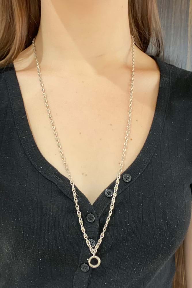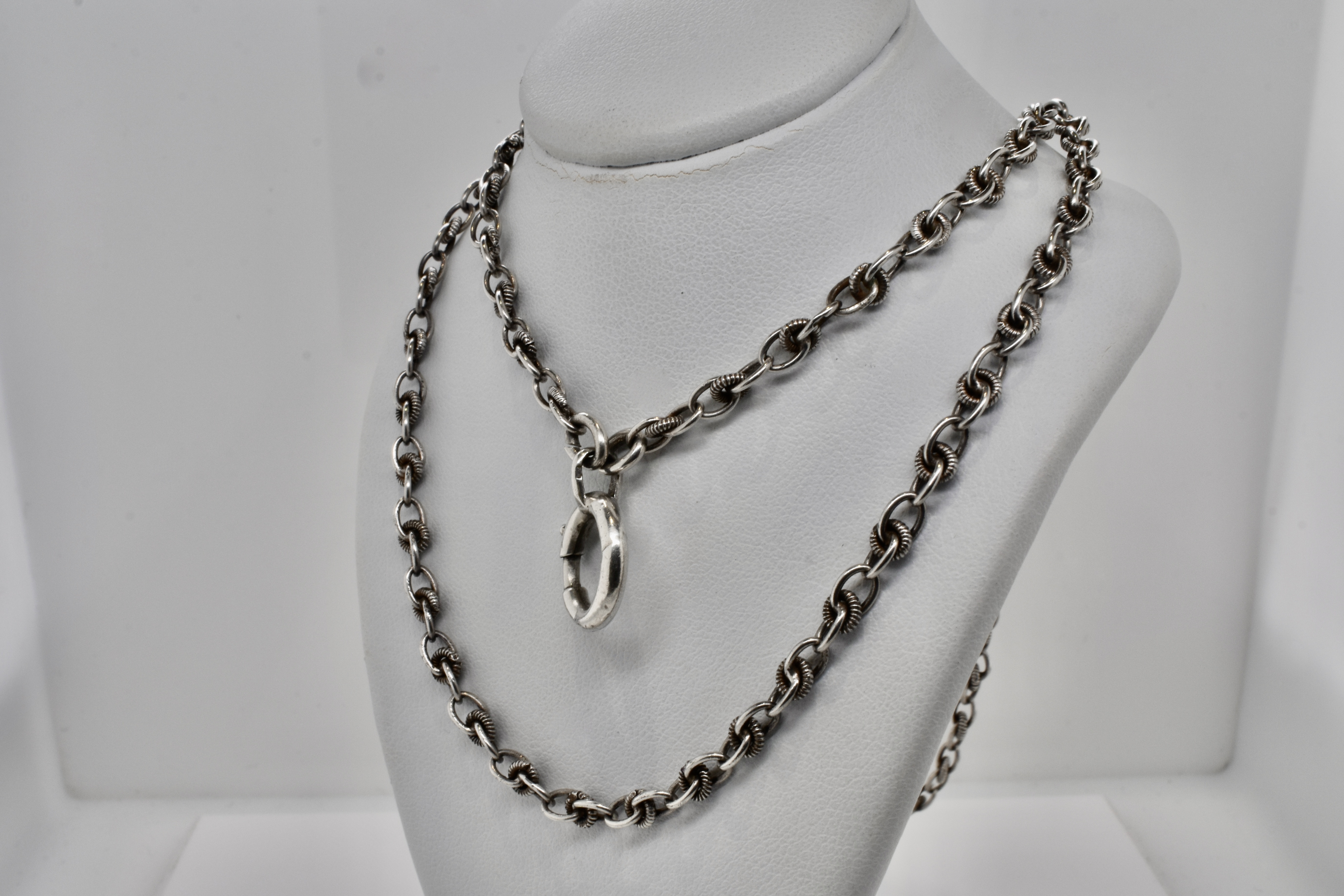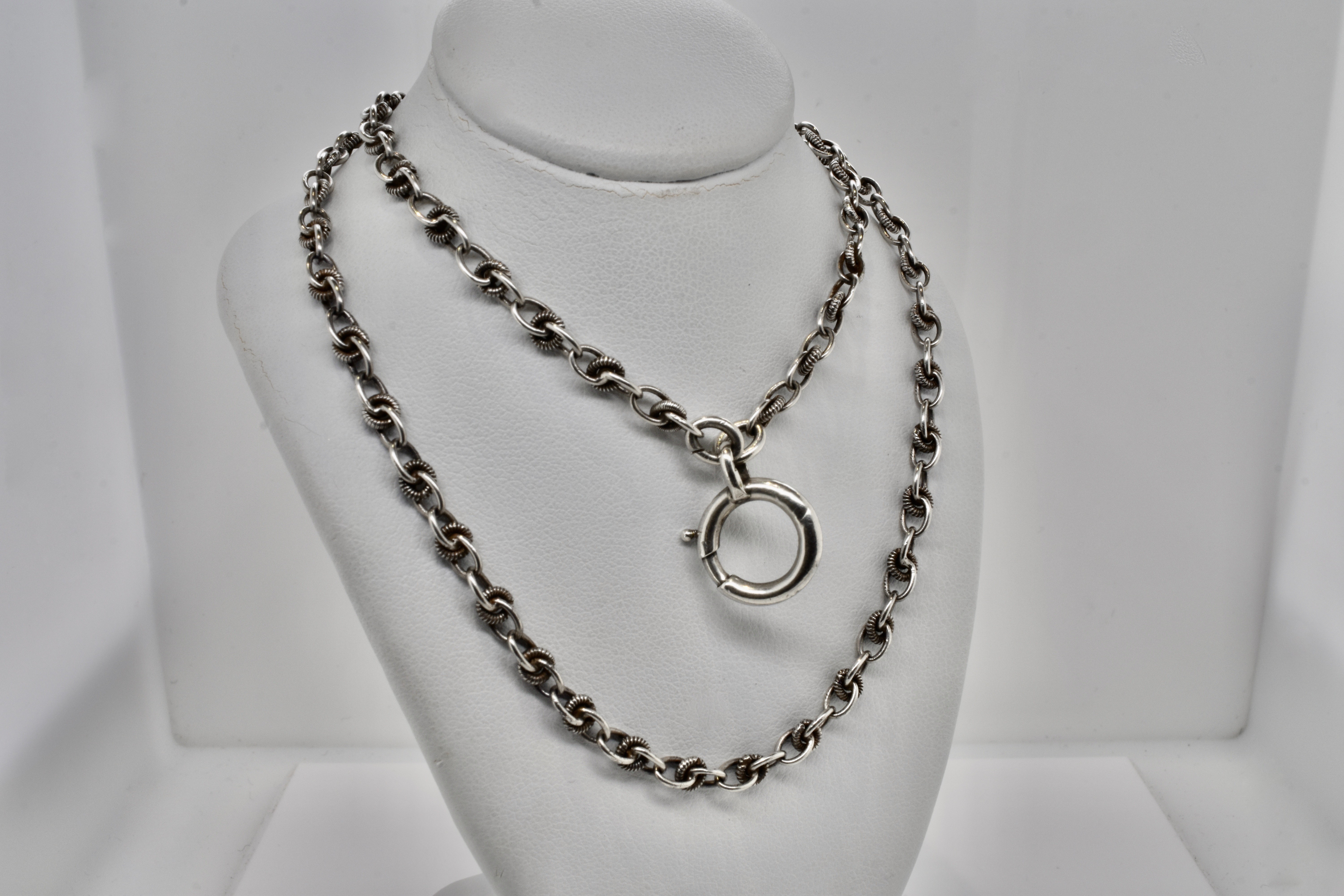 This lovely antique half muff chain is a fancy twist link with an original antique boltring in silver. The chain measures 70cm. Independent Valuation Supplied