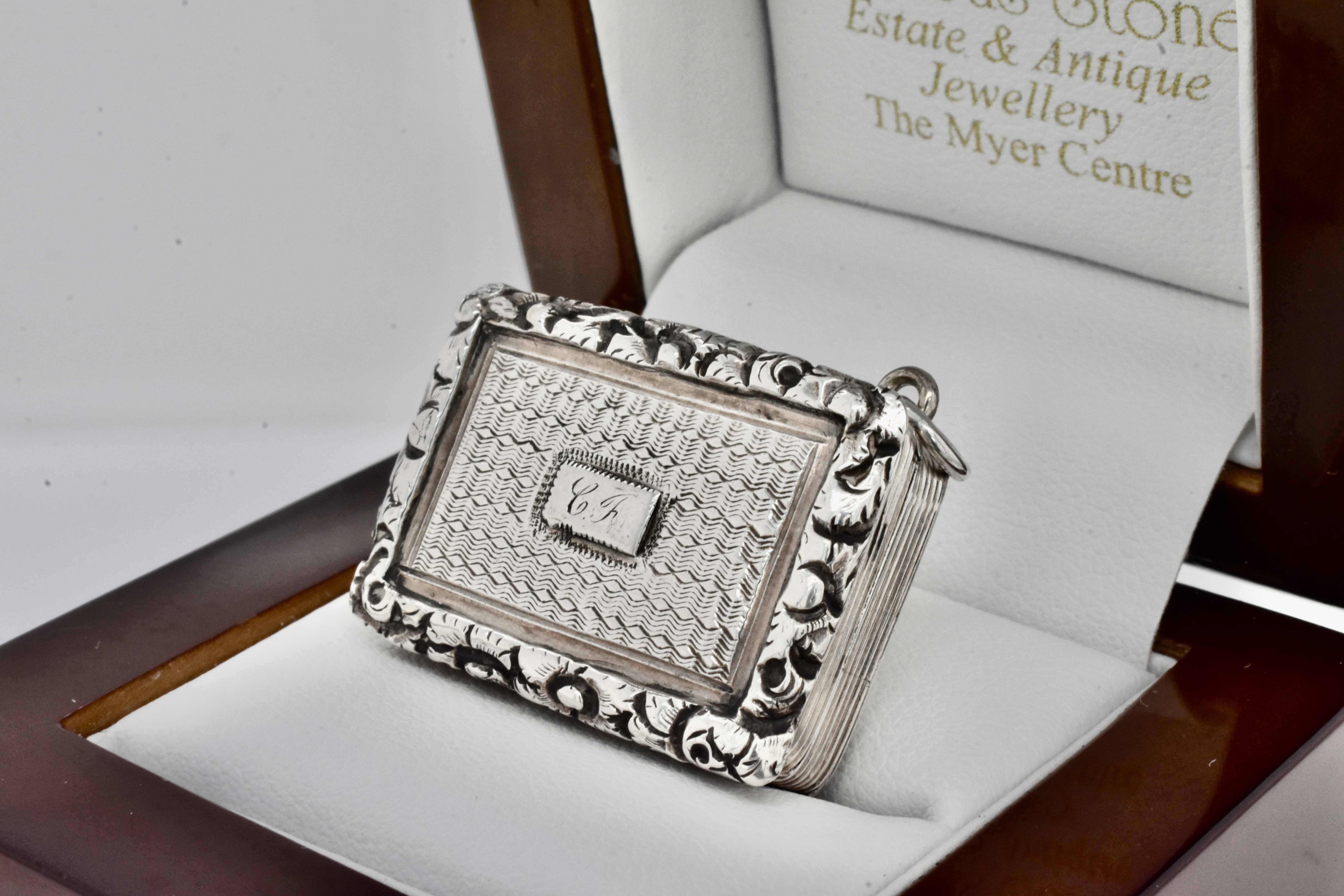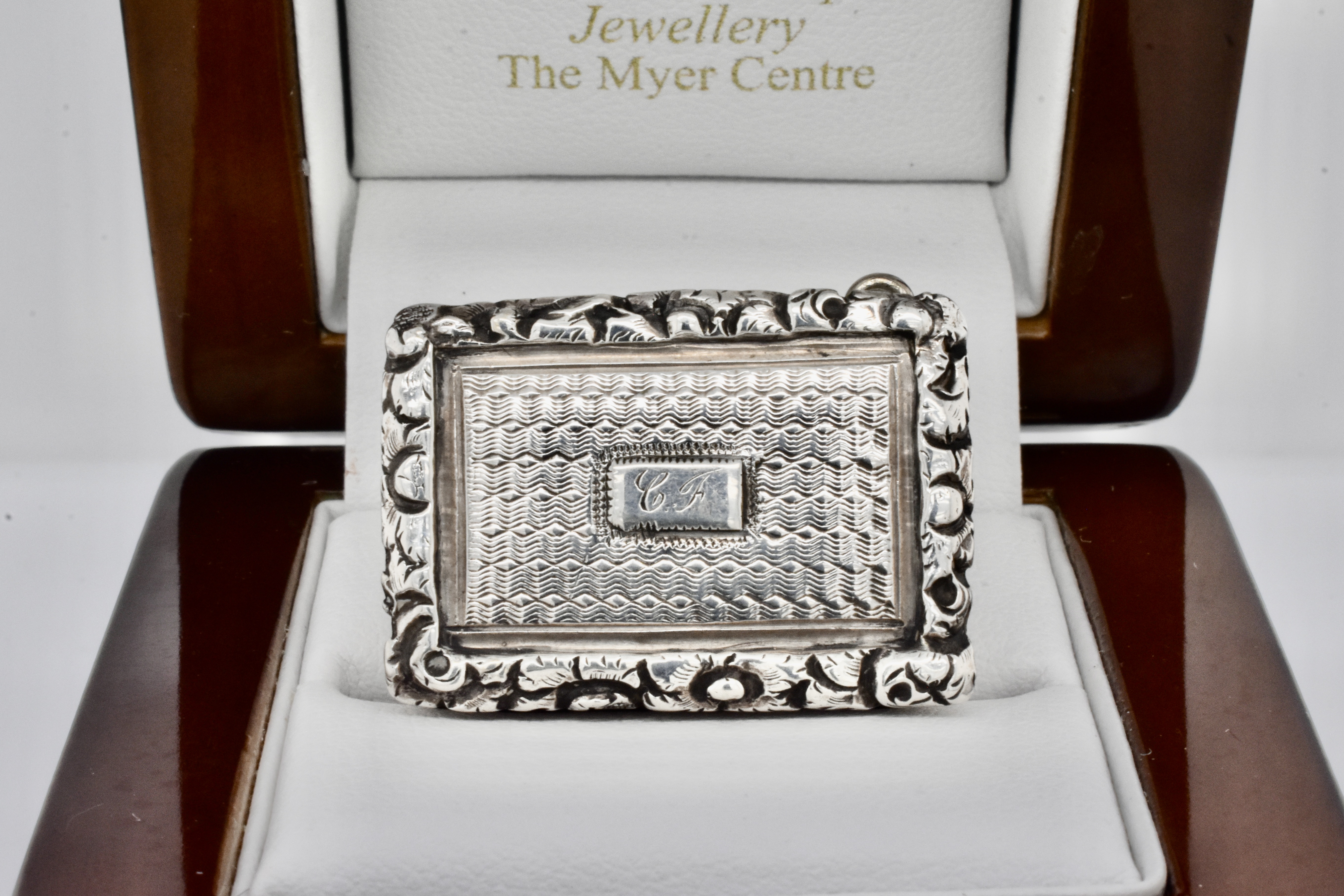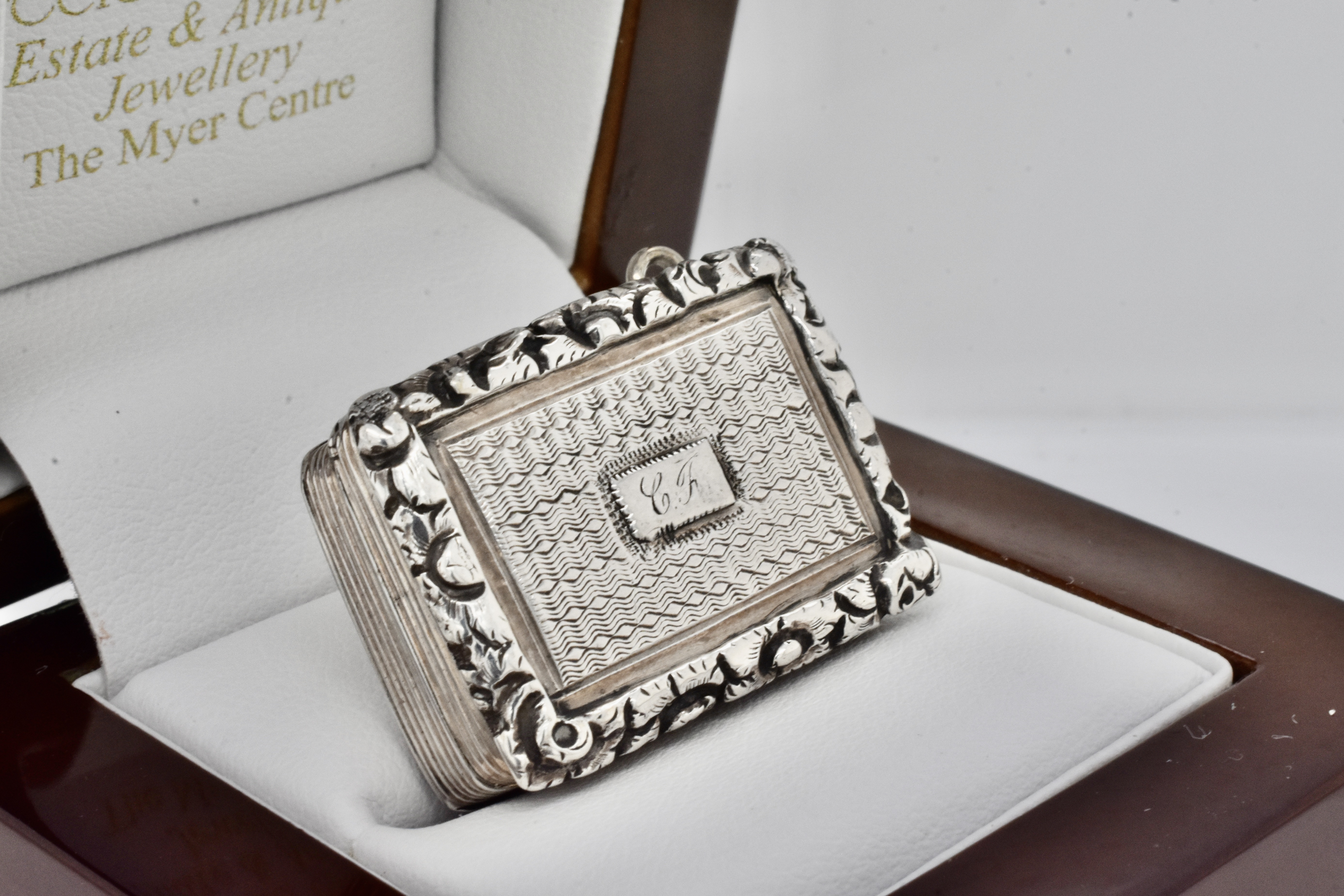 A beautiful example of an antique vinaigrette featuring both engraved and engine turned detail, engraved initials "CF" with a jump ring. The interior is gilded with gorgeous ornamental scroll engraving on the grille. Independent Valuation Supplied
