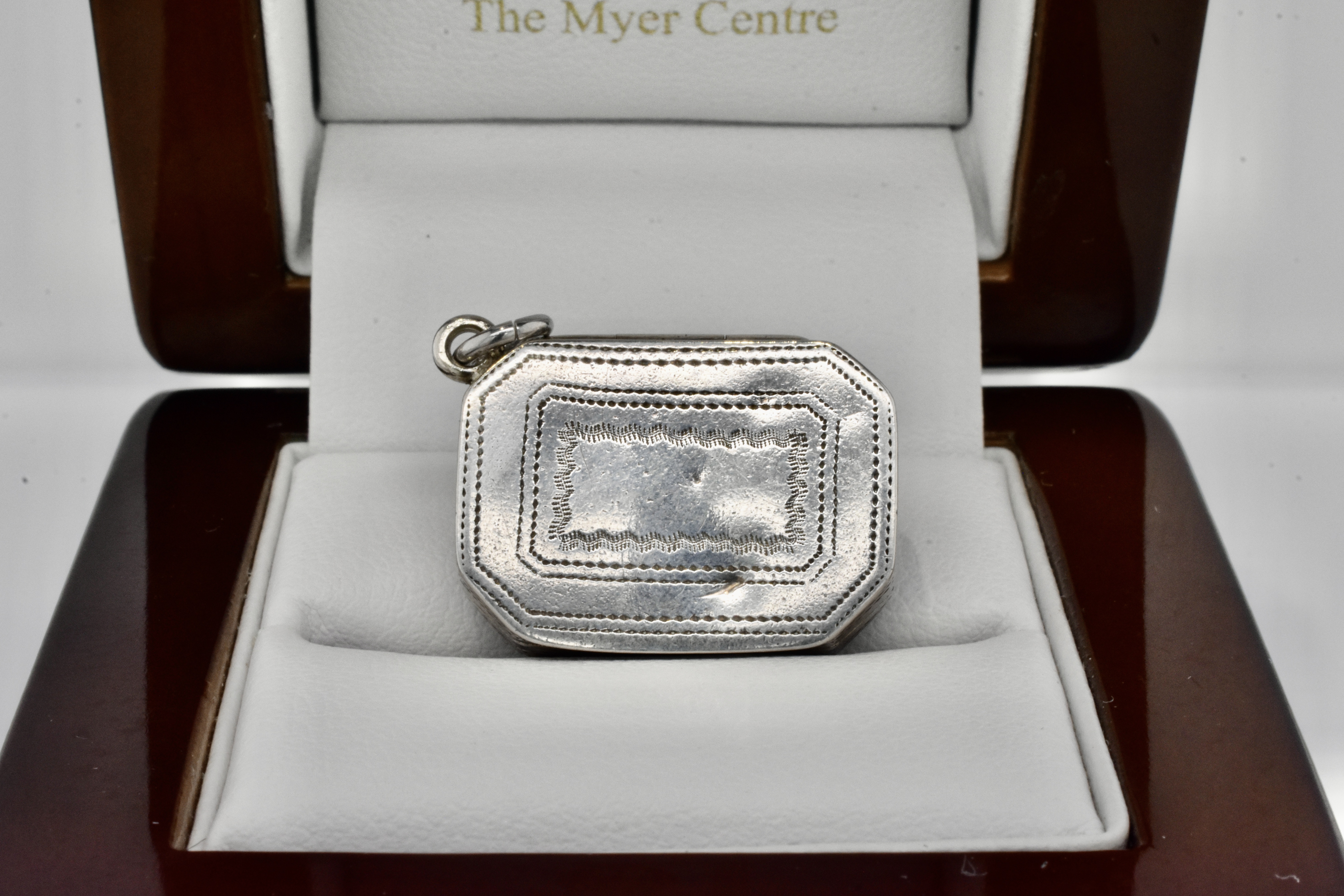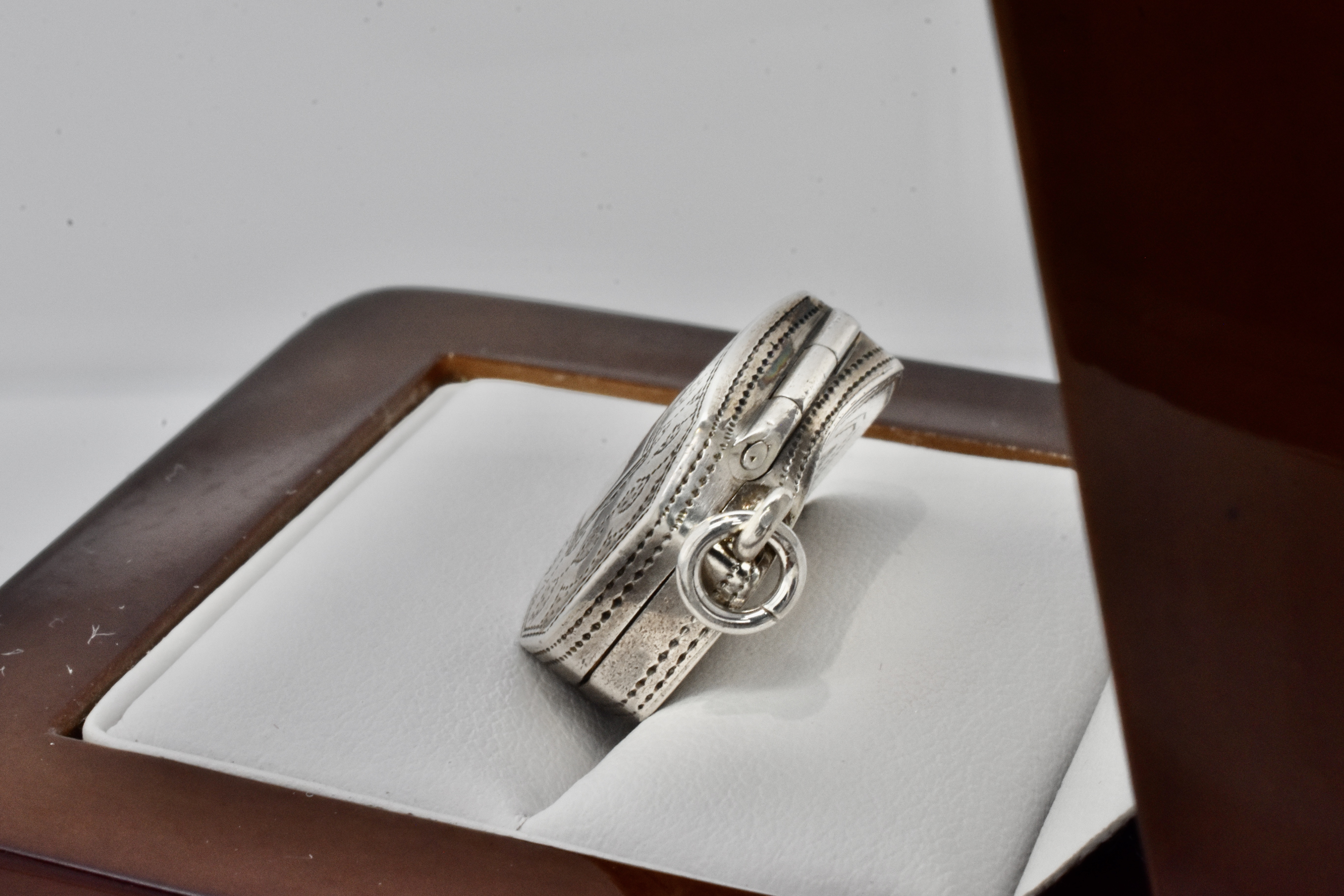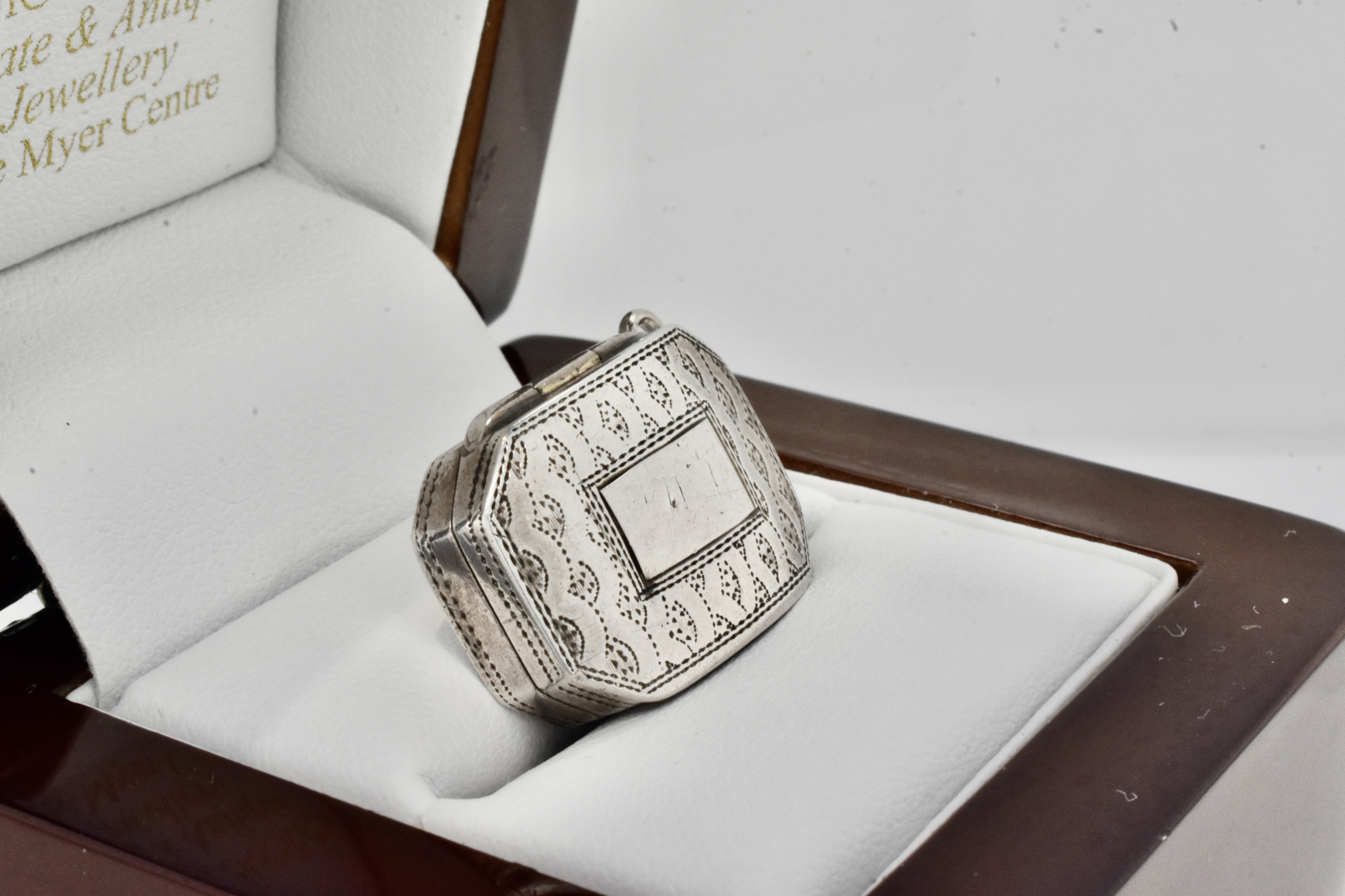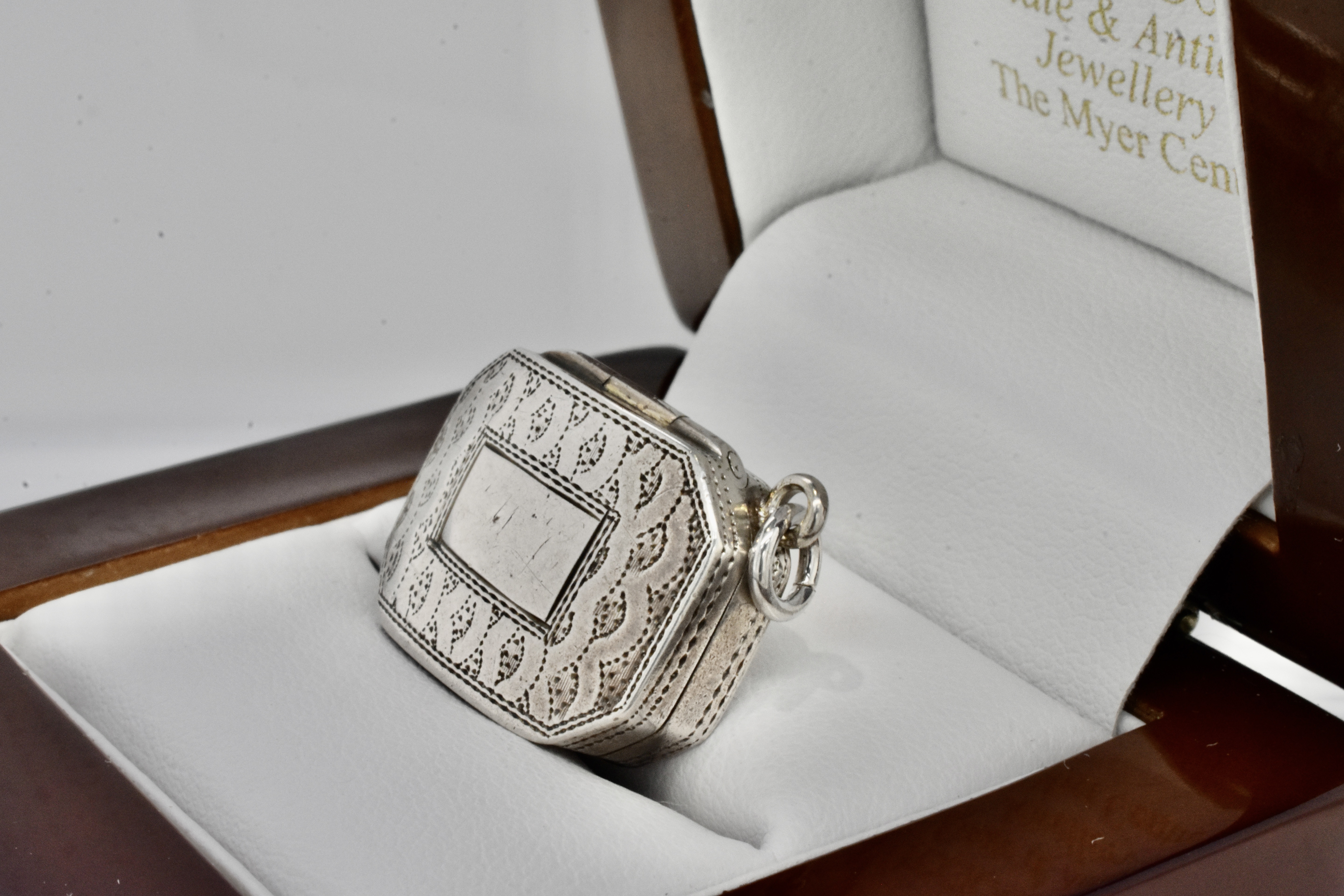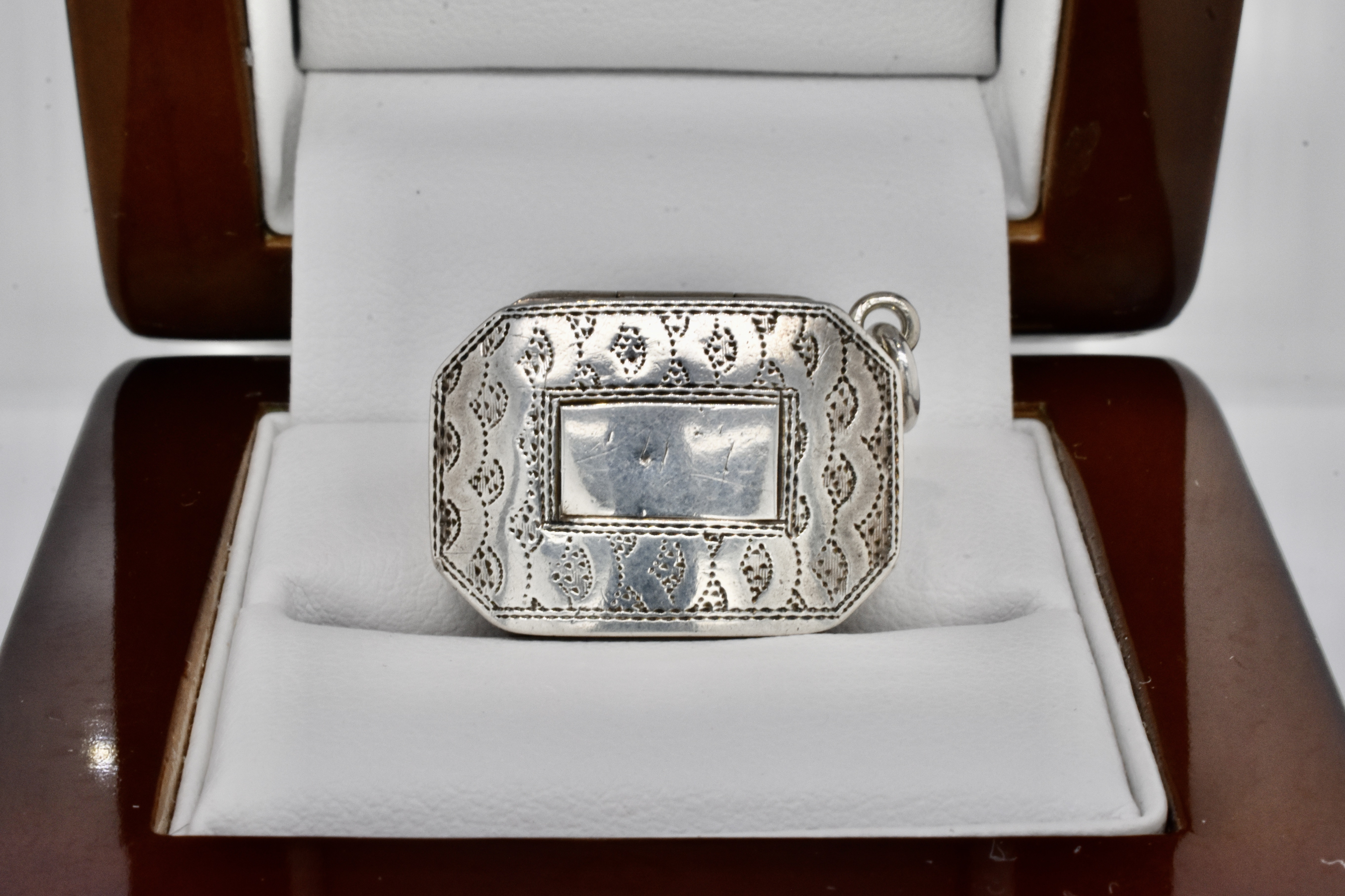 This pint sized antique vinaigrette is made from sterling silver and measures approximately 22 x 16mm with lovely engraved fan-esque detailing on the front and engraved borders on the back. The inside is gilded and hallmarked Birmingham 1811, with a jump ring. Independent Valuation Supplied