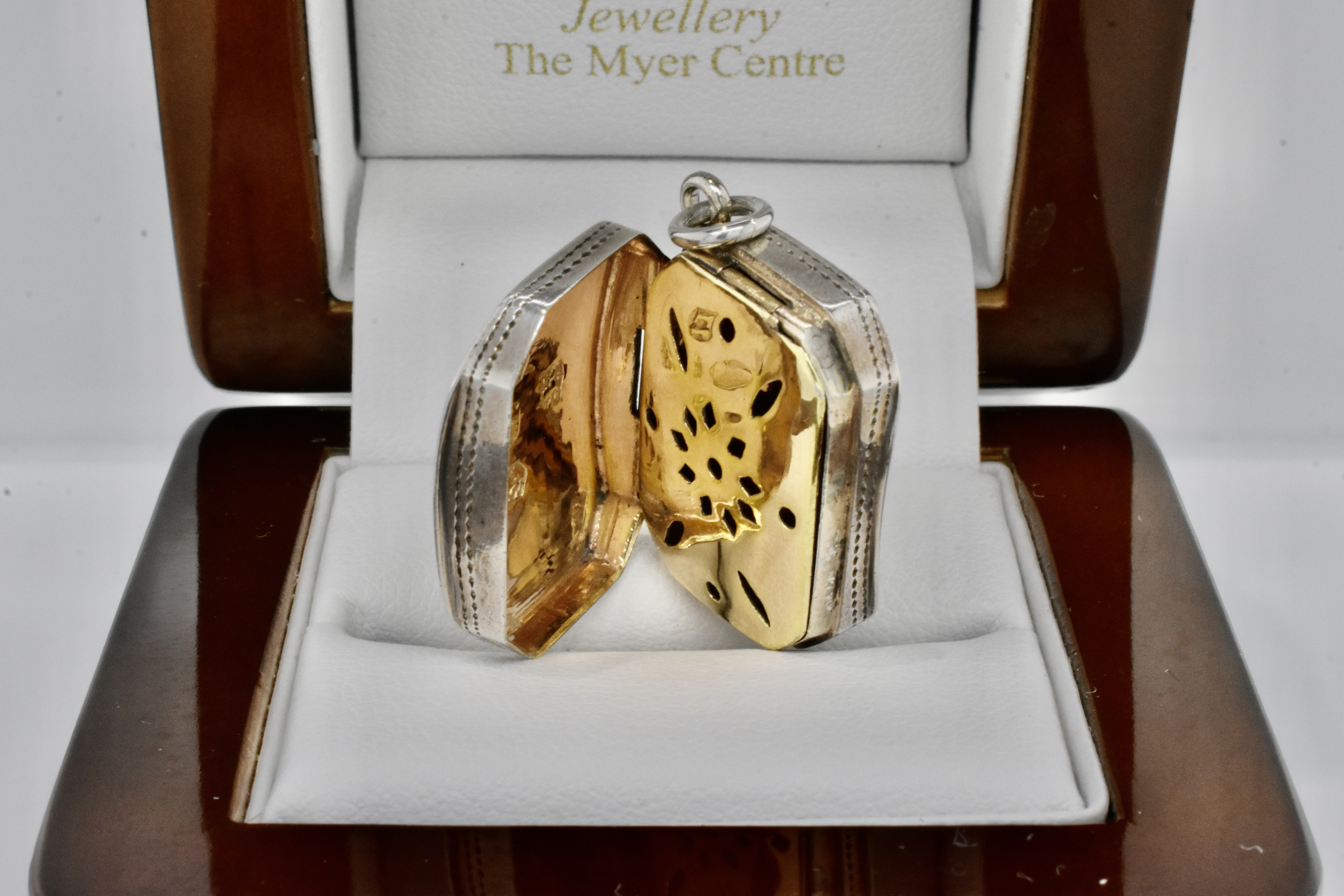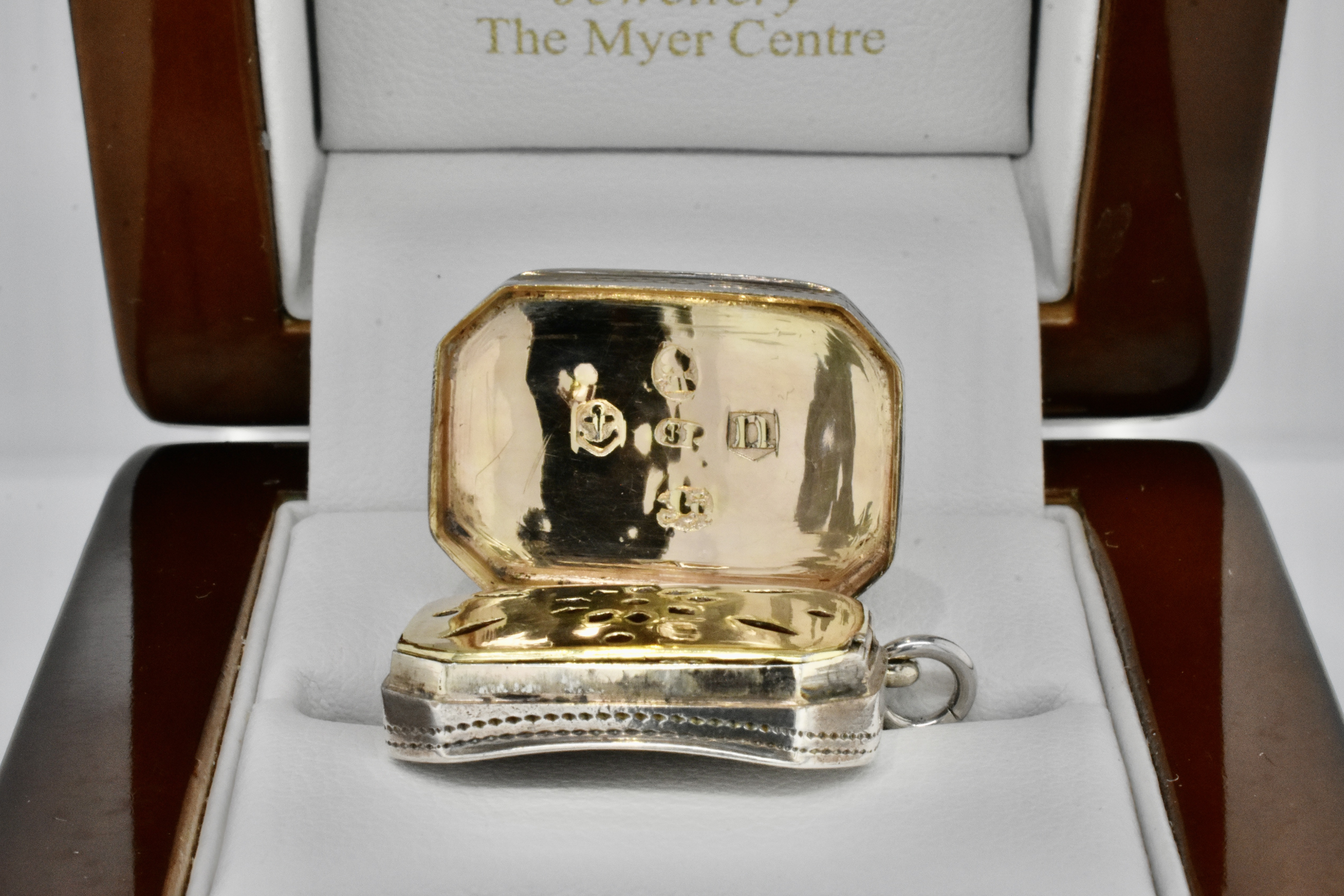 Sterling silver vinaigrettes are small, decorative boxes that were used whilst travelling as a more accessible and practical way of carrying perfume and scents rather than in large glass bottles or vials. The perfume or aromatic vinegar would be contained within these boxes soaked in a sponge. The box would also have a grille to cover the sponge. Vinaigrette sizes tended to vary, with their widths spanning from around 1.2cm to 10cm. Silver pieces were always gilded at the point where the sponge would touch the metal as to avoid any corrosion.