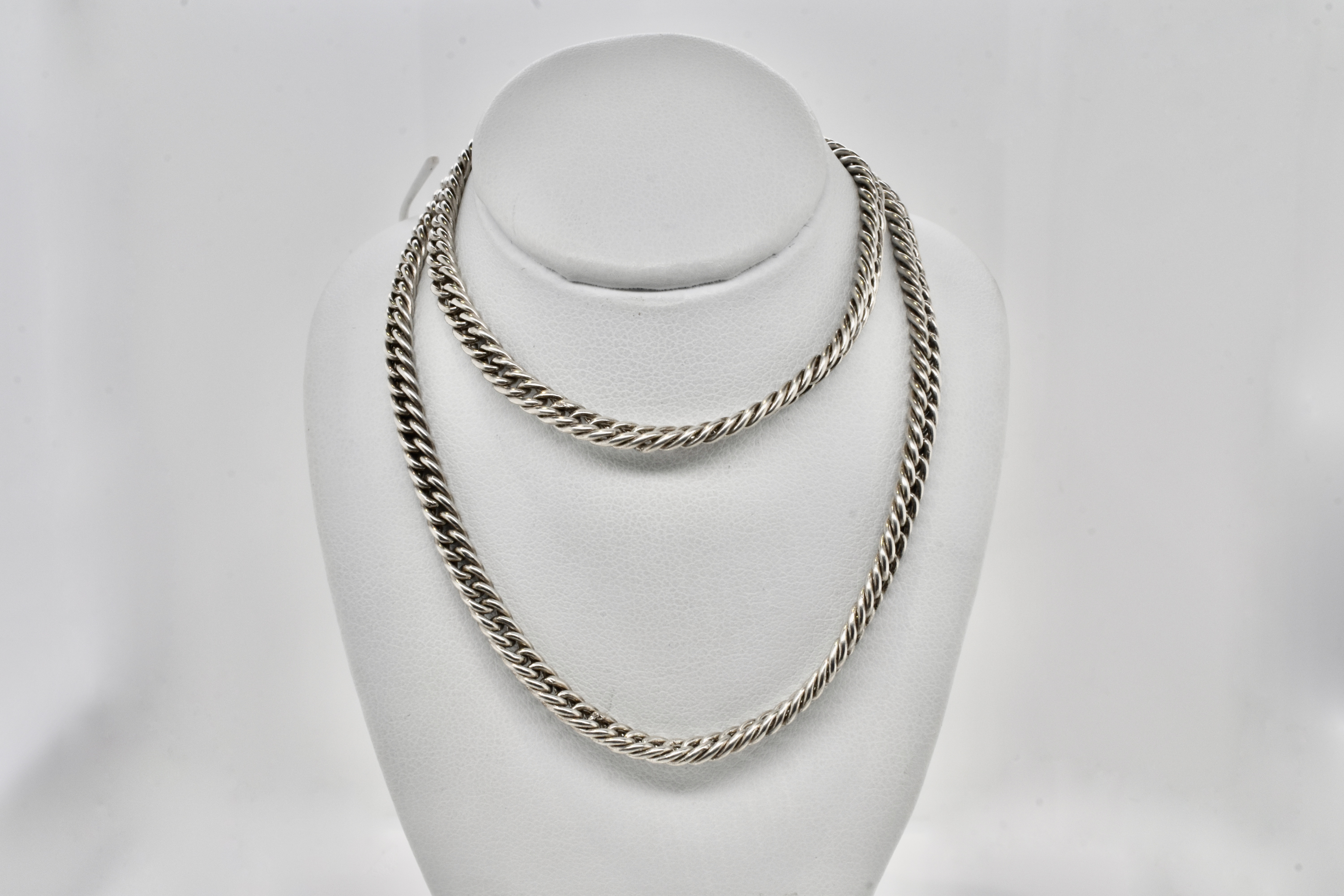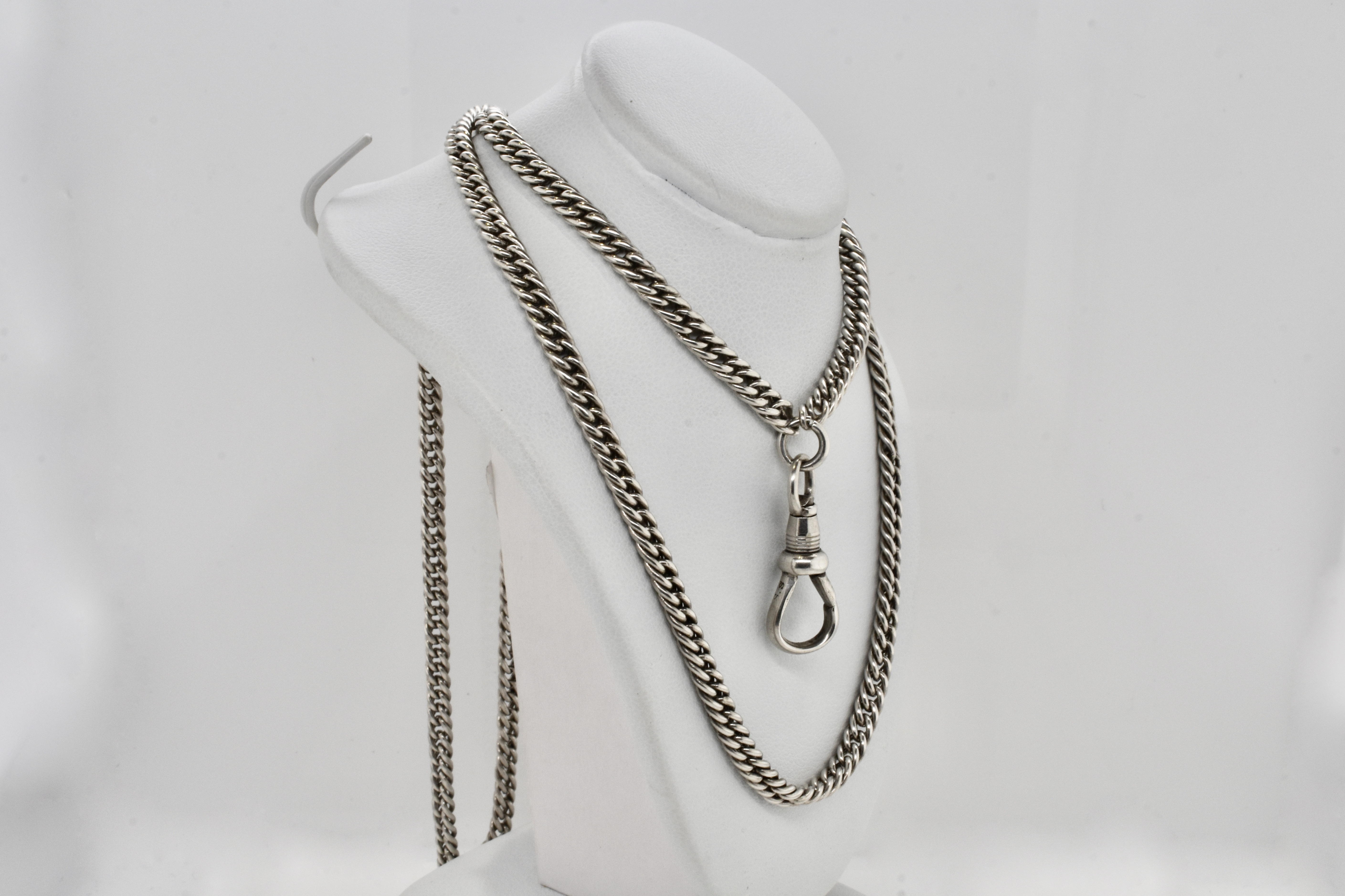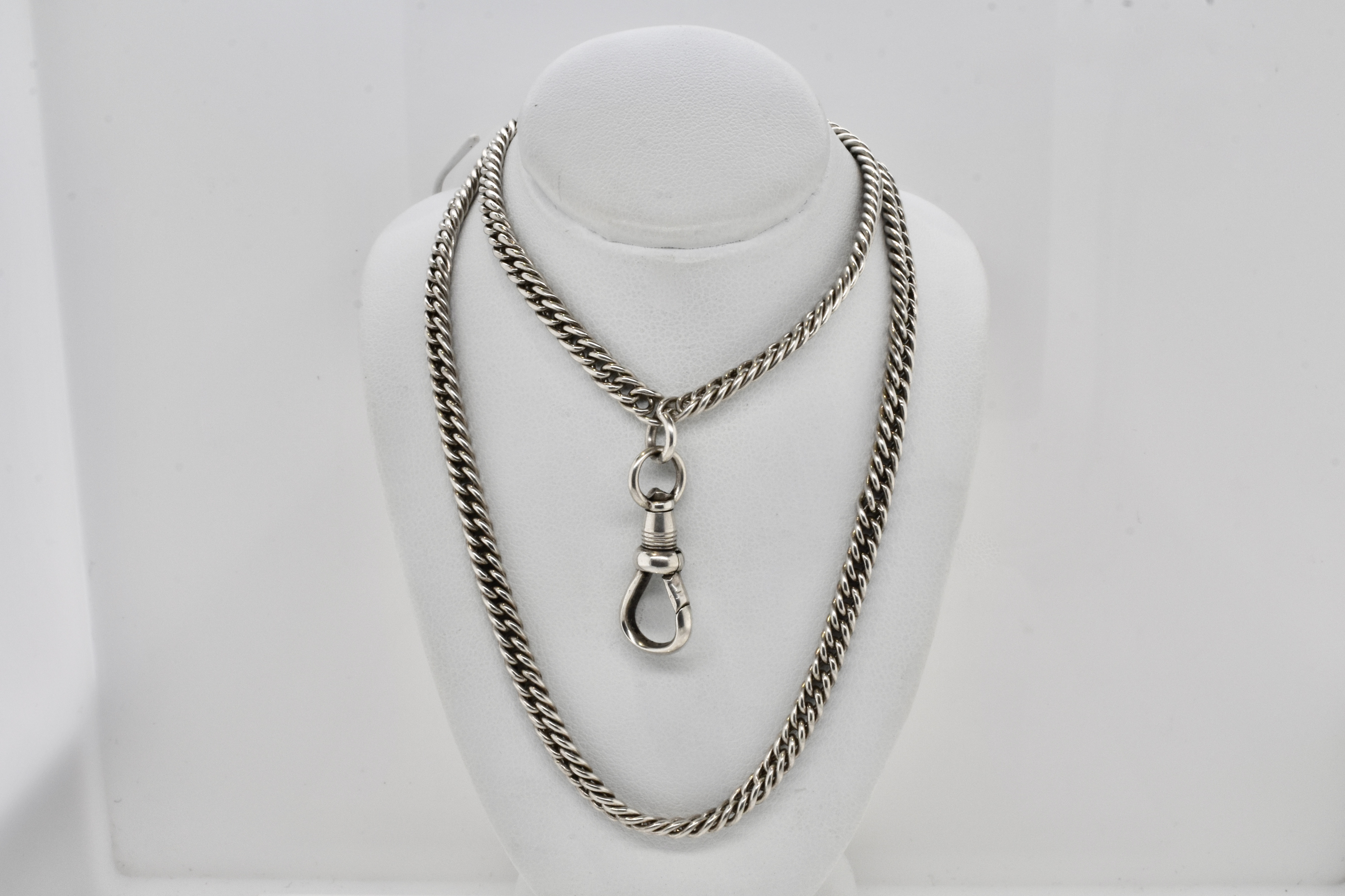 Dated circa 1900 this double curb link half length muff chain has been crafted in sterling silver and has a swivel clasp fixed at the centre. Length is 73cm. Independent Valuation Supplied