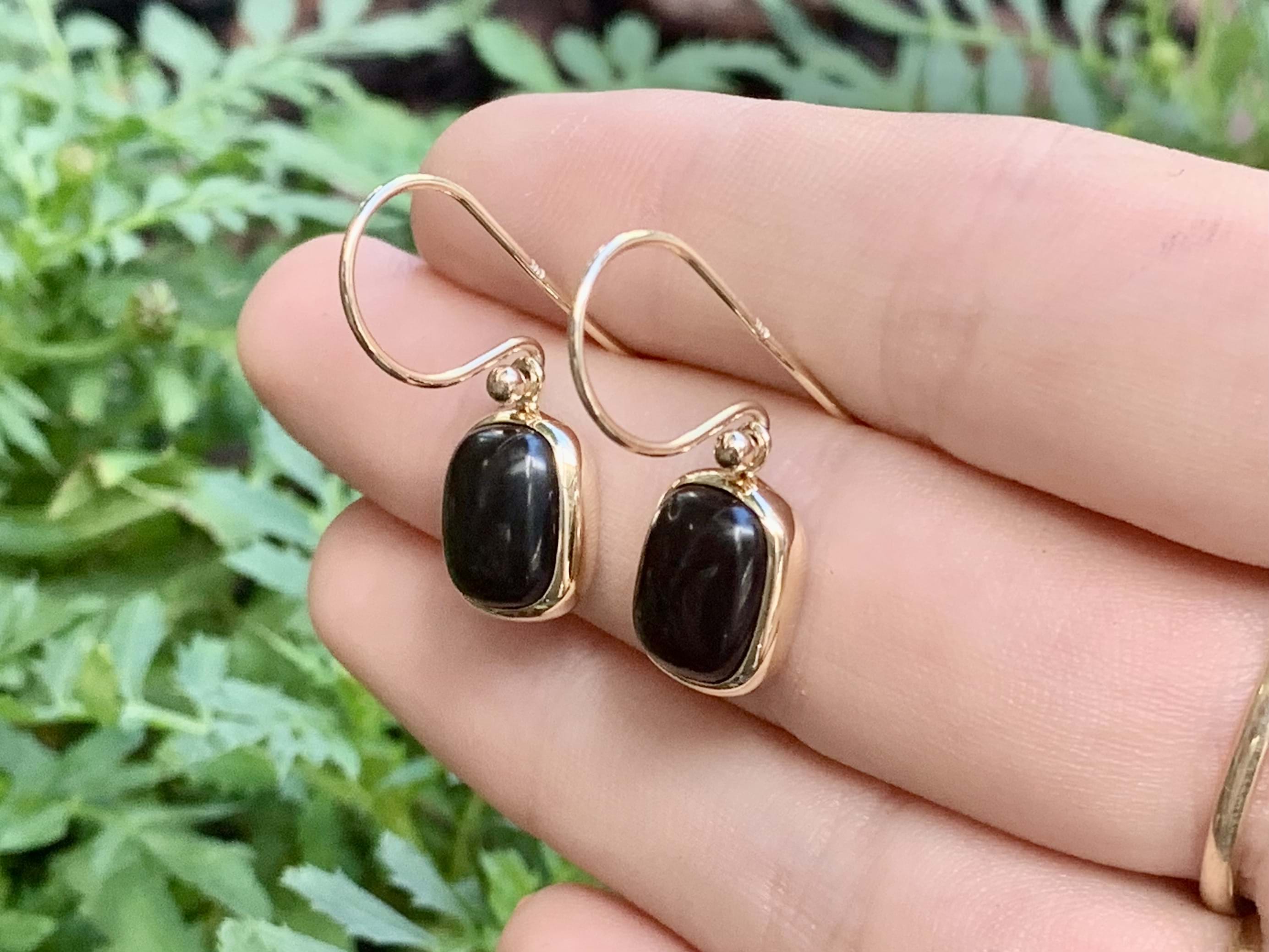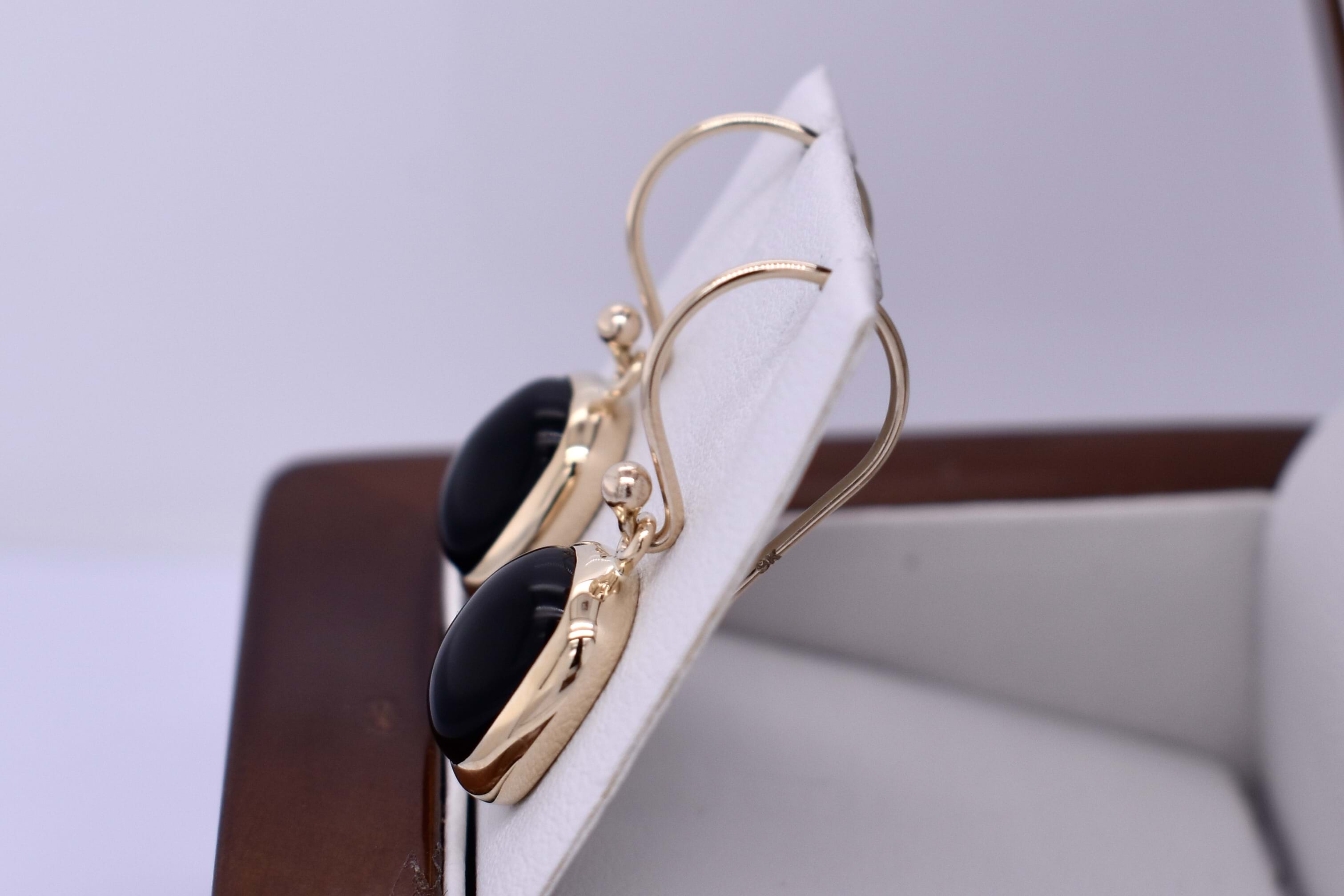 Crafted in 9ct yellow gold, these classic and elegant black onyx drops measure 11.5x9.5mm and are cushion cut. Bezel set with shepherd hook fittings.
