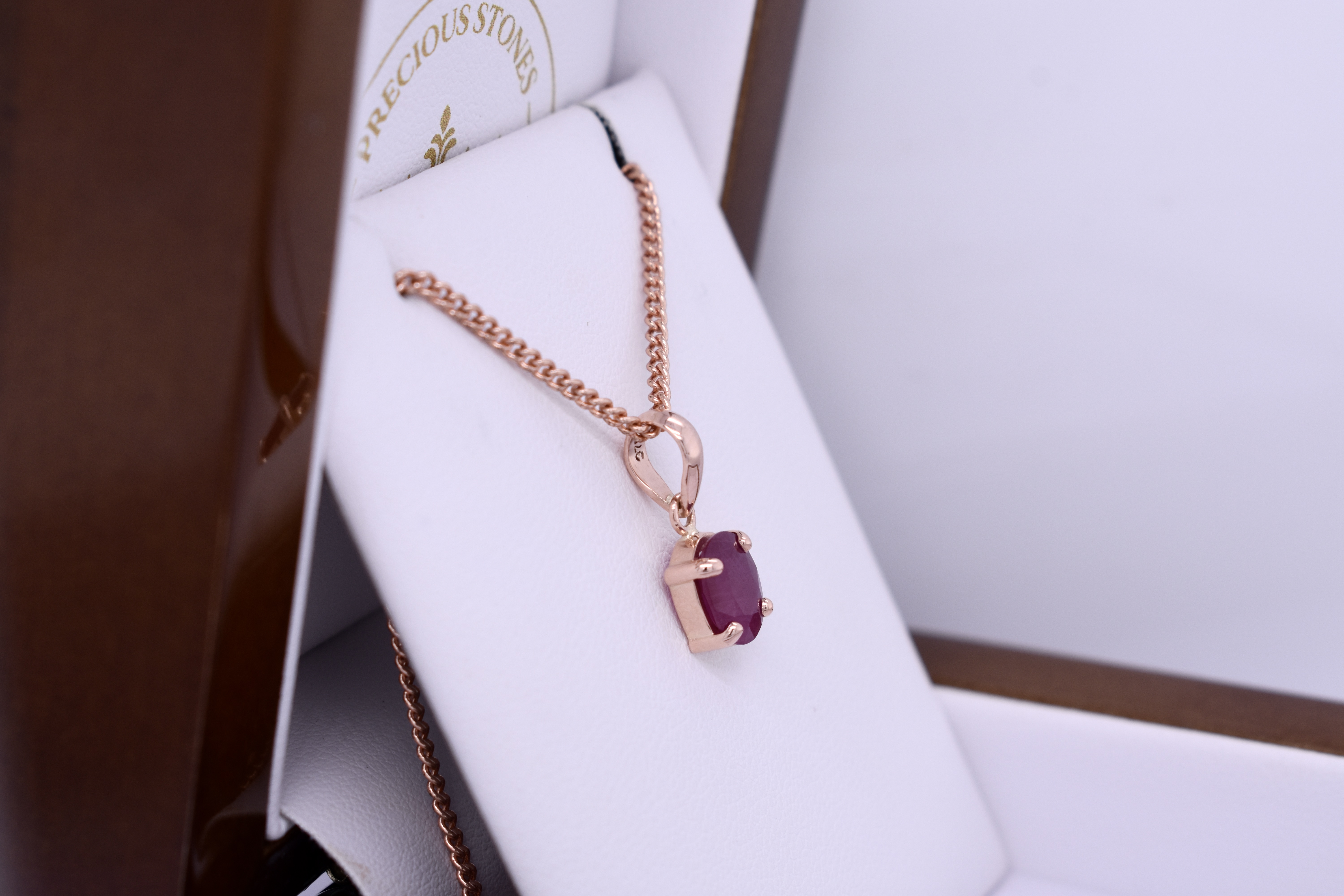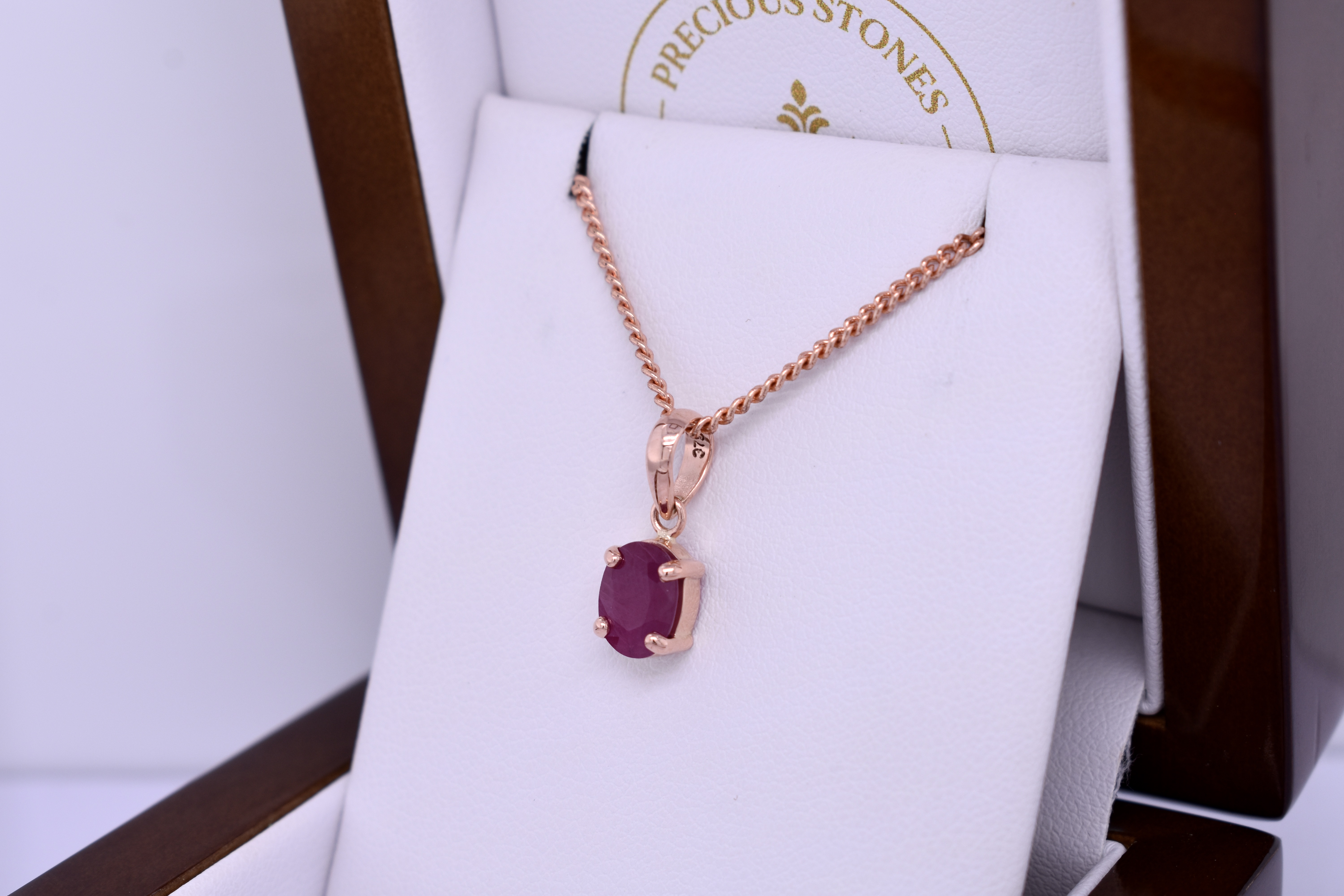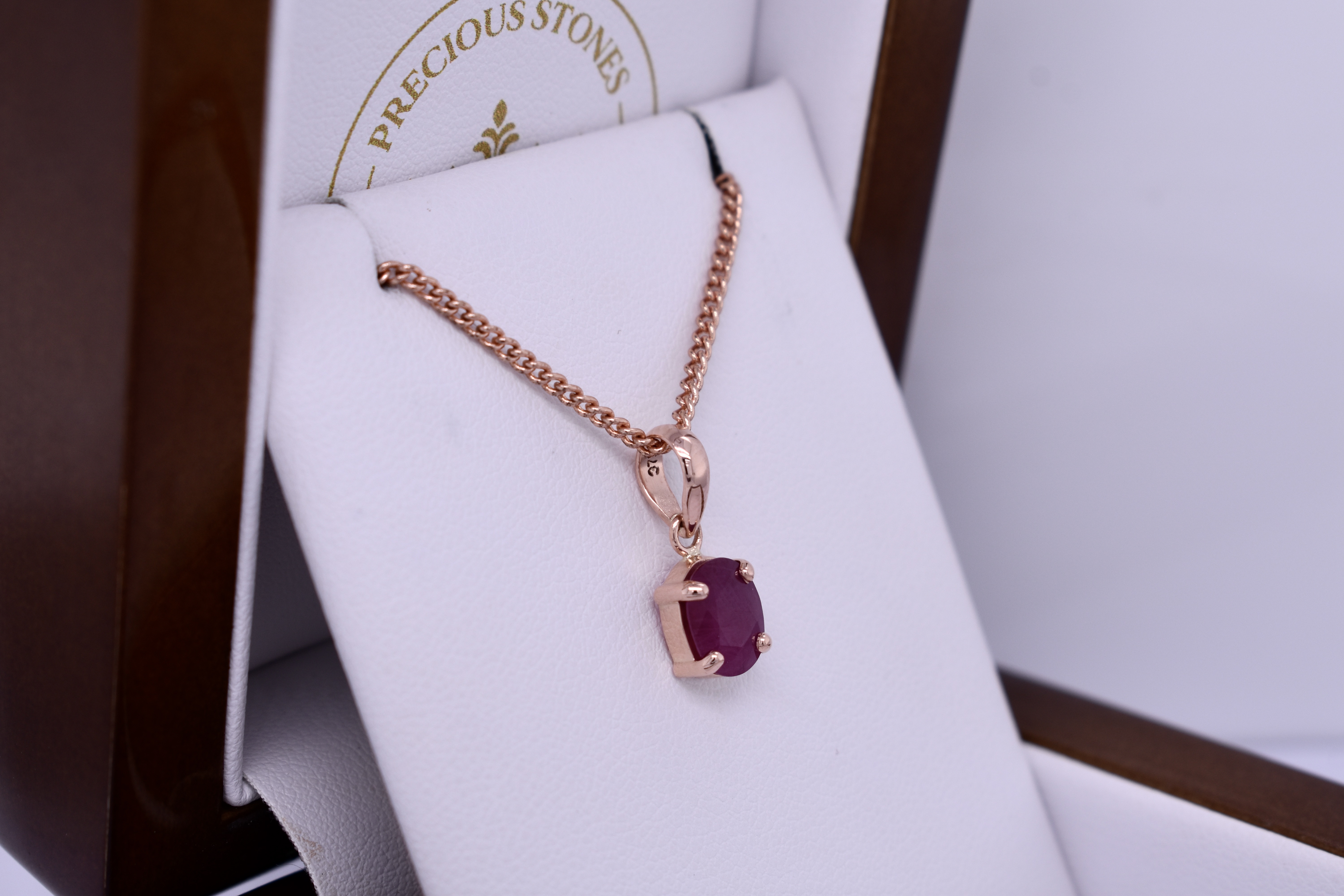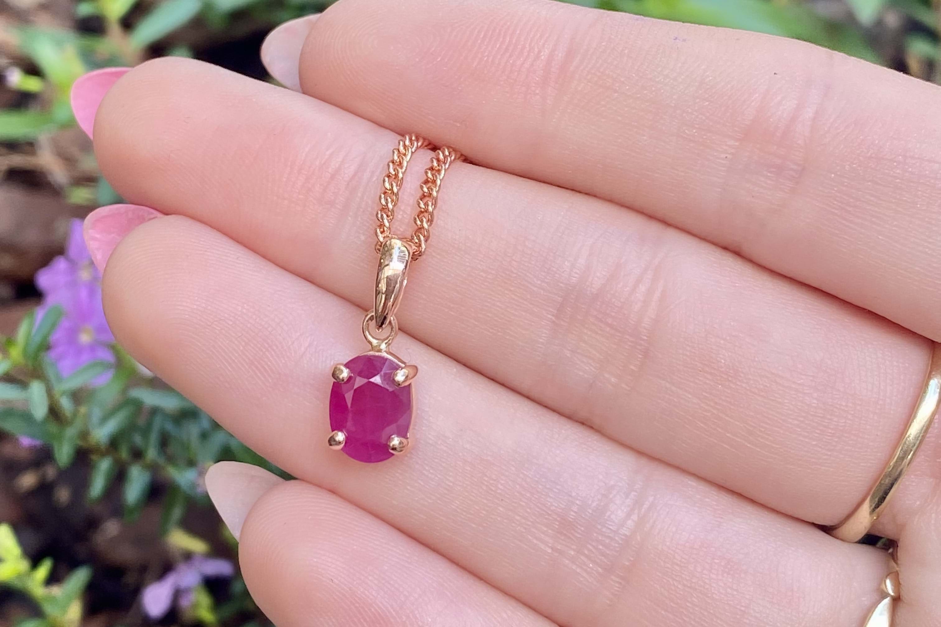 This simple yet stunning pendant features an oval ruby measuring approx. 9.1x6.2mm, four claw set into a handmade 9ct rose gold setting. Finished with a plain bale. Chains are available for separate purchase. Photographed in natural light with matching earrings.