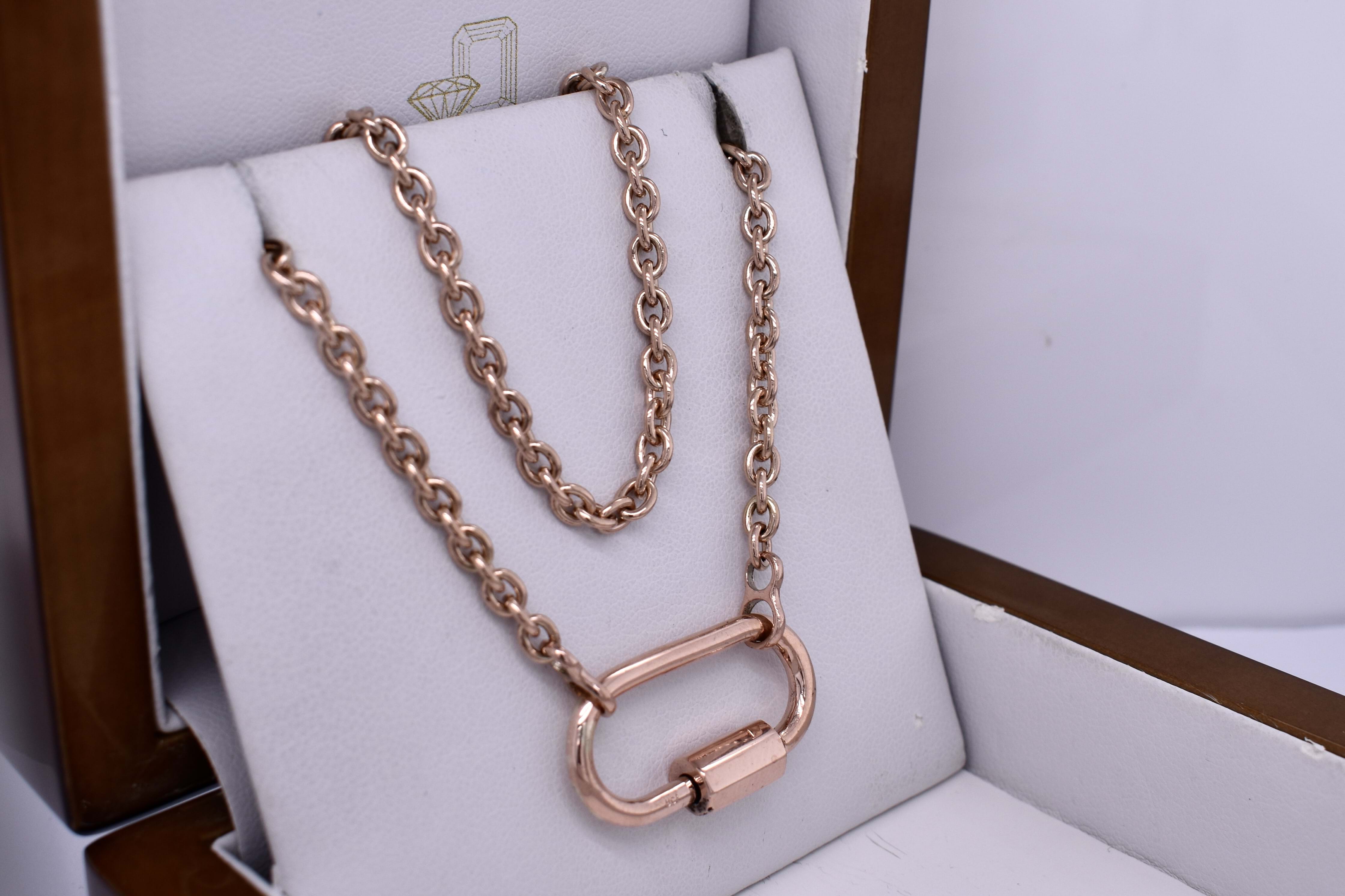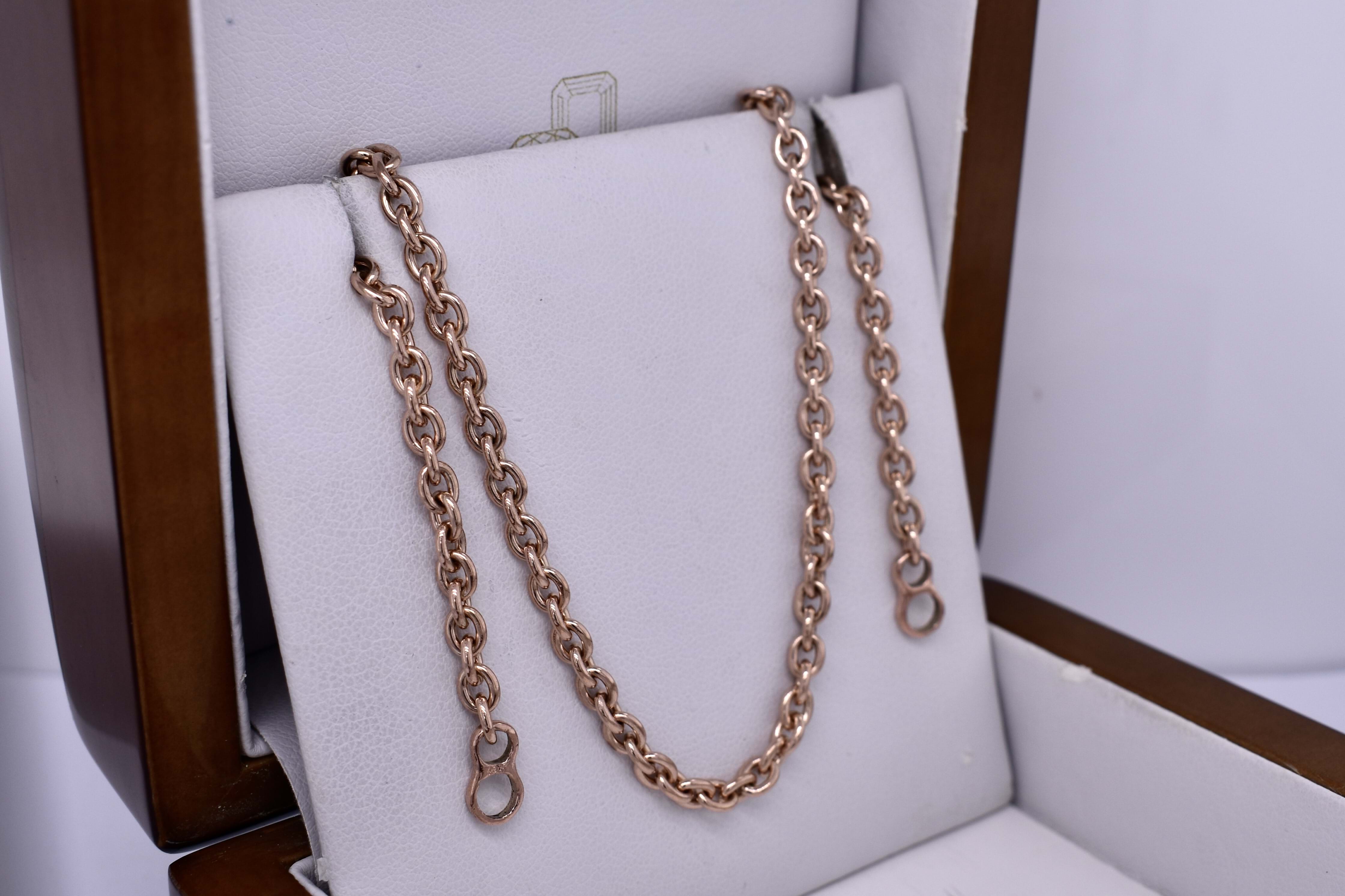 This simple but stunning chain was handmade by our goldsmith in 9ct rose gold in a cable link, and is finished with snowmen loop ends. It measures 43cm and weighs 14.7grams. The chain works perfectly with a carabiner or a clasp of your choice.