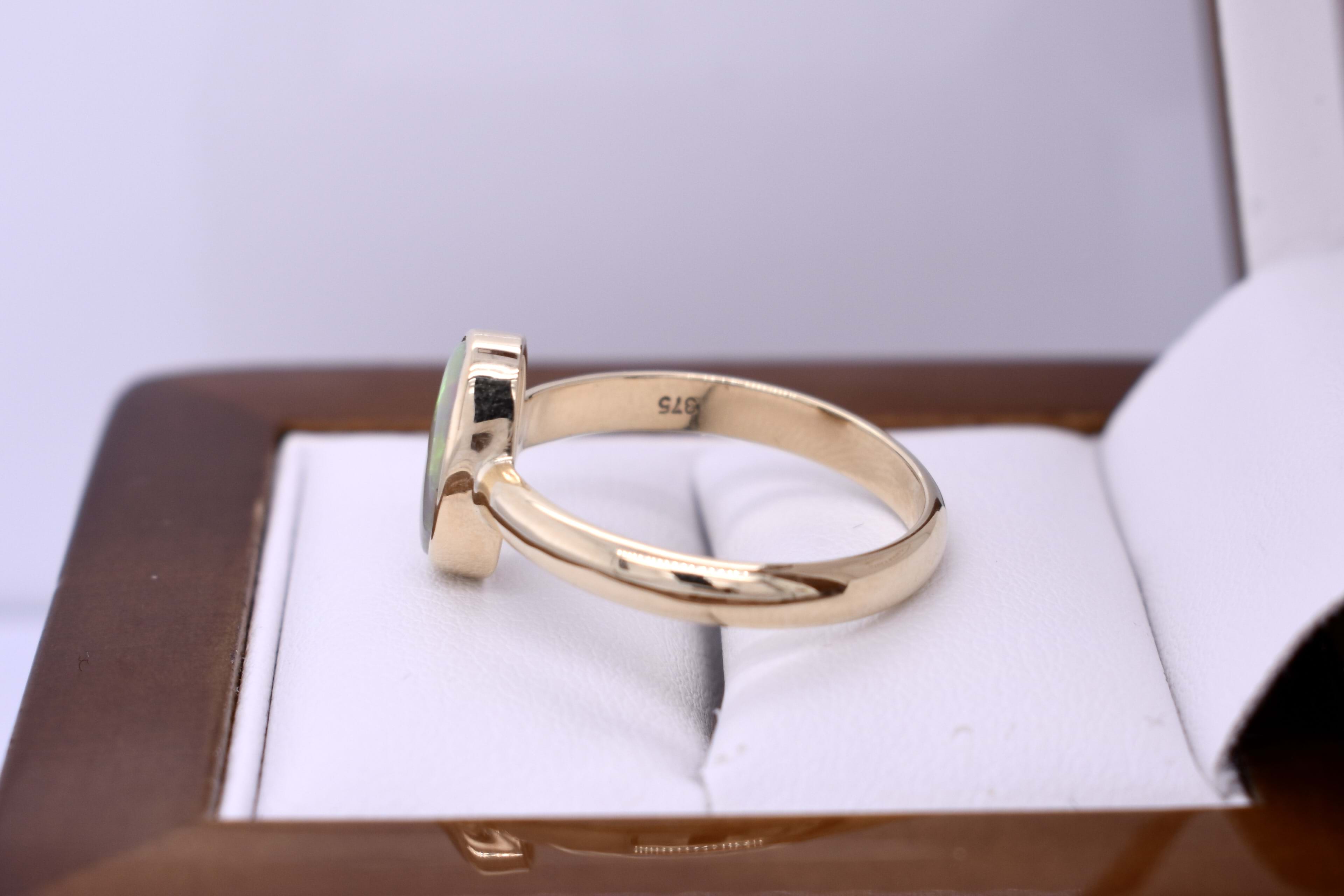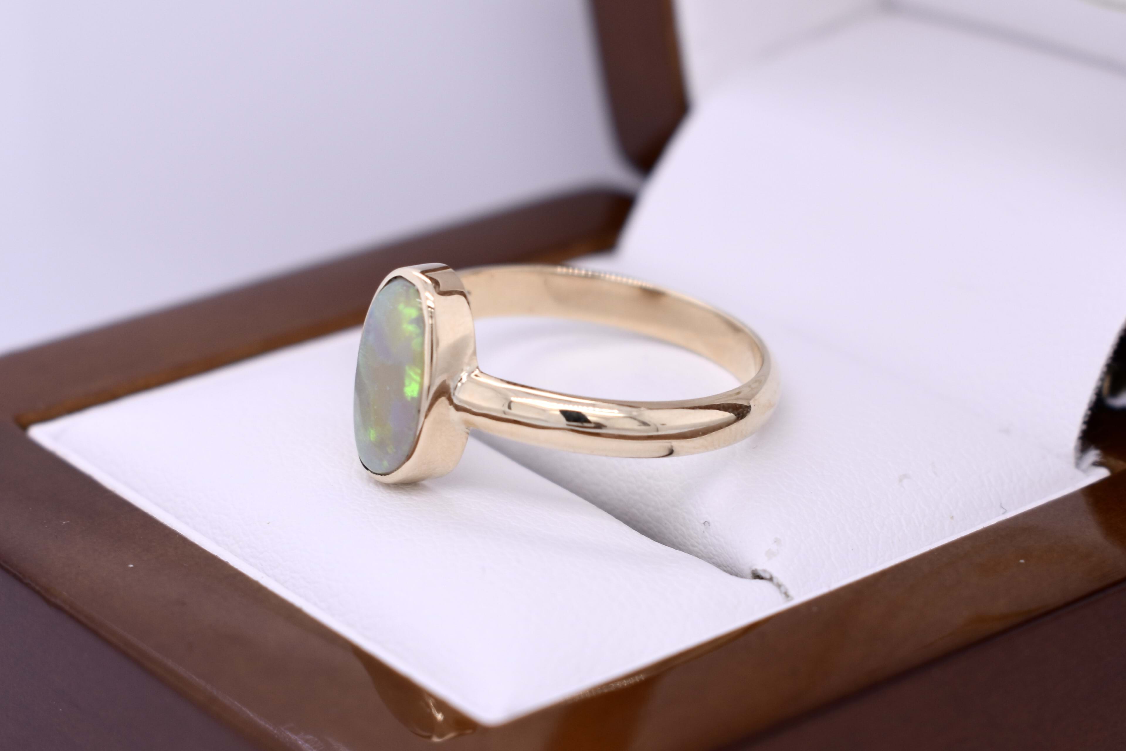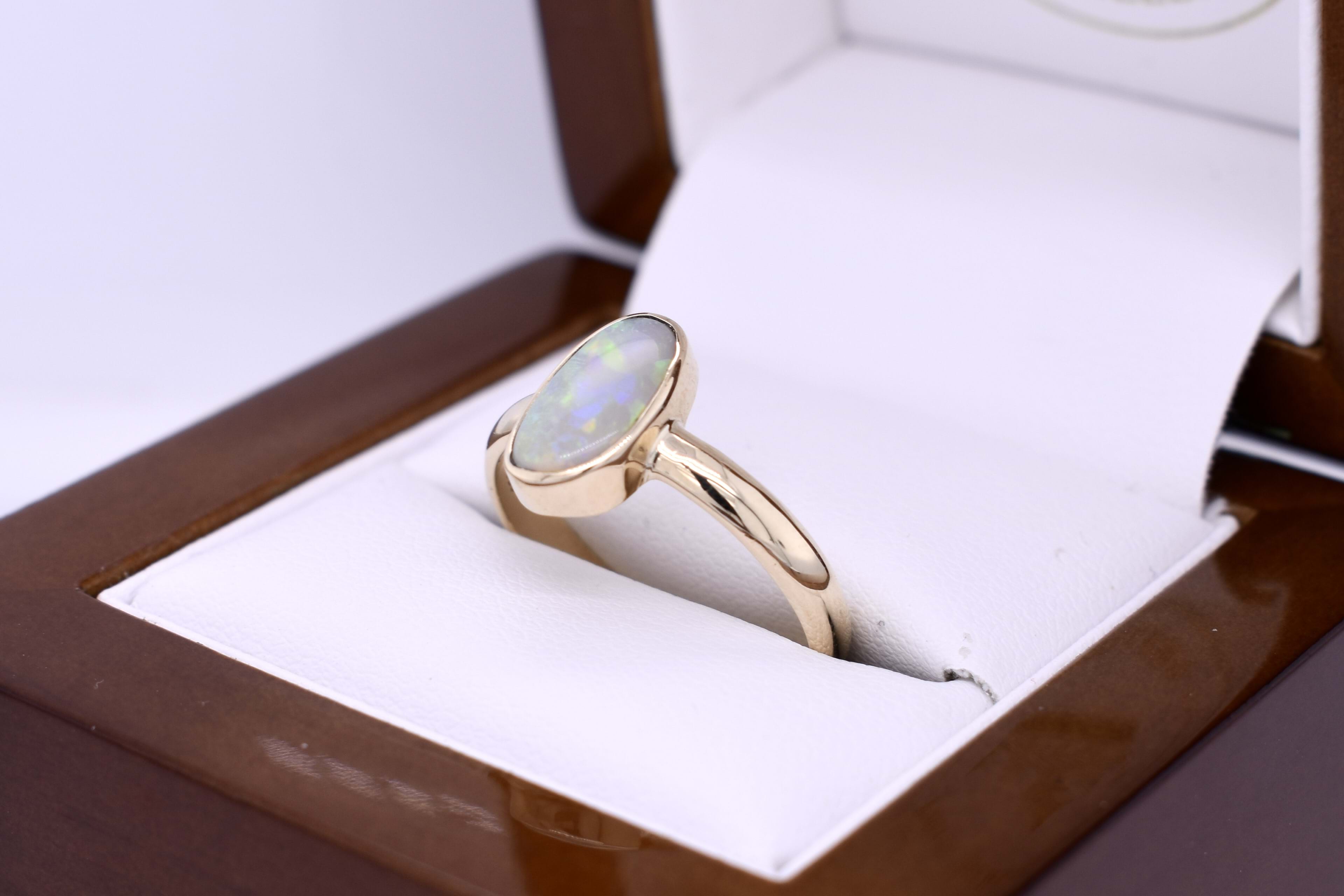 Crafted in 9ct yellow gold, this stunning bezel set freeform opal ring from Lightning Ridge, measuring 11.5x5.8x3.0mm. This solid opal weighs 1.09ct and is light bodied with green, orange and blue mixed pattern and rolling flashes throughout. Set on a plain gold 3.0mm high domed band. Finger size Q. Independent Valuation Supplied.