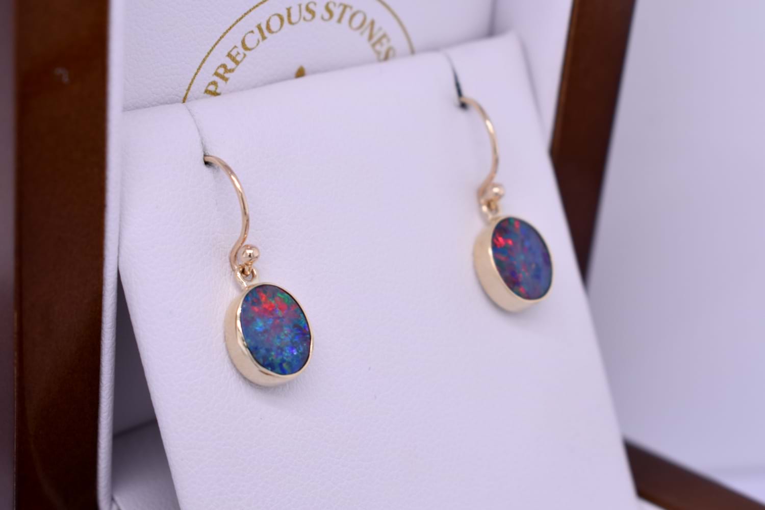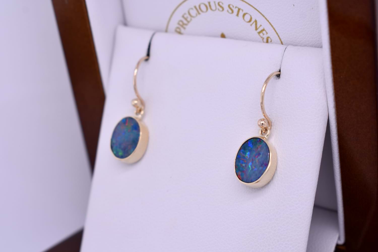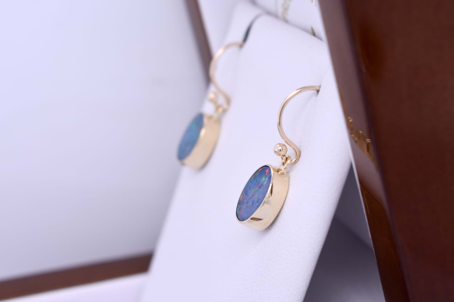 These appealing oval Coober Pedy opals measure approx. 10x8mm, and are bezel set into a handmade 9ct yellow gold setting. The opal is a doublet, with a boulder opal backing and has flashes of red, green and yellow throughout. Finished with shepherd hook fittings.