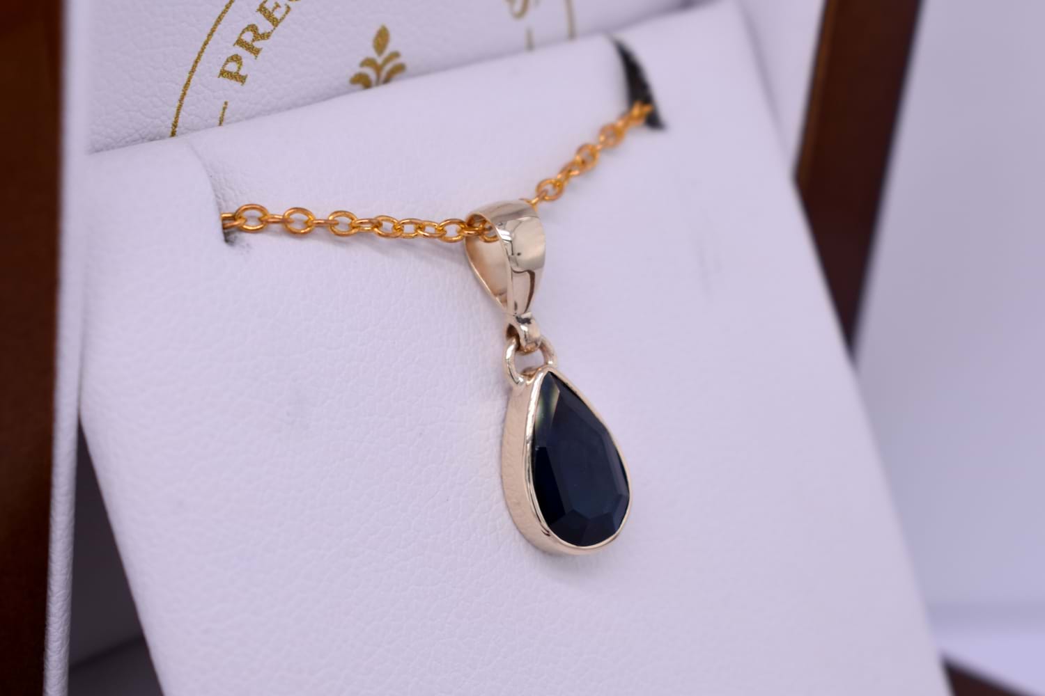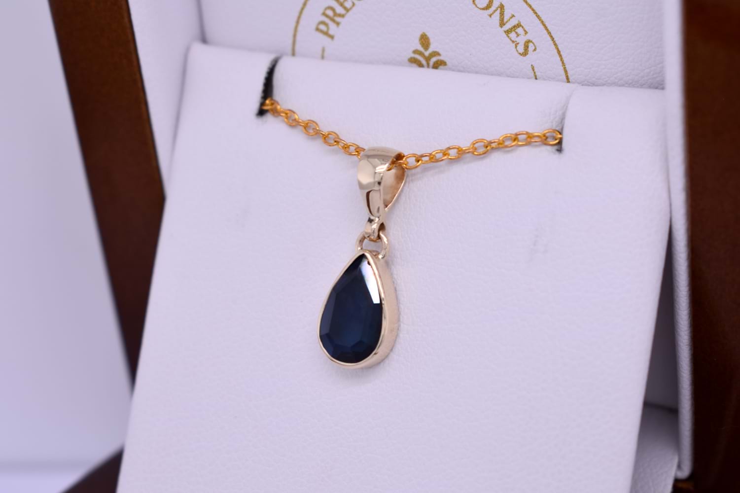 This pendant is handmade in 9ct yellow gold and it features an unheated Australian blue sapphire. The pearshape sapphire is bezel set and measures approx. 11.35x7.5mm. Finished with a plain bale. Chains are available for separate purchase.